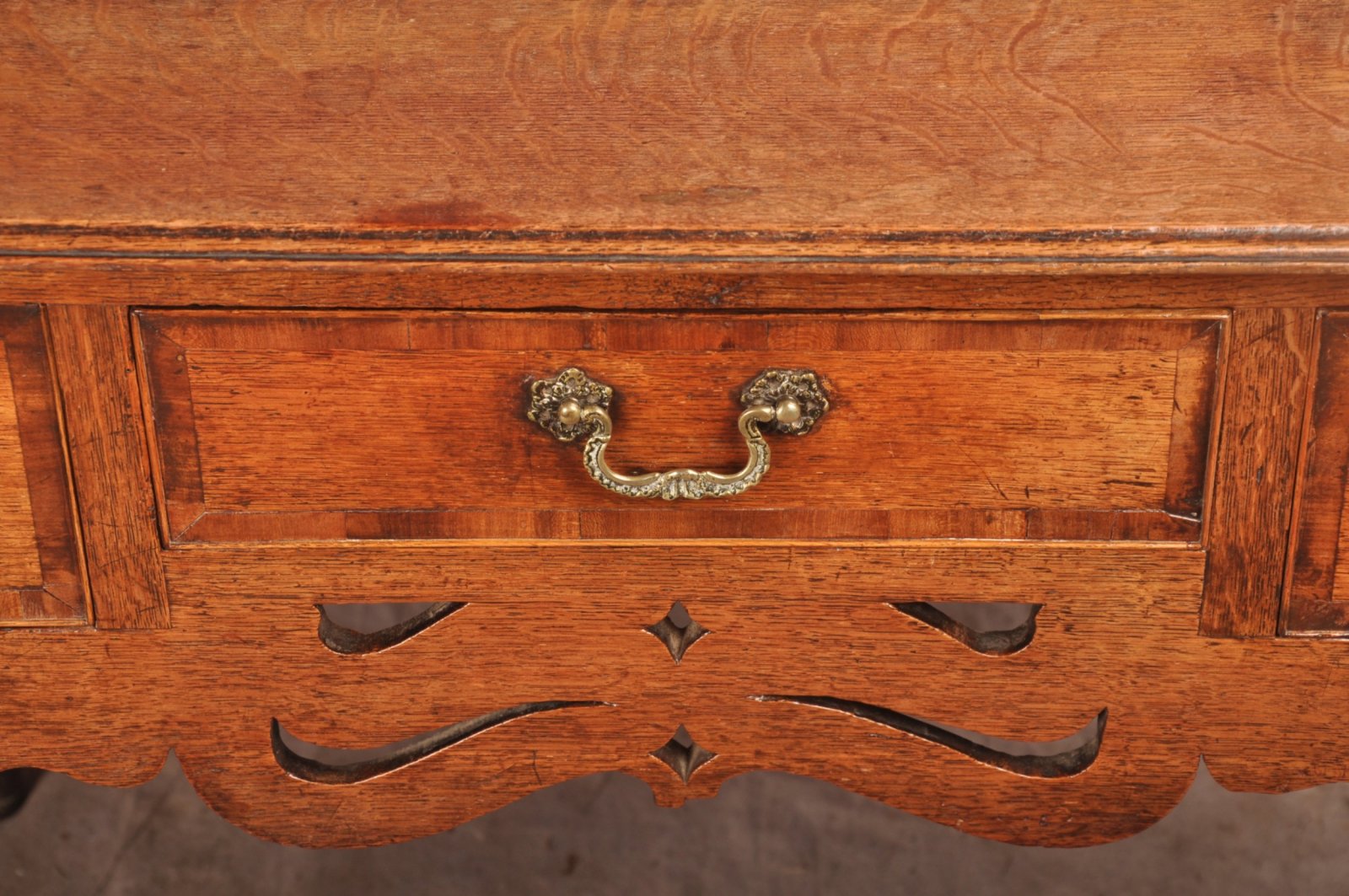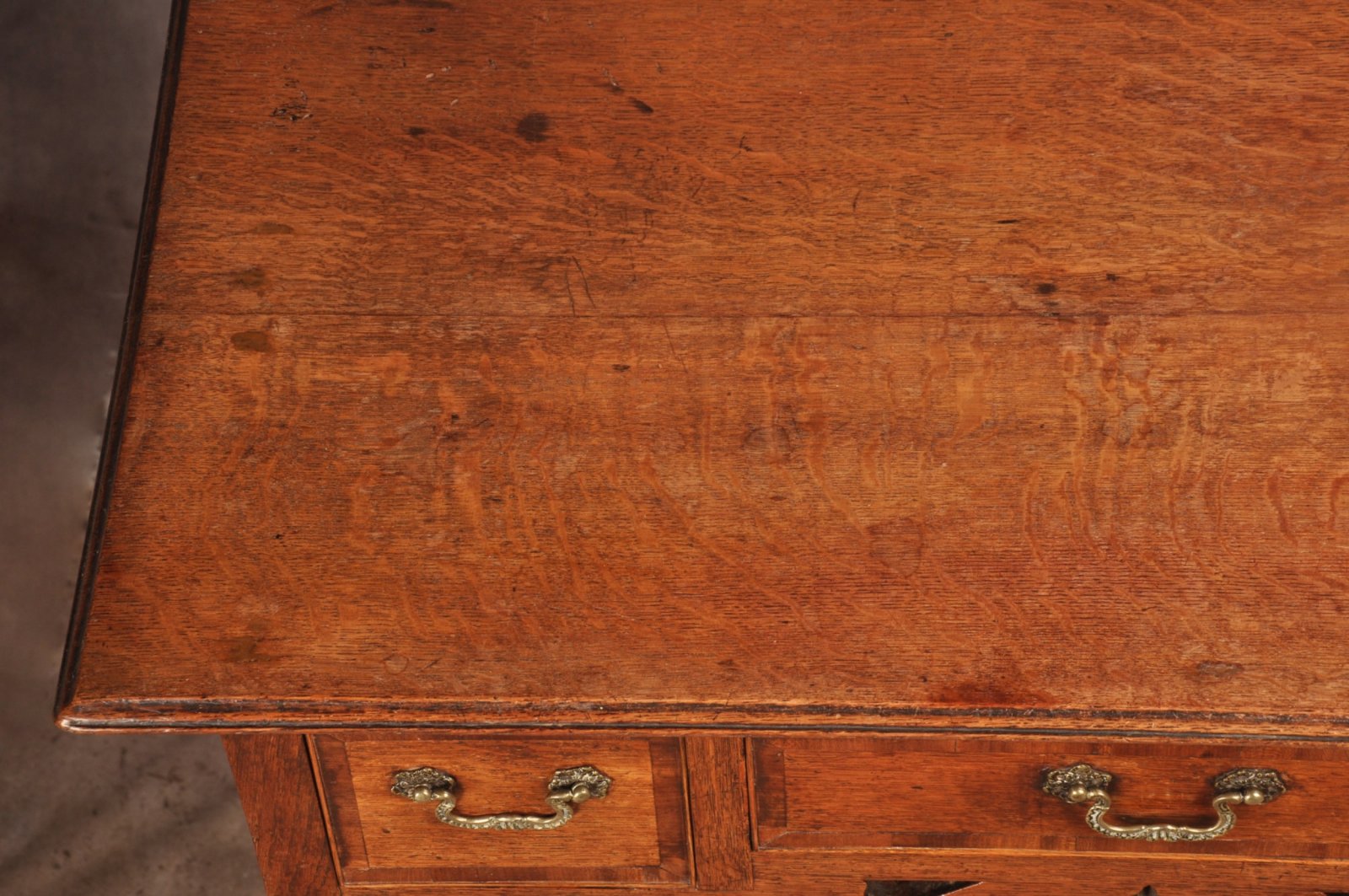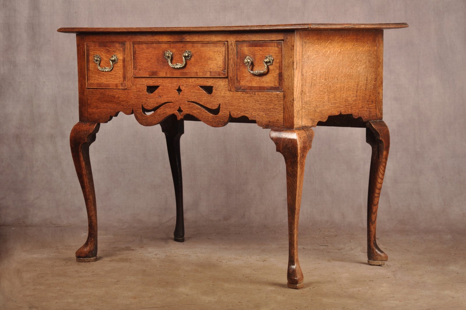 See shipping detailsA beautiful and elegant mid 18th Century Oak Lowboy of glowing light Oak colour and patina. Having the original decorated rococo handles apart from one replacment drop. The well figured top with caddy mould to the edge, drawer fronts with Mahogany cross grain banding and fret work frieze nicely shaped and pierced. Standing on wonderfully shaped cabriole legs with carved slipper foot, having lost no hight with the full pad to the base remaining in place.