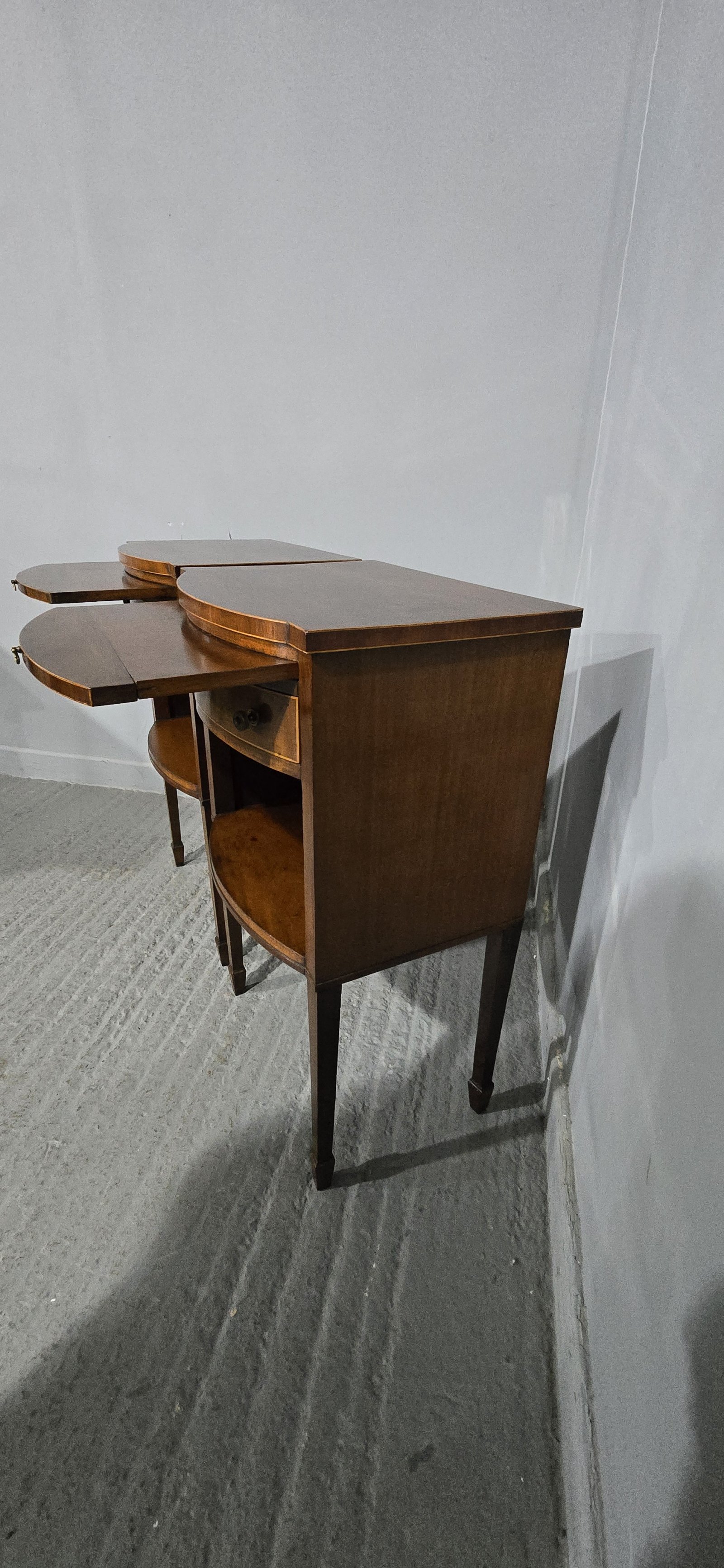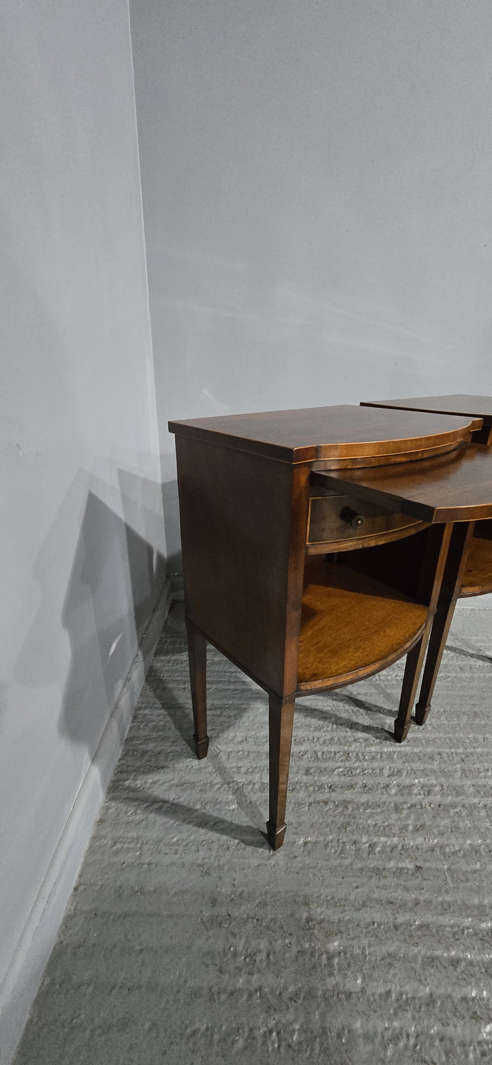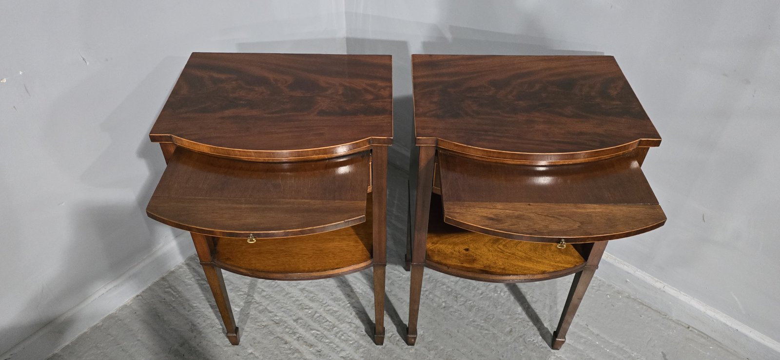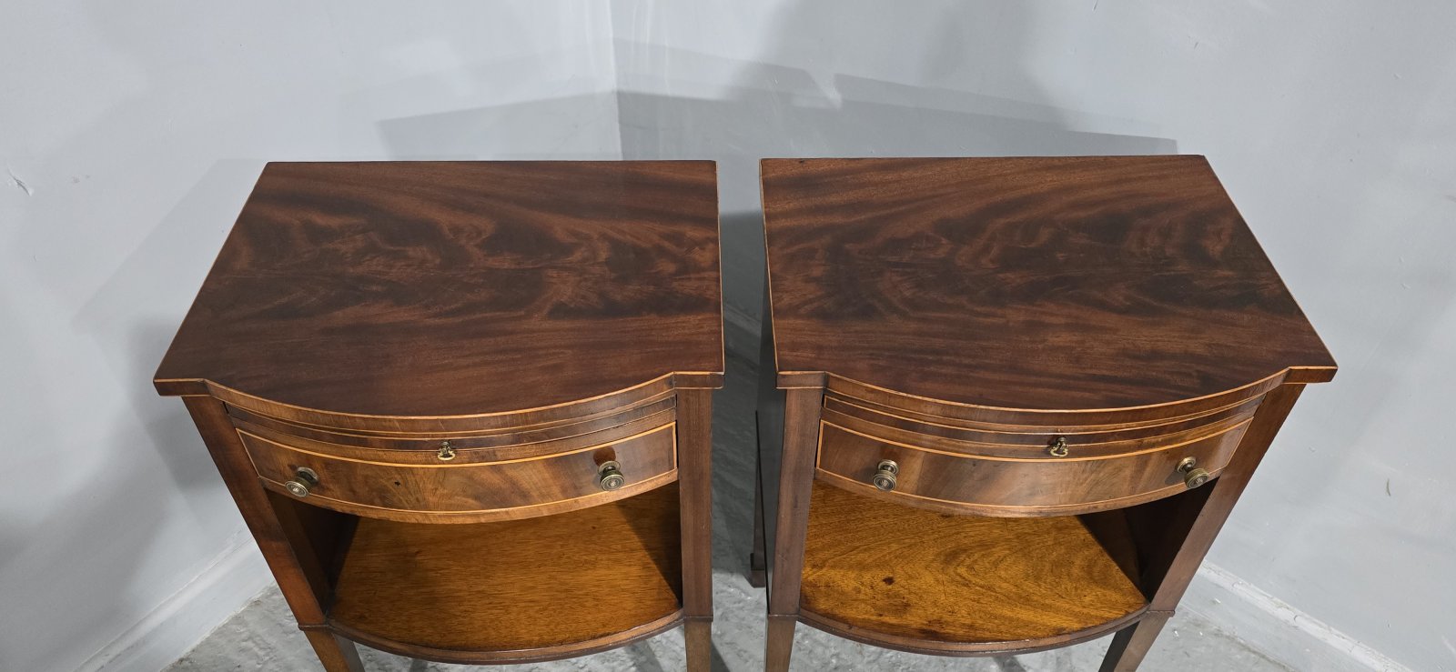 Top quality pair of English mahogany inlaid bedside lamp cabinets,bow fronted with singl slide and single drawer, in very good order throughout.