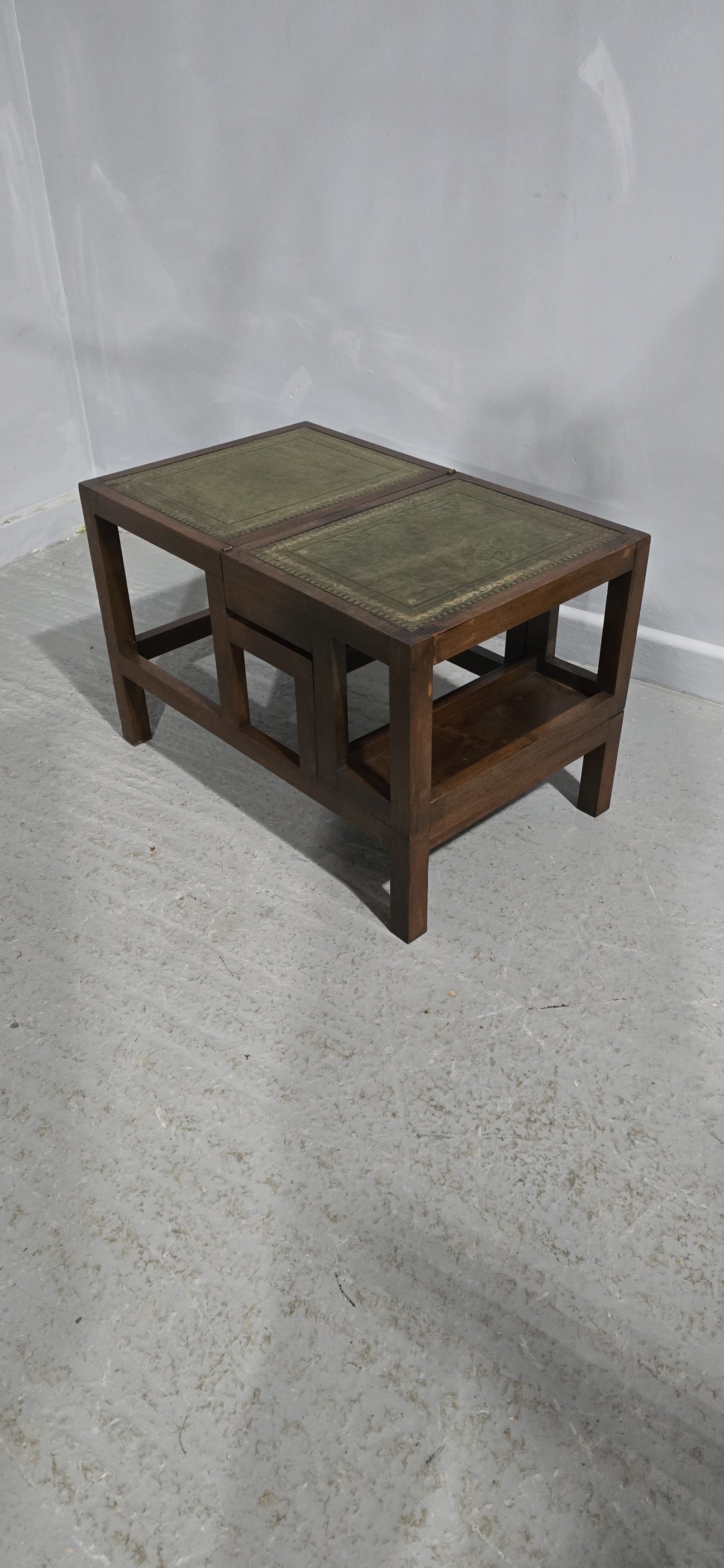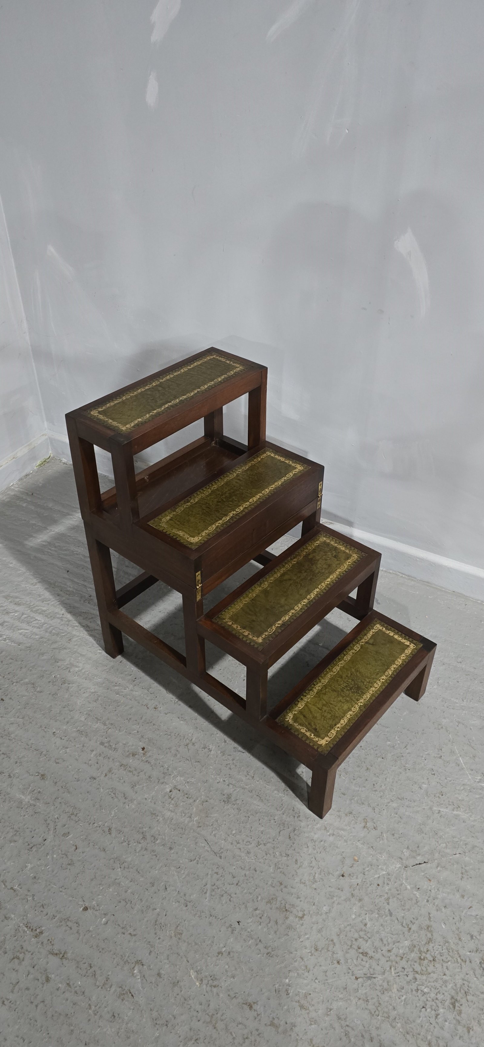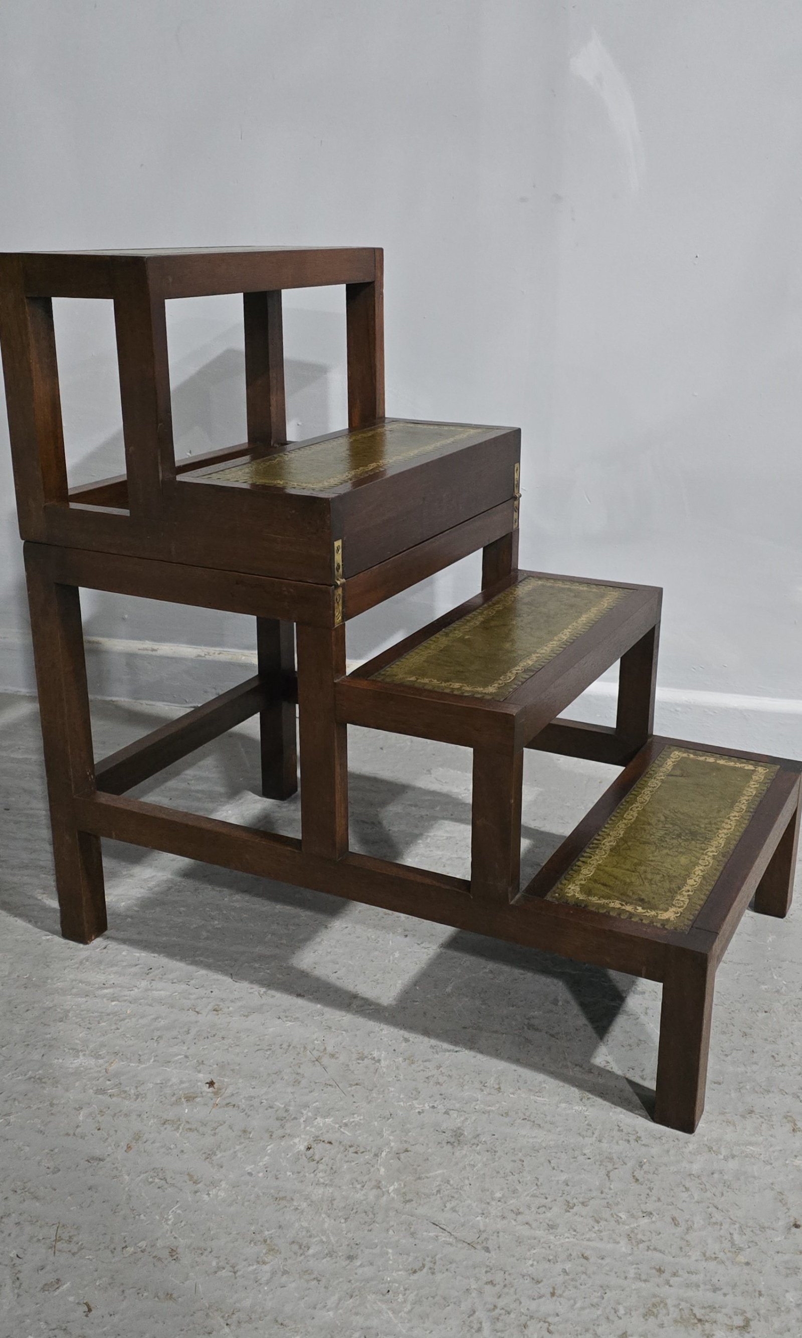 A very nice pair of mahogany library steps with leather treads, folds over to make a single step or small table, very good overall condition.