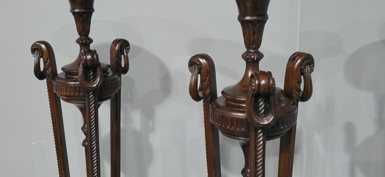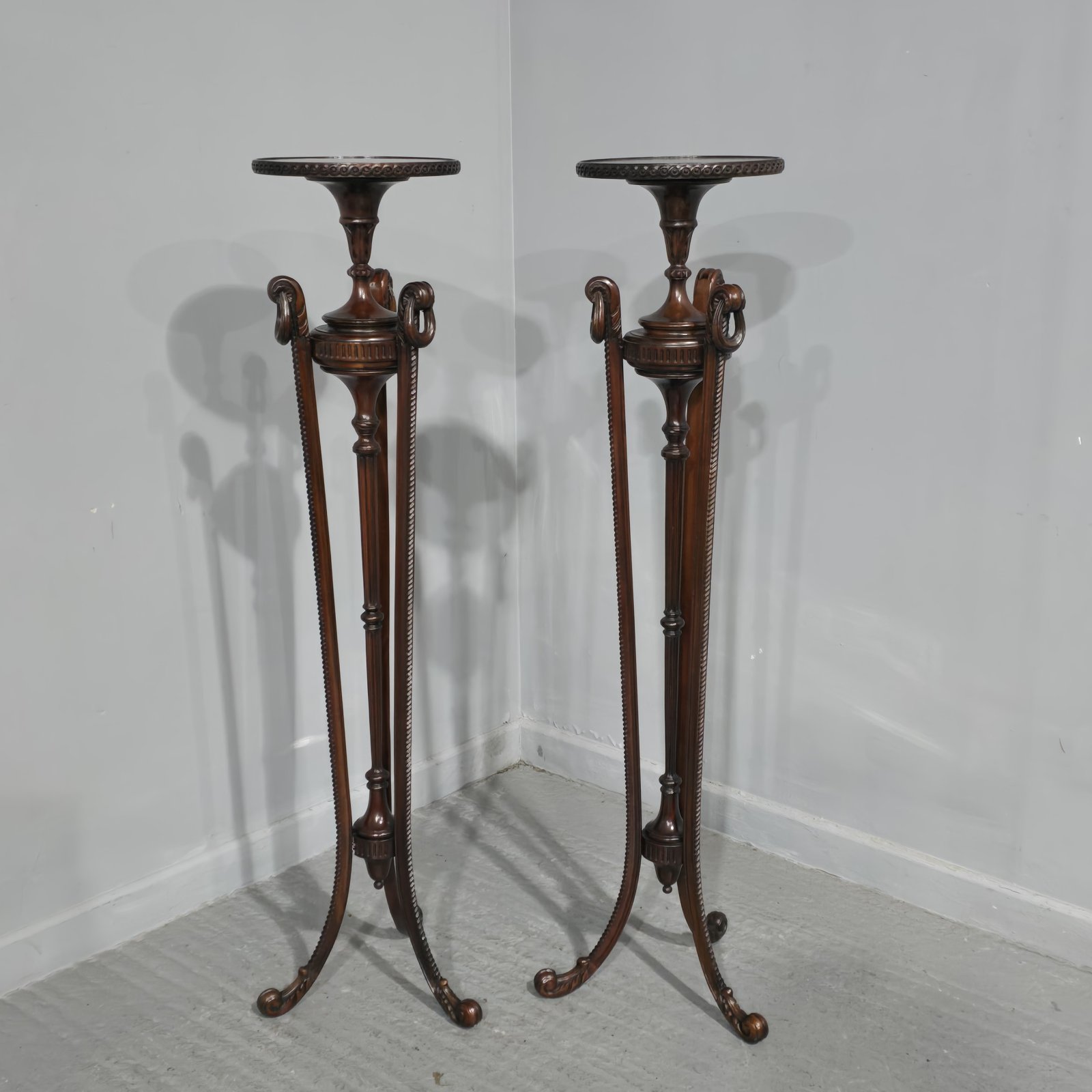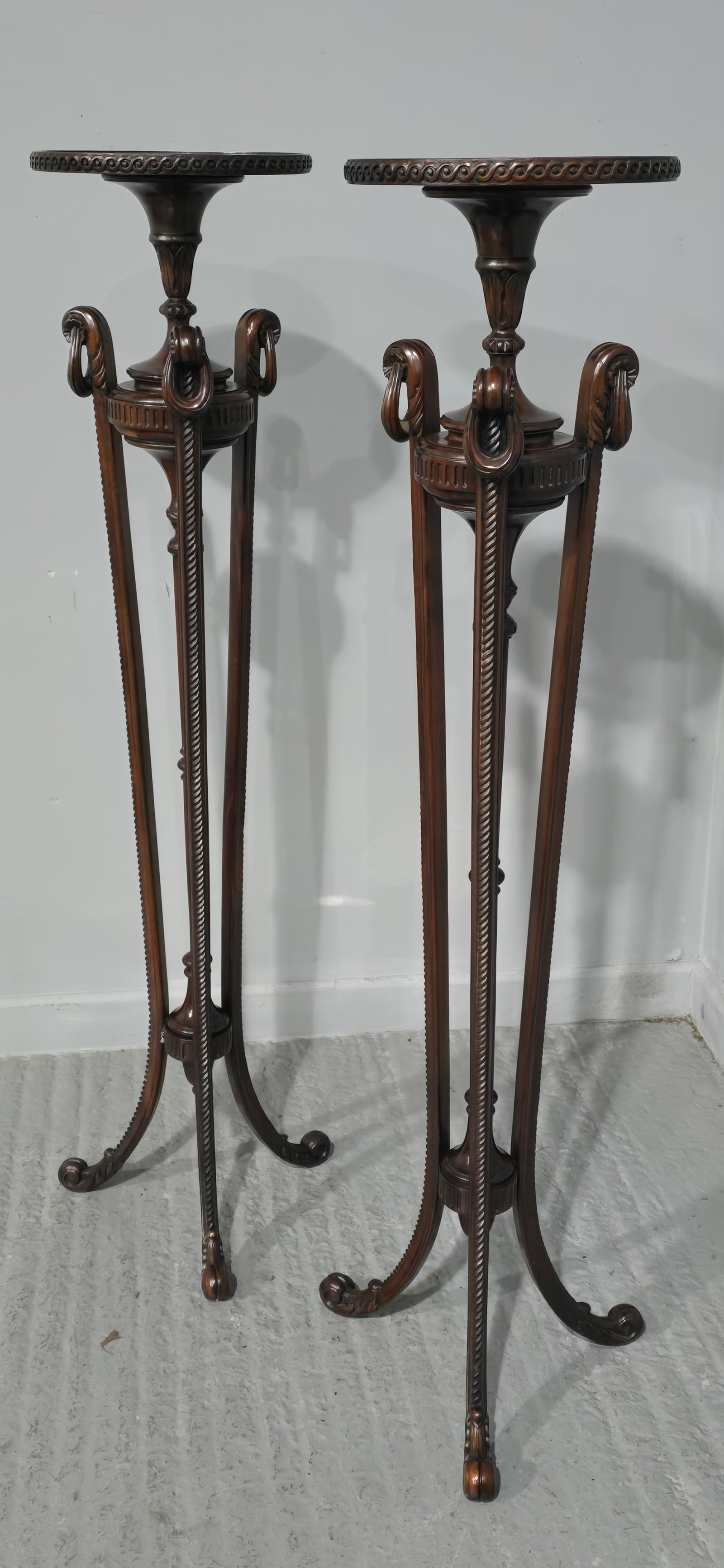 A fine air of mahogany pedestal/torchere stands, with very crisp carvings and in wonderful original condition.