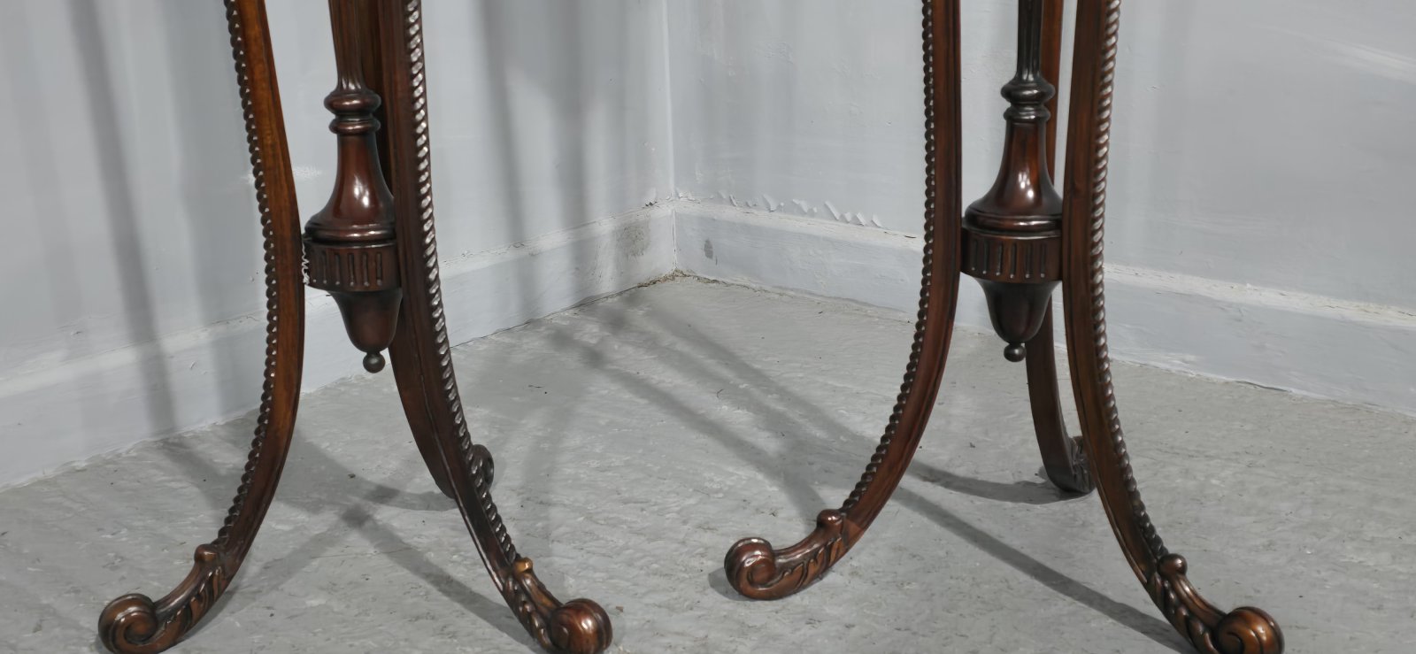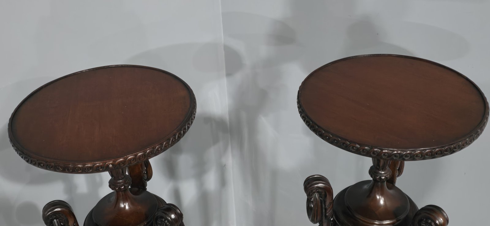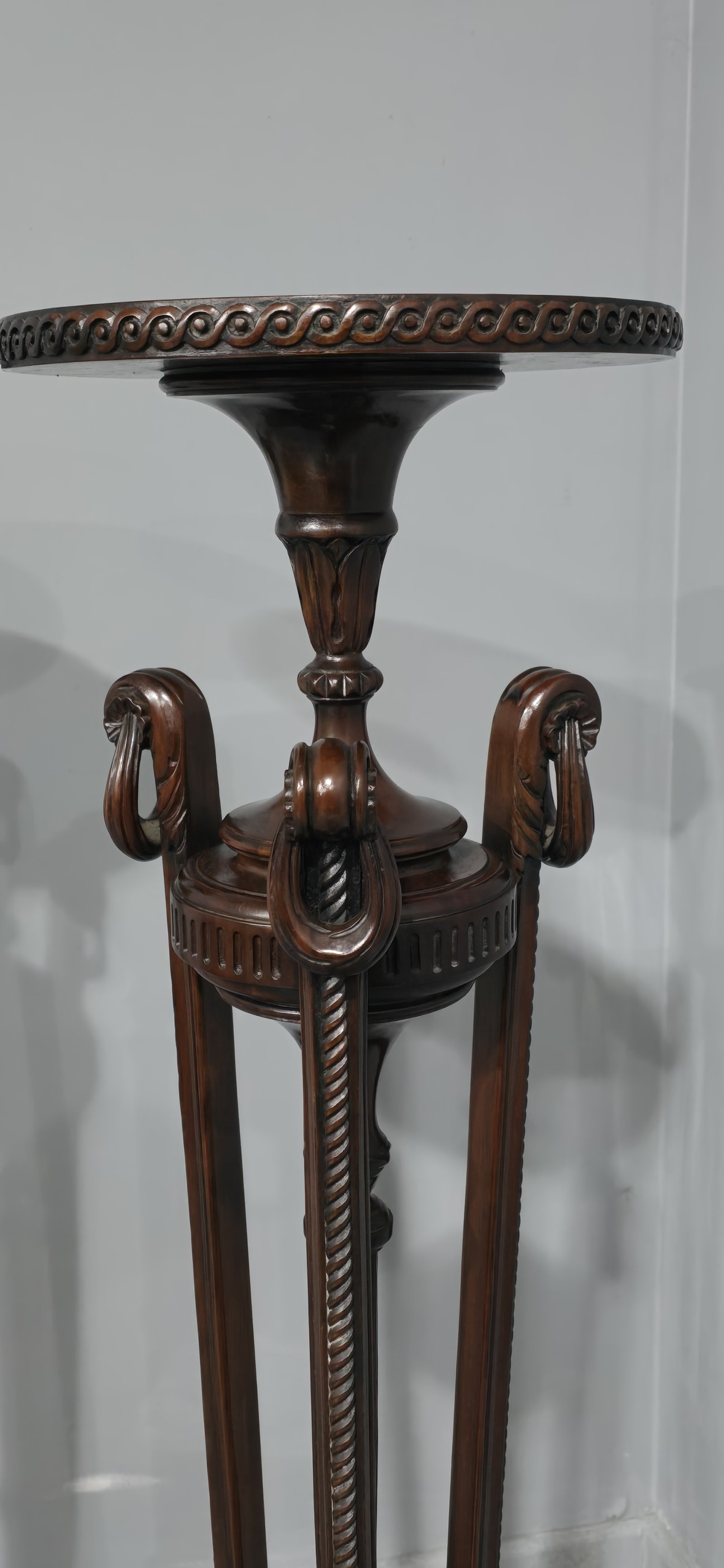 A fine air of mahogany pedestal/torchere stands, with very crisp carvings and in wonderful original condition.