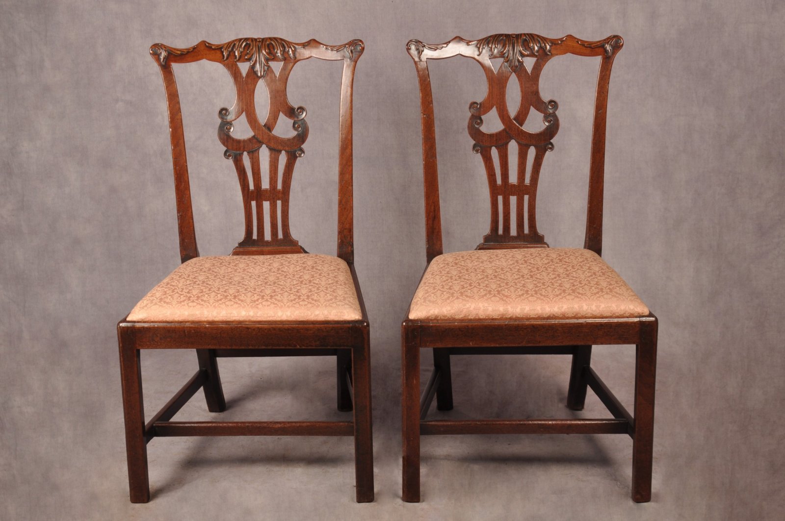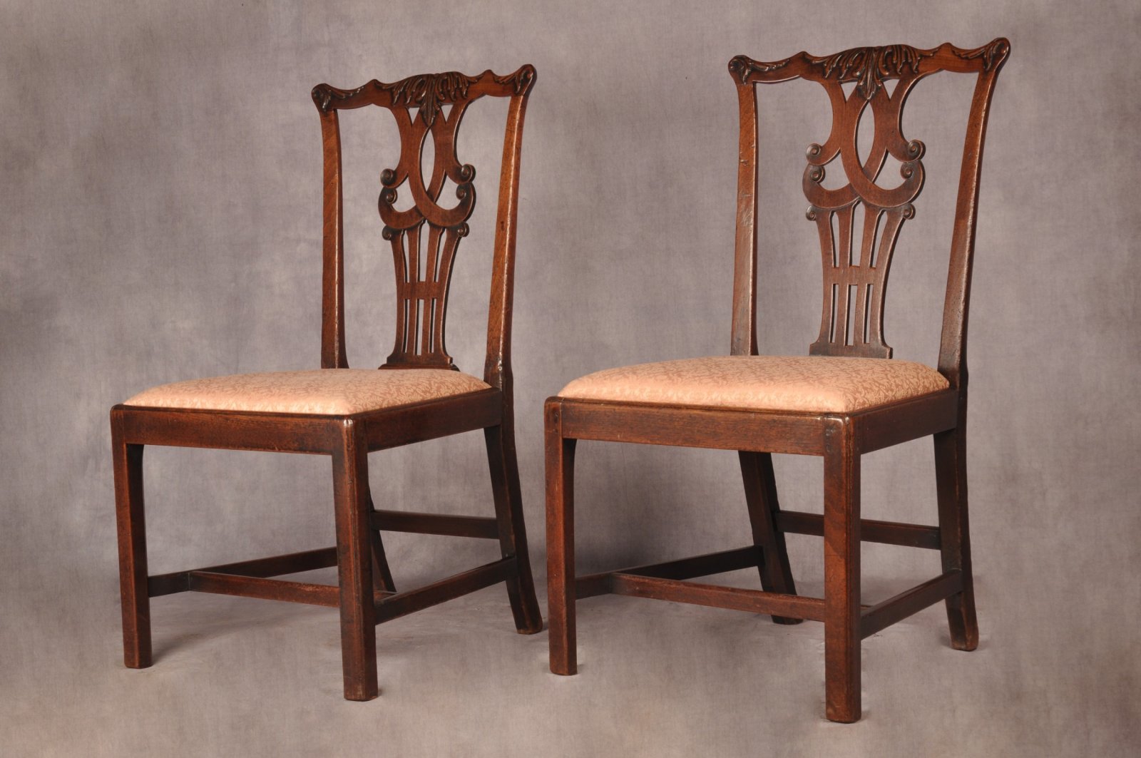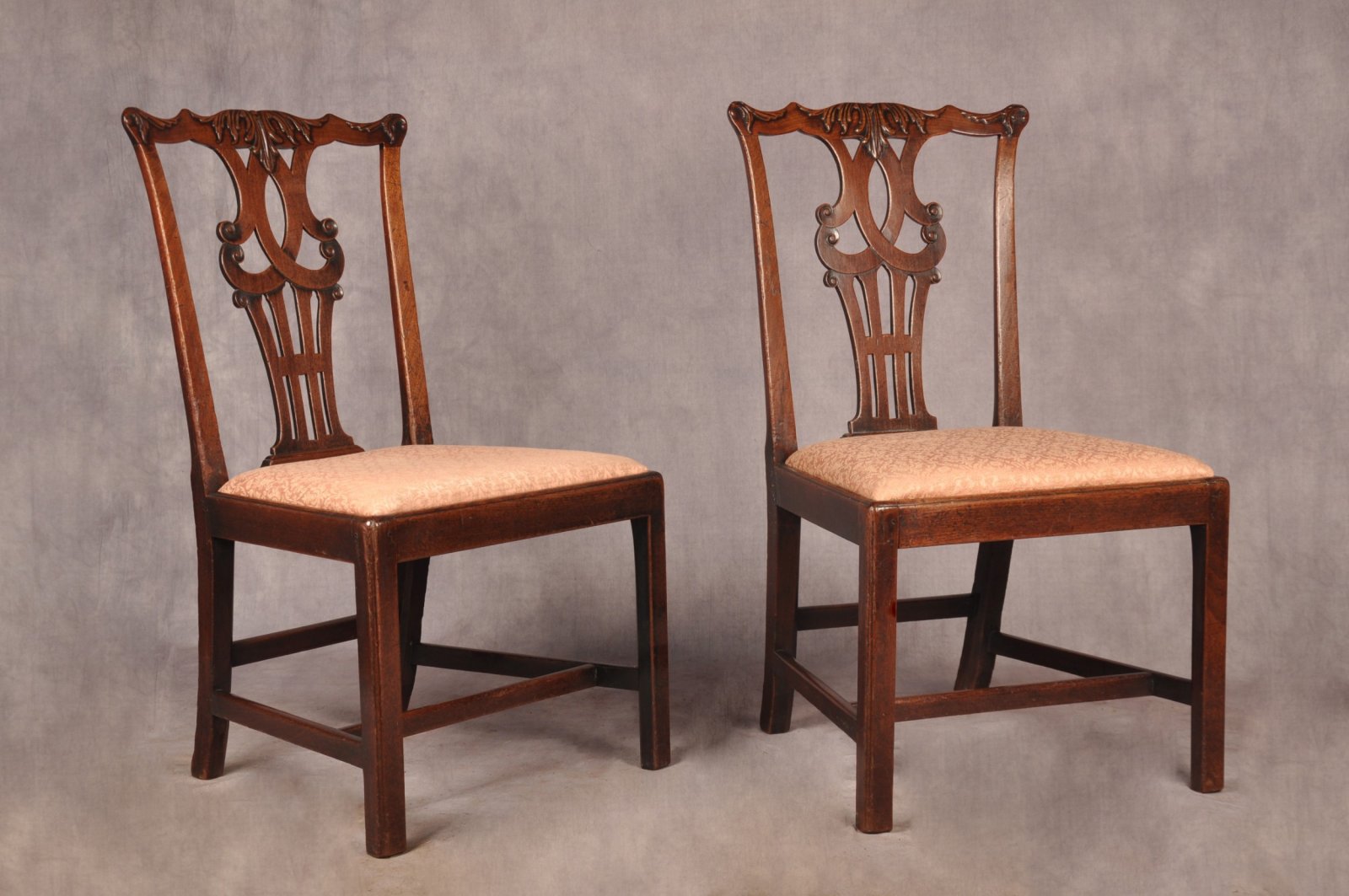 A fine pair of full period Chippendale Chairs of the most wonderful glowing colour and patina. Having superbly carved foliate top rails and nicely shaped splats incorporating carved scrolls. They are in very good solid original condition.