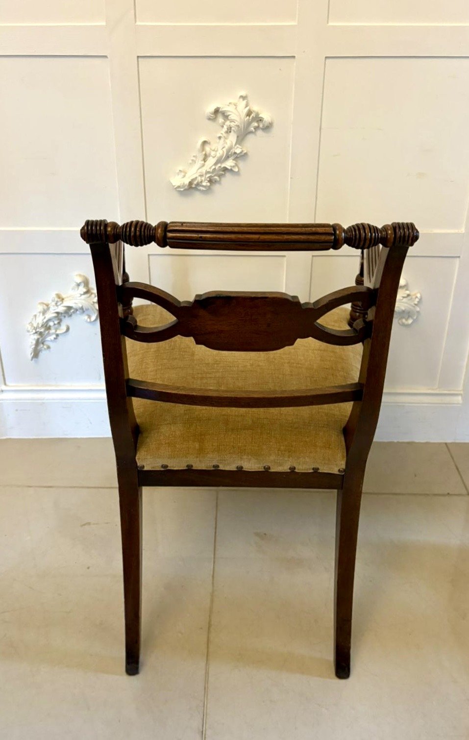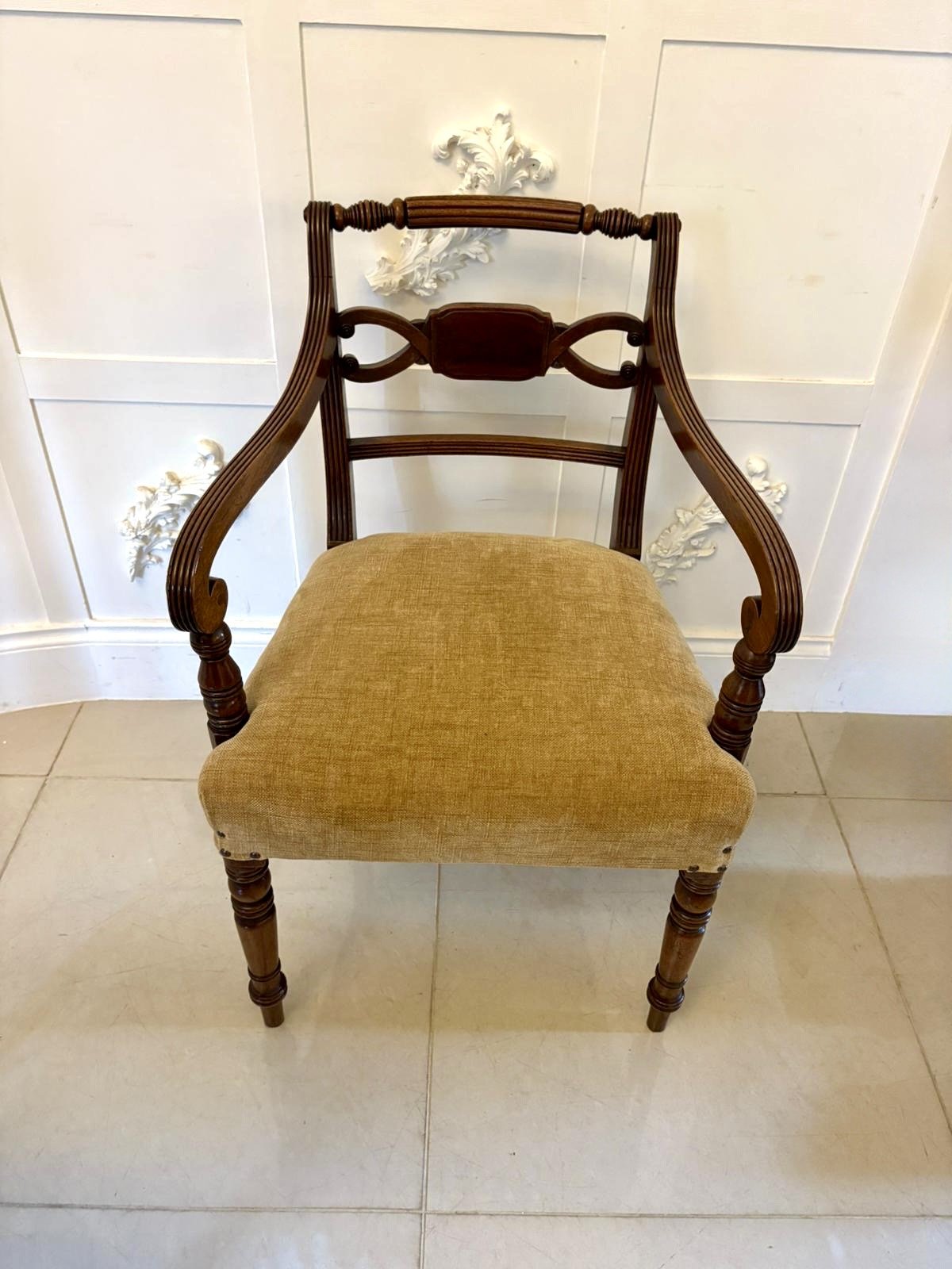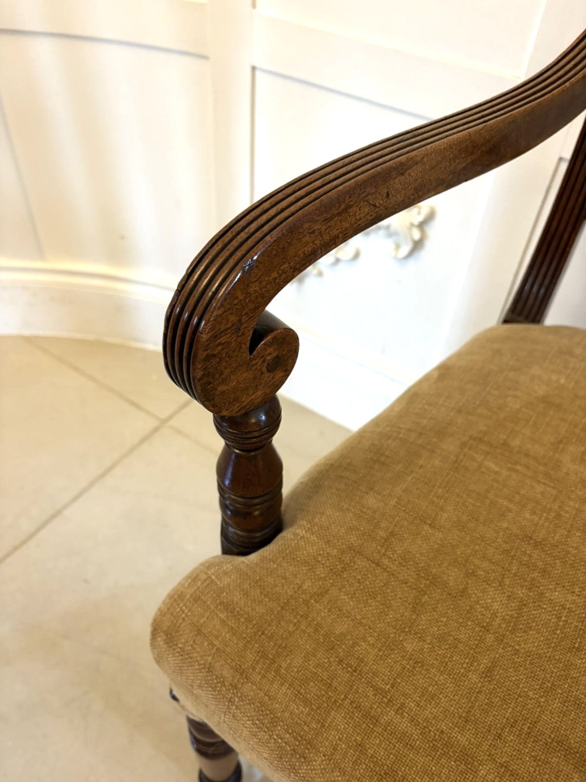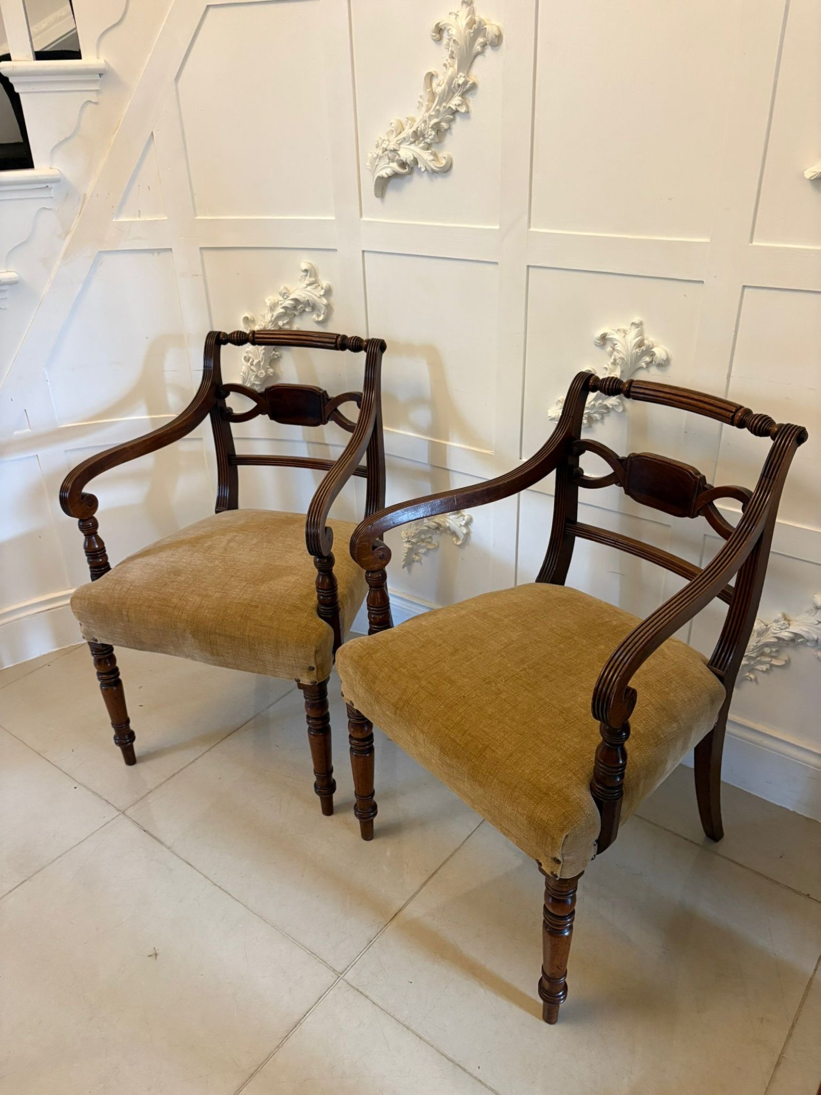 Fine pair of antique George III quality mahogany desk/carver chairs having a quality mahogany turned reeded top rail, unusual attractive shaped splat to the centre, shaped reeded open arms supported by turned columns, upholstered in a quality fabric, turned tapering legs to the front and outswept back legs.