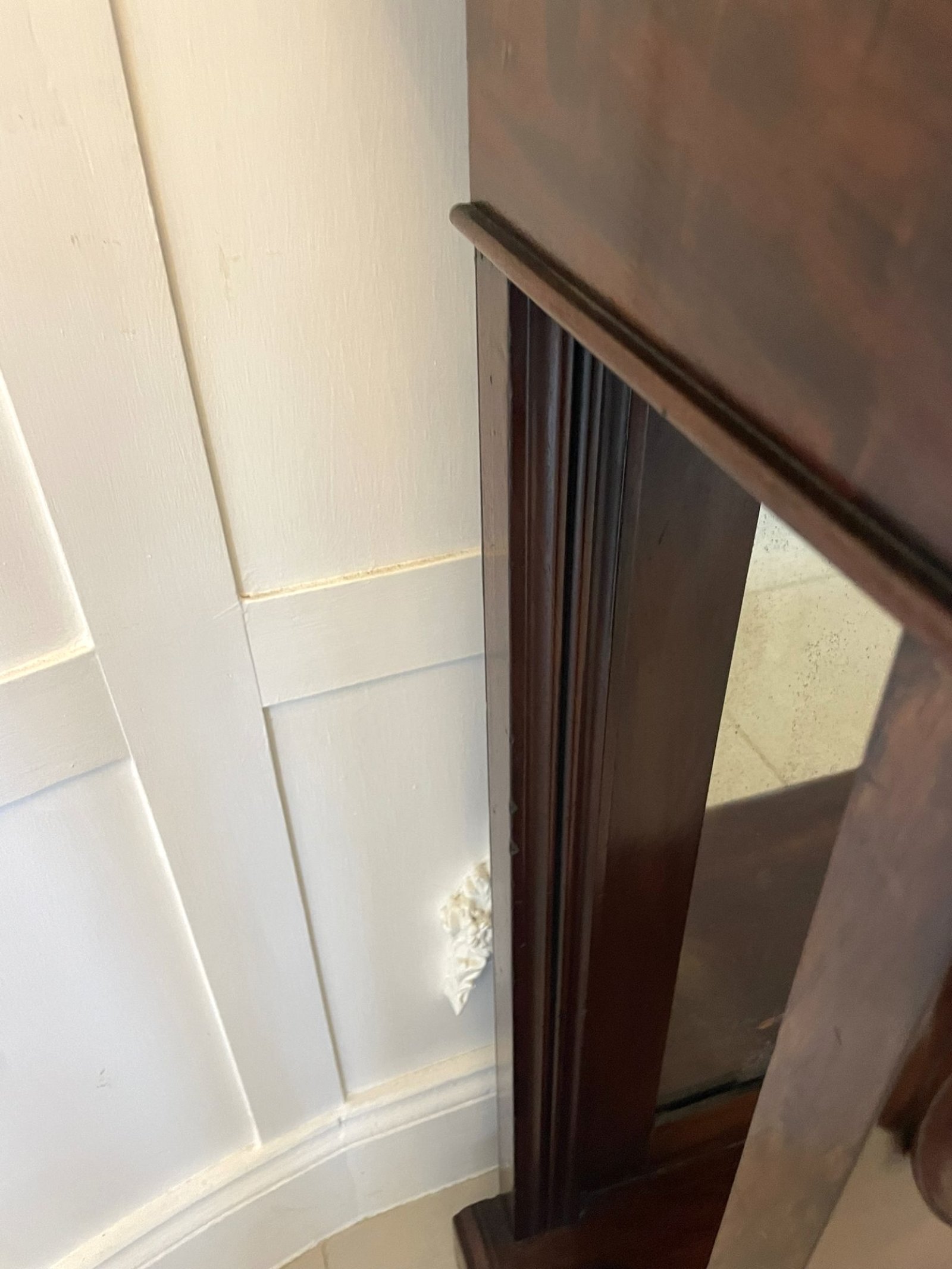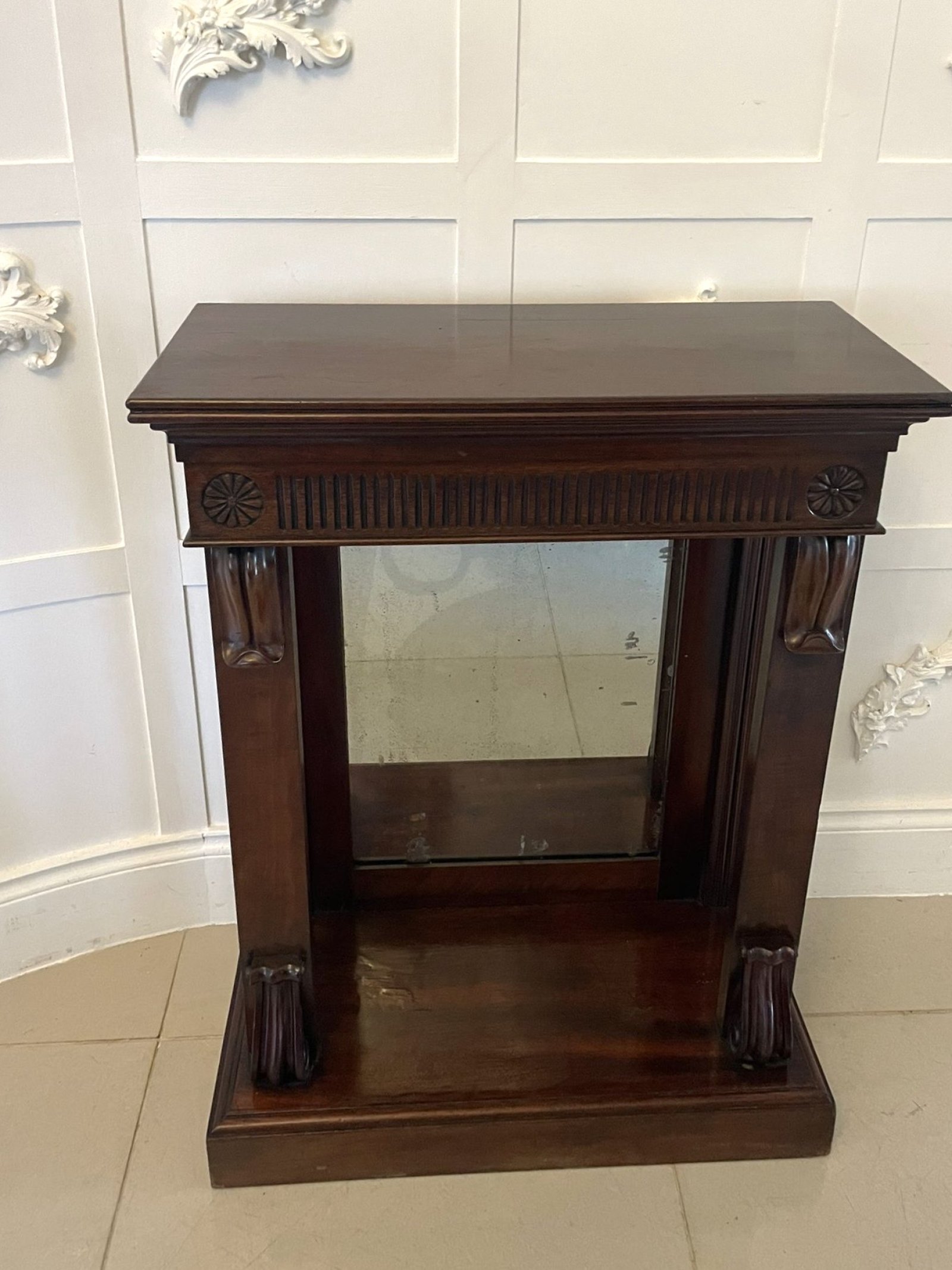 Fine pair of antique William IV quality mahogany console tables having quality mahogany rectangular shape tops with reeded edges above a carved and reeded frieze supported by two mahogany columns with carved corbels and original mirror back. They stand on a plinth base with a moulded edge