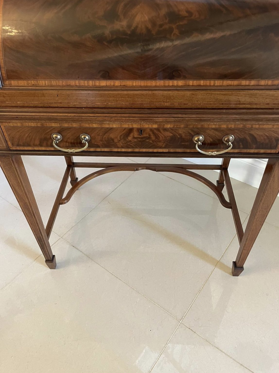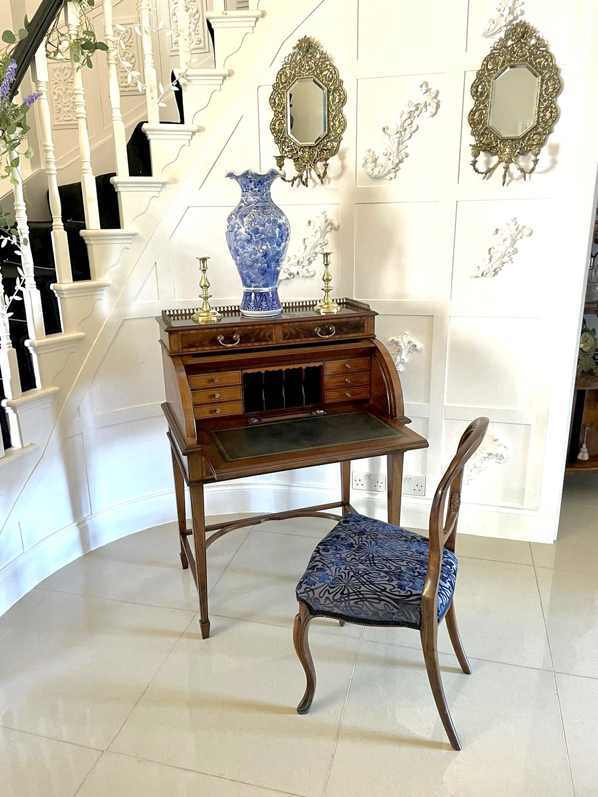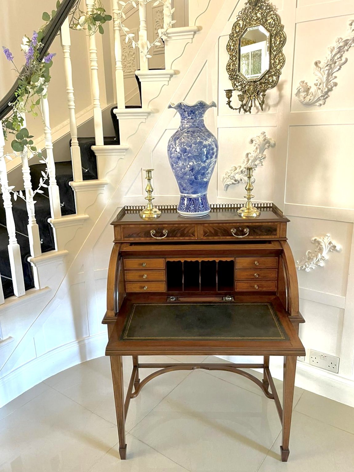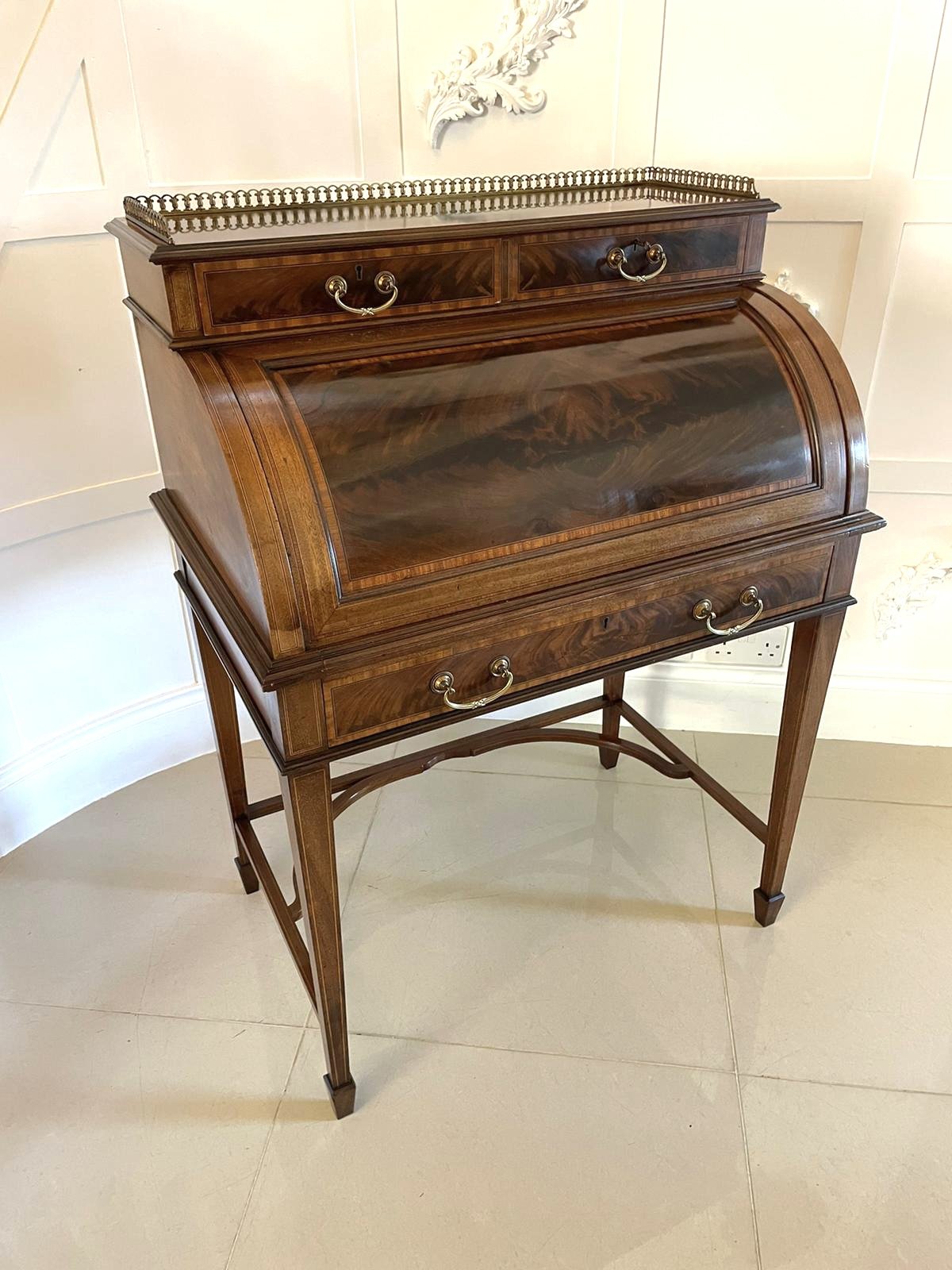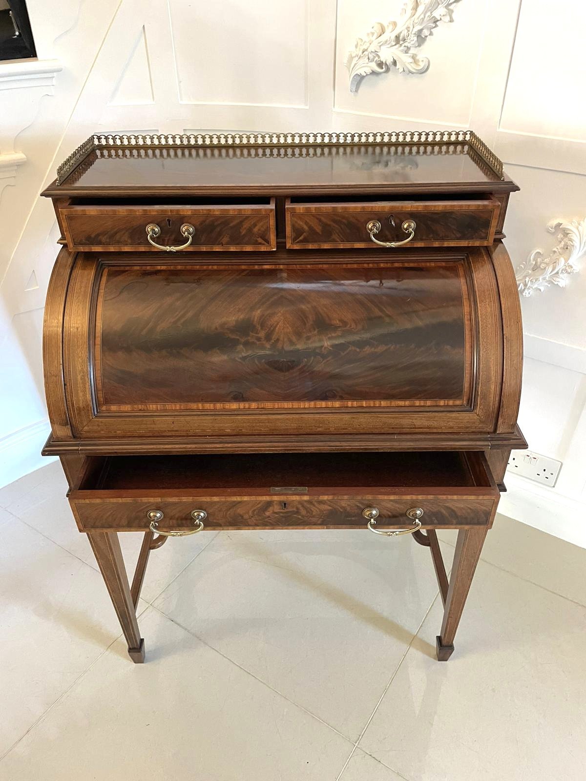 Fine quality antique Edwardian freestanding mahogany inlaid cylinder desk by Maple & Co. London having the original brass gallery above two mahogany drawers with pretty satinwood crossbanding and original brass handles above a cylinder top desk with satinwood crossbanding and a figured mahogany panel. The panel opens to reveal a fine quality fitted interior consisting of six satinwood drawers with original brass handles, four pigeon holes, pen tray and a pair of original glass inkwells. It boasts the original leather writing surface above one long drawer with satinwood crossbanding, stamped Maple & Co, original brass handles, satinwood inlaid stringing to the sides and back standing on four elegant square tapering mahogany inlaid legs with spade feet and united by a shaped mahogany inlaid stretcher