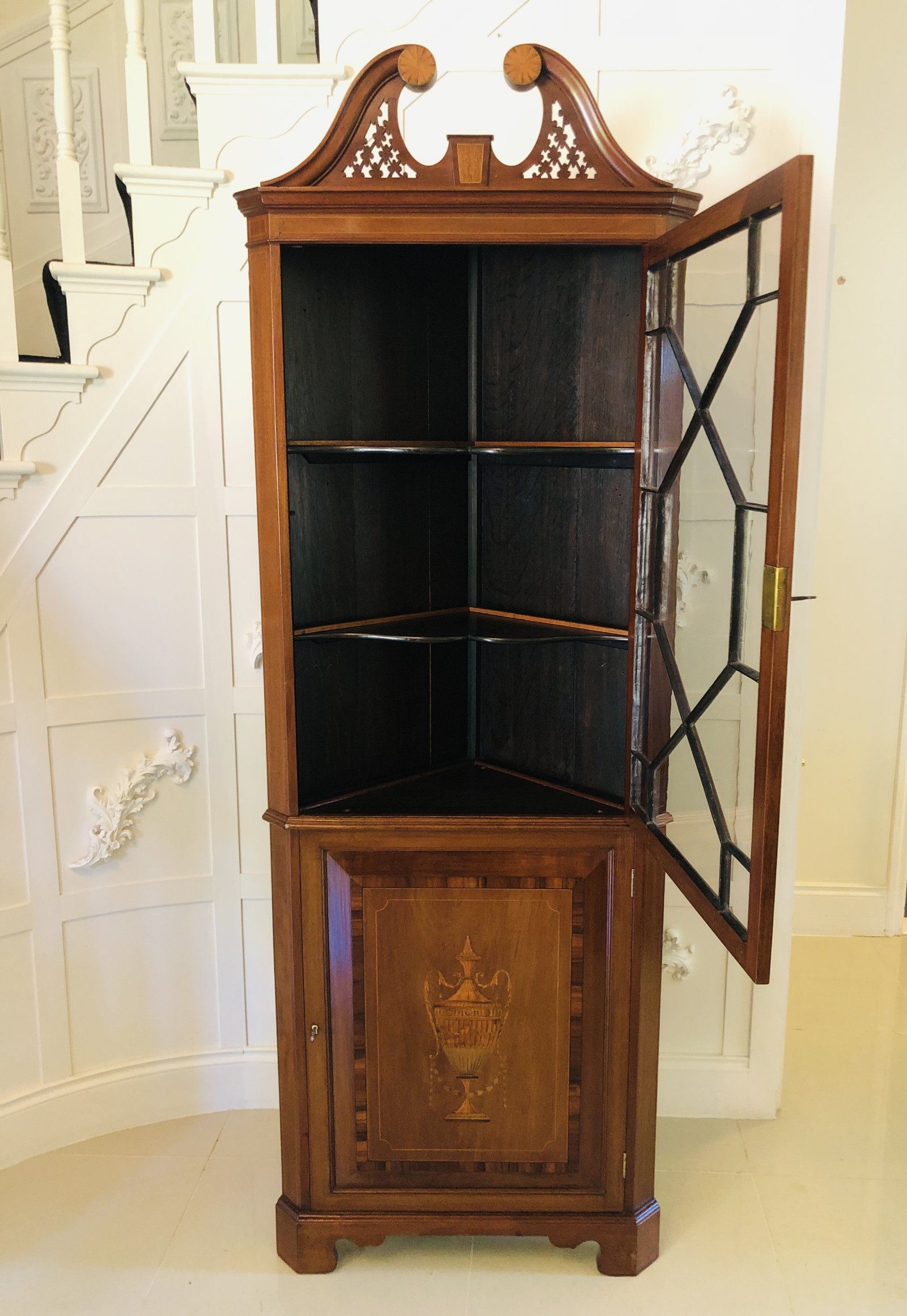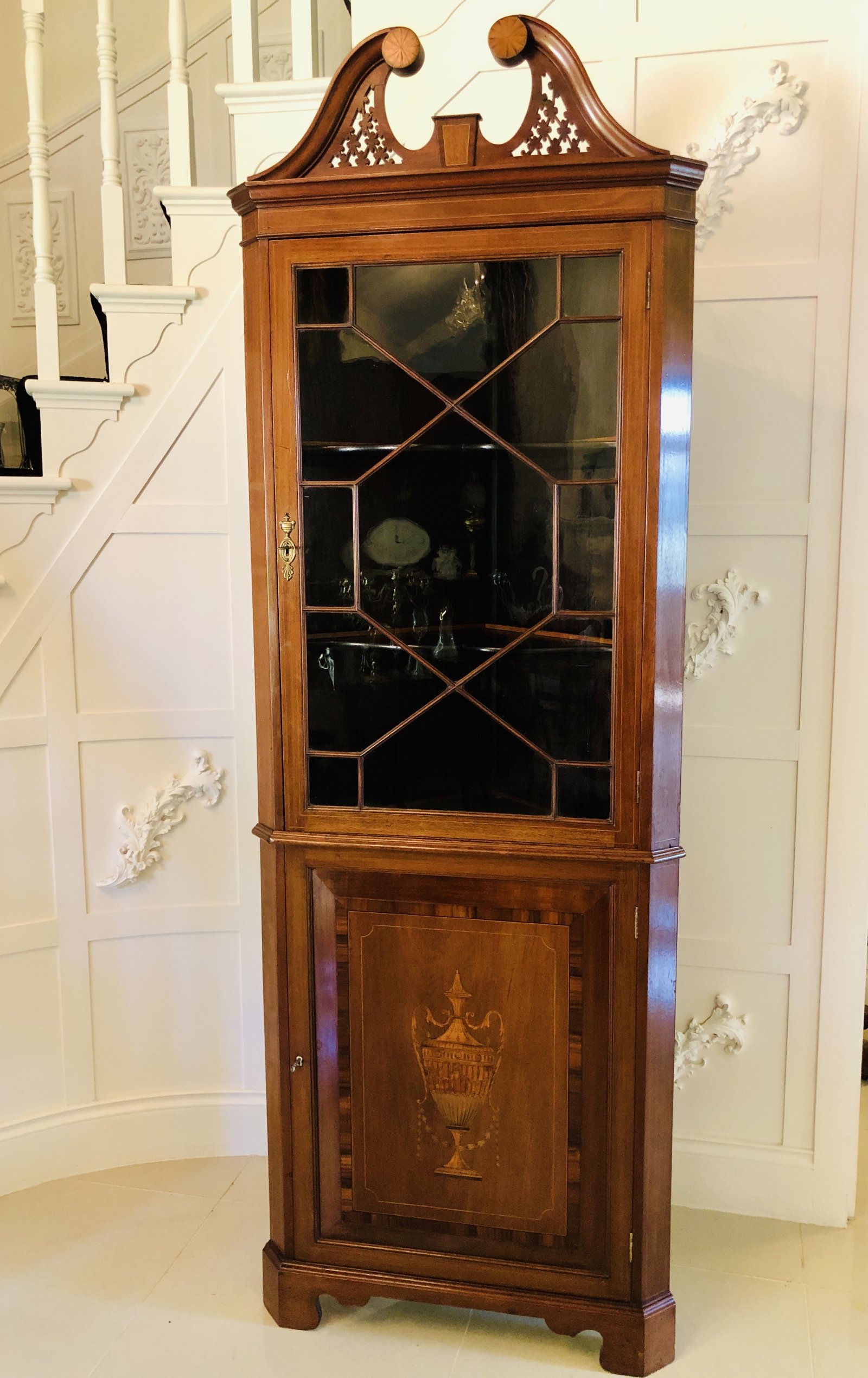 Fine quality Edwardian inlaid mahogany corner cupboard having an elegant swan neck pediment with pierced fretwork and very desirable inlay decoration, ogee shaped cornice, single glazed astragal door with boxwood stringing opening to reveal two shaped shelves, one single panelled door with a magnificent inlaid urn with harebells and swags and crossbanded in rosewood stringing. It stands on original bracket feet and comes with original keys.