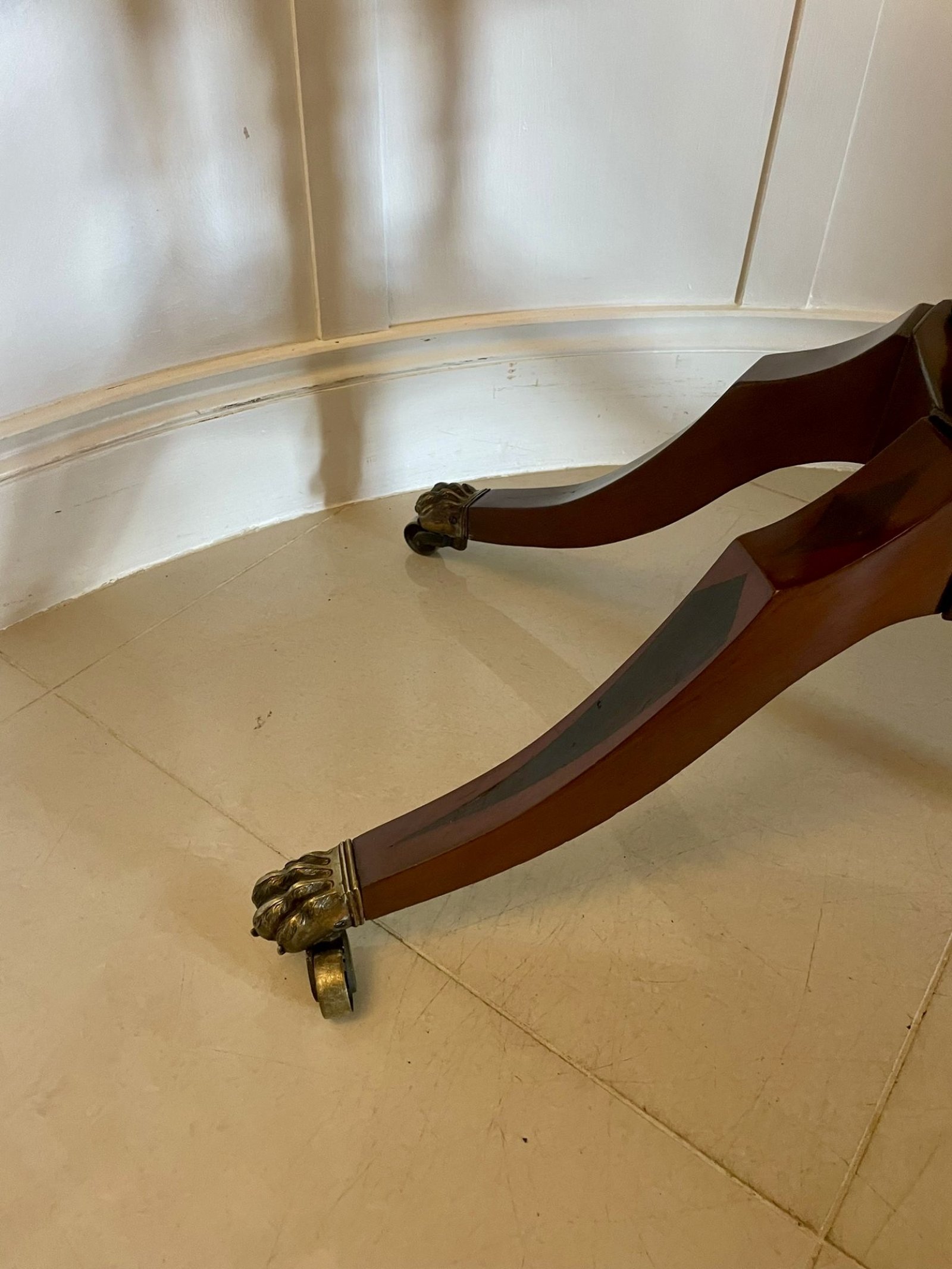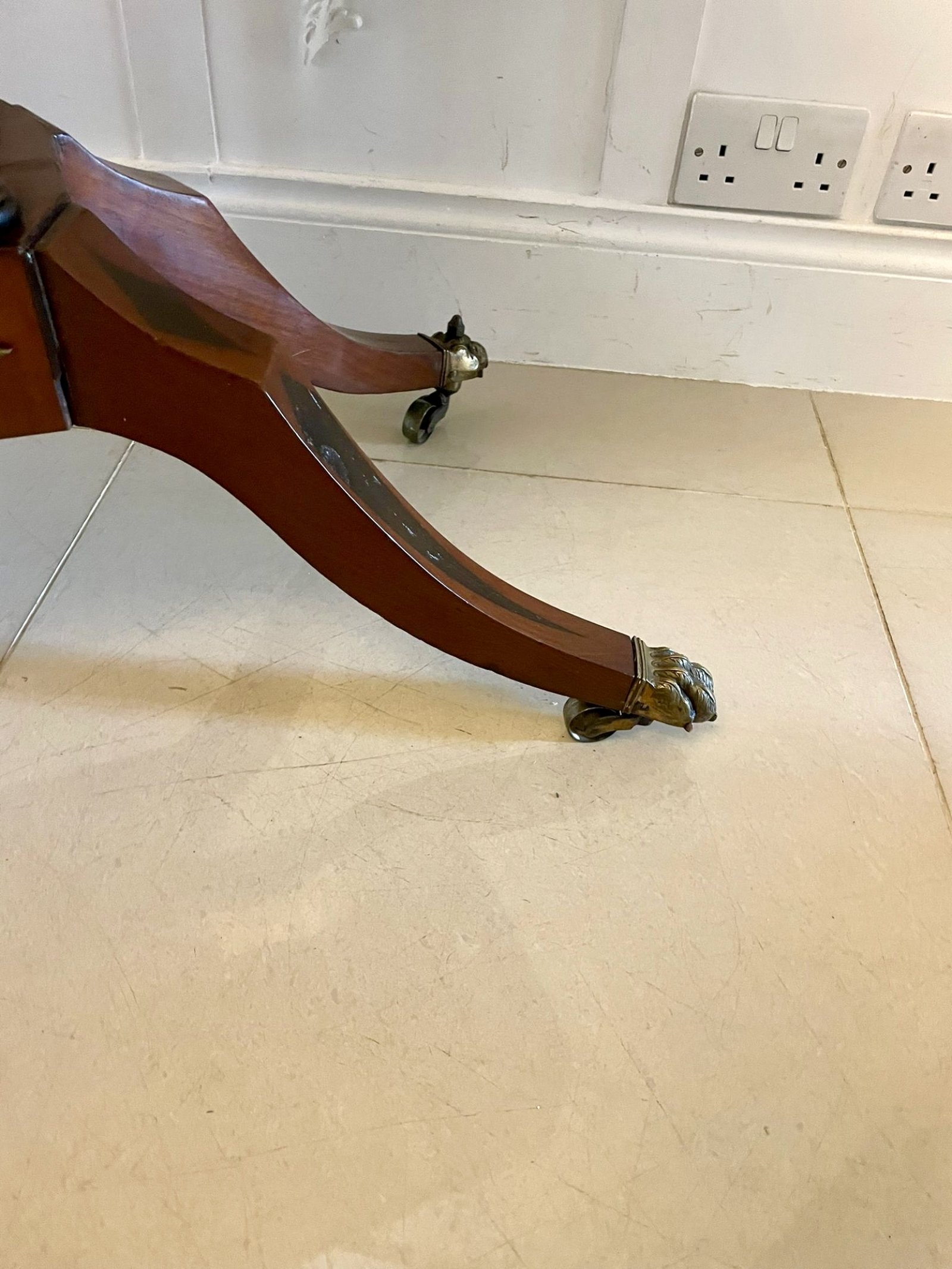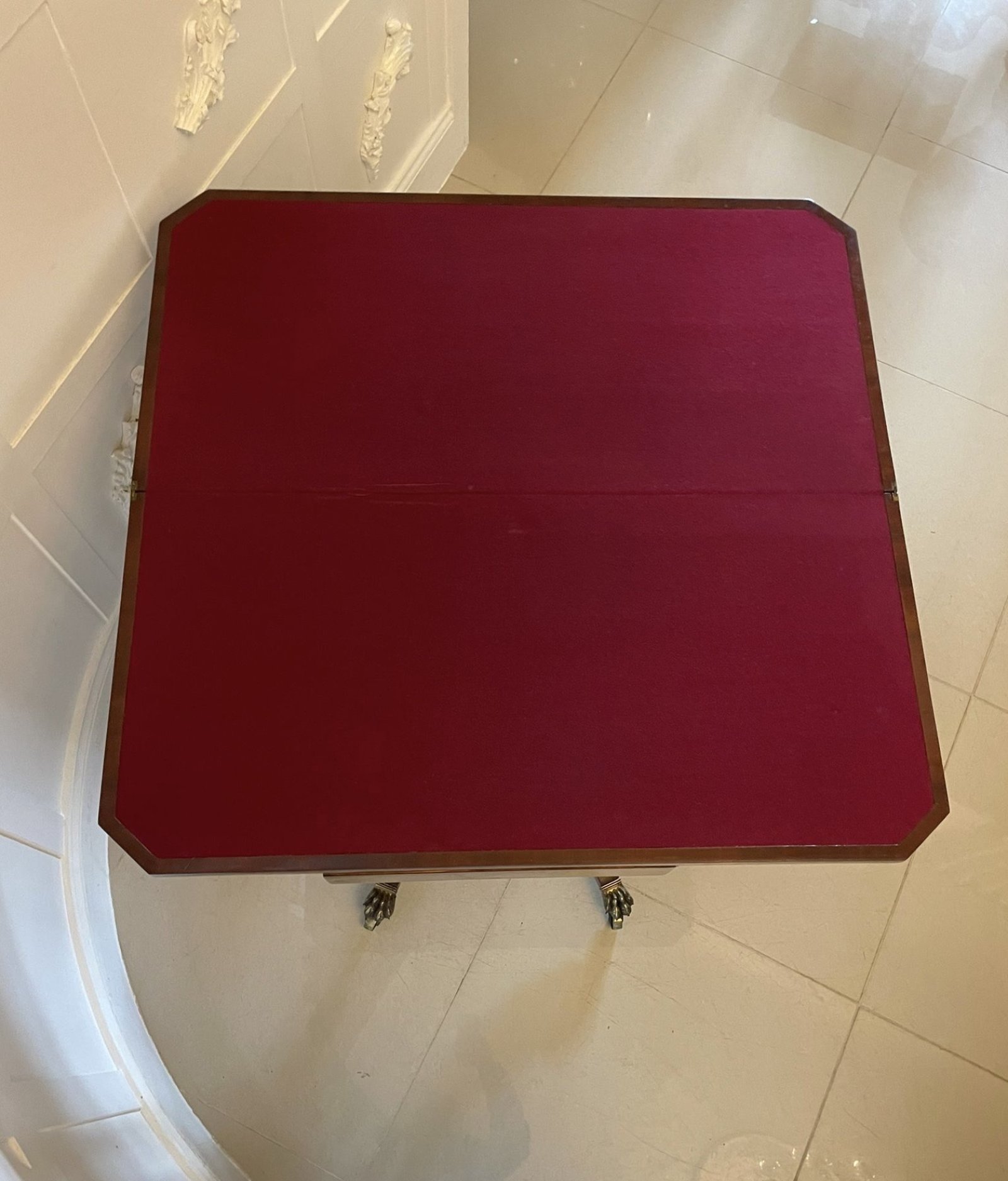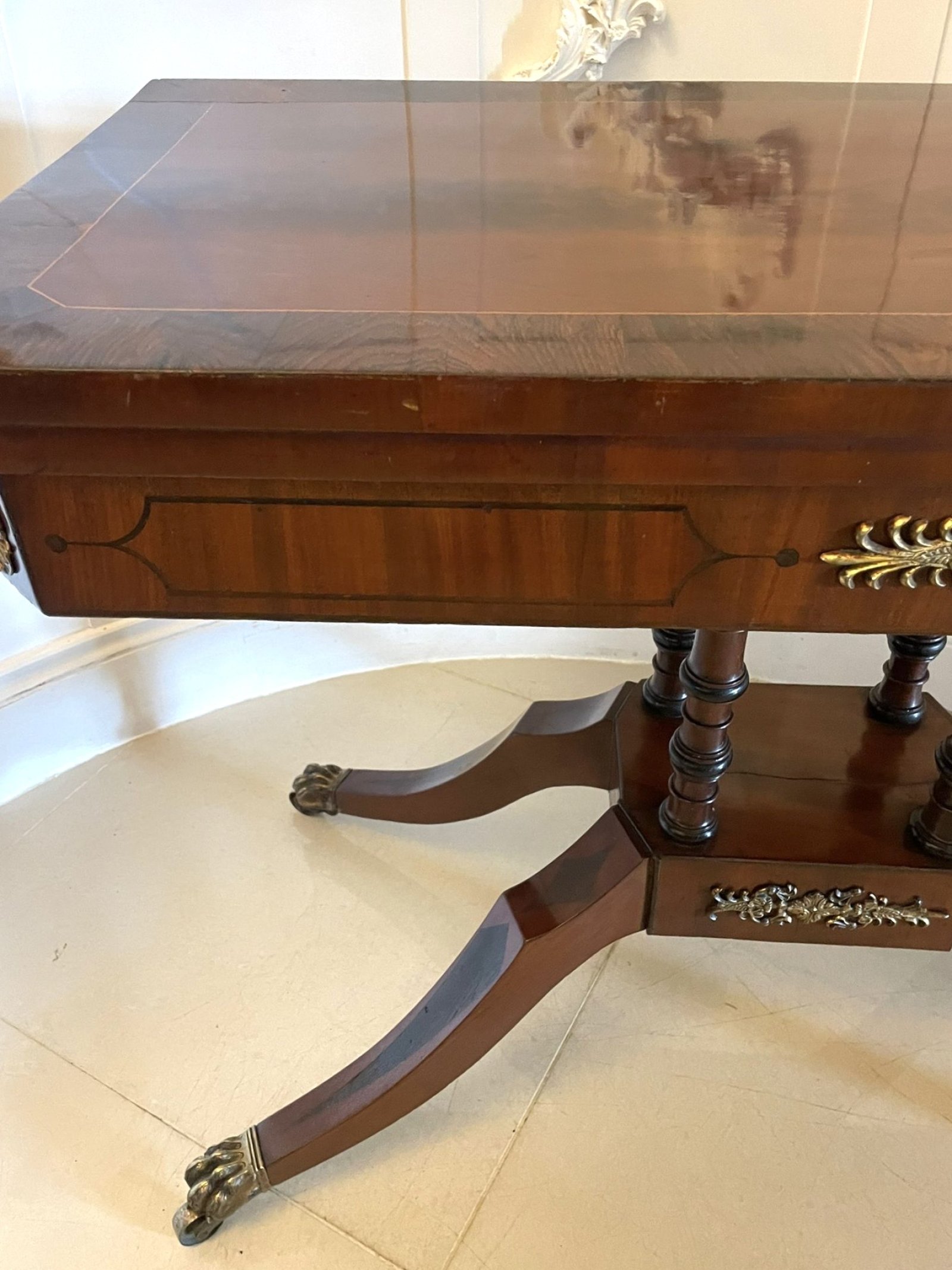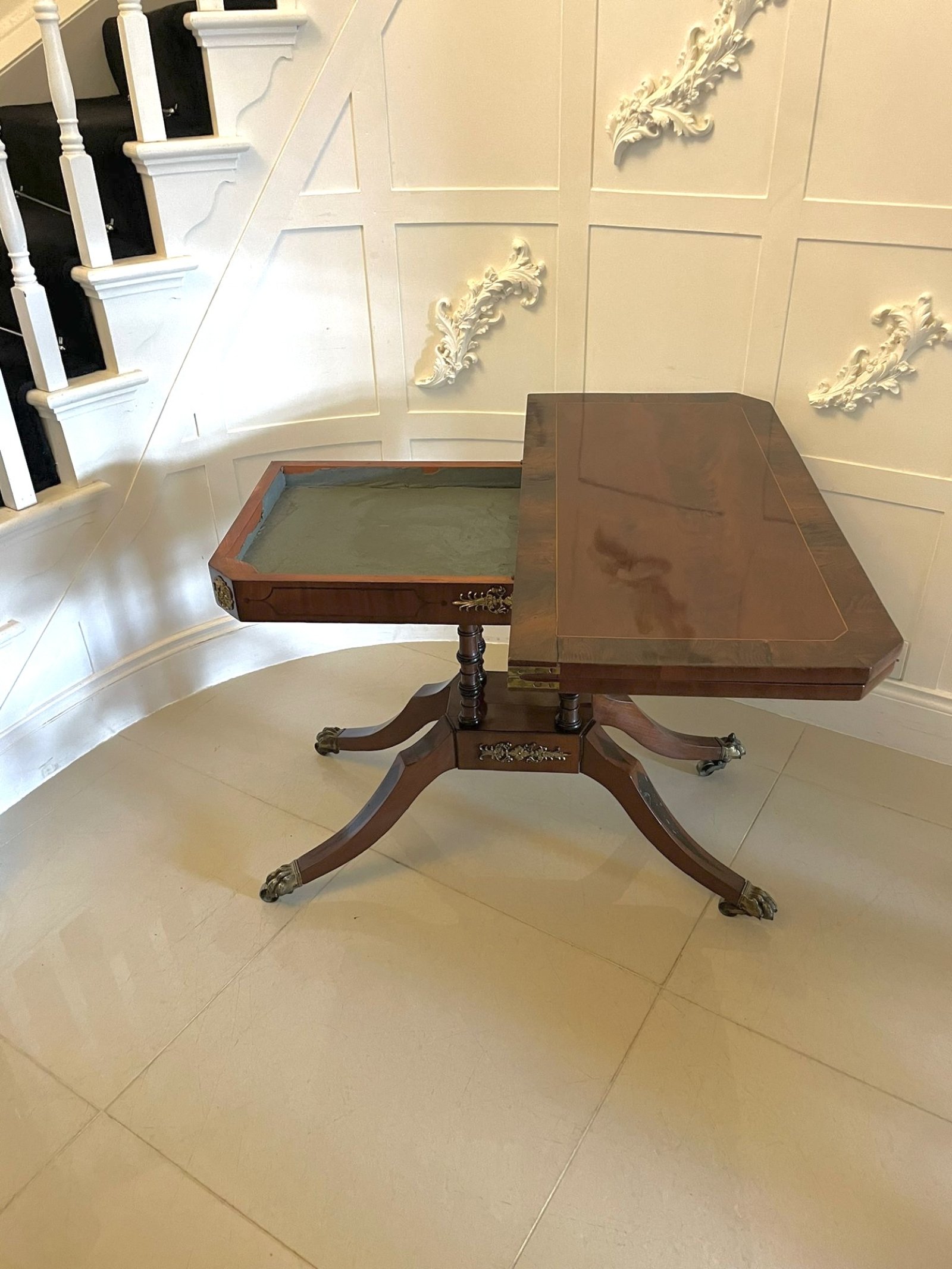 Fine quality antique regency figured mahogany card/console table with gilded brass mounts having a fine quality figured mahogany swizzle top crossbanded in rosewood and satinwood inlaid stringing opening to reveal a red baize interior, mahogany frieze with ebony inlay stringing and fantastic gilded brass mounts supported by four turned columns on a platform base with a gilded brass mount standing on four shaped sabre legs having ebony inlay and original brass claw feet with brass castors