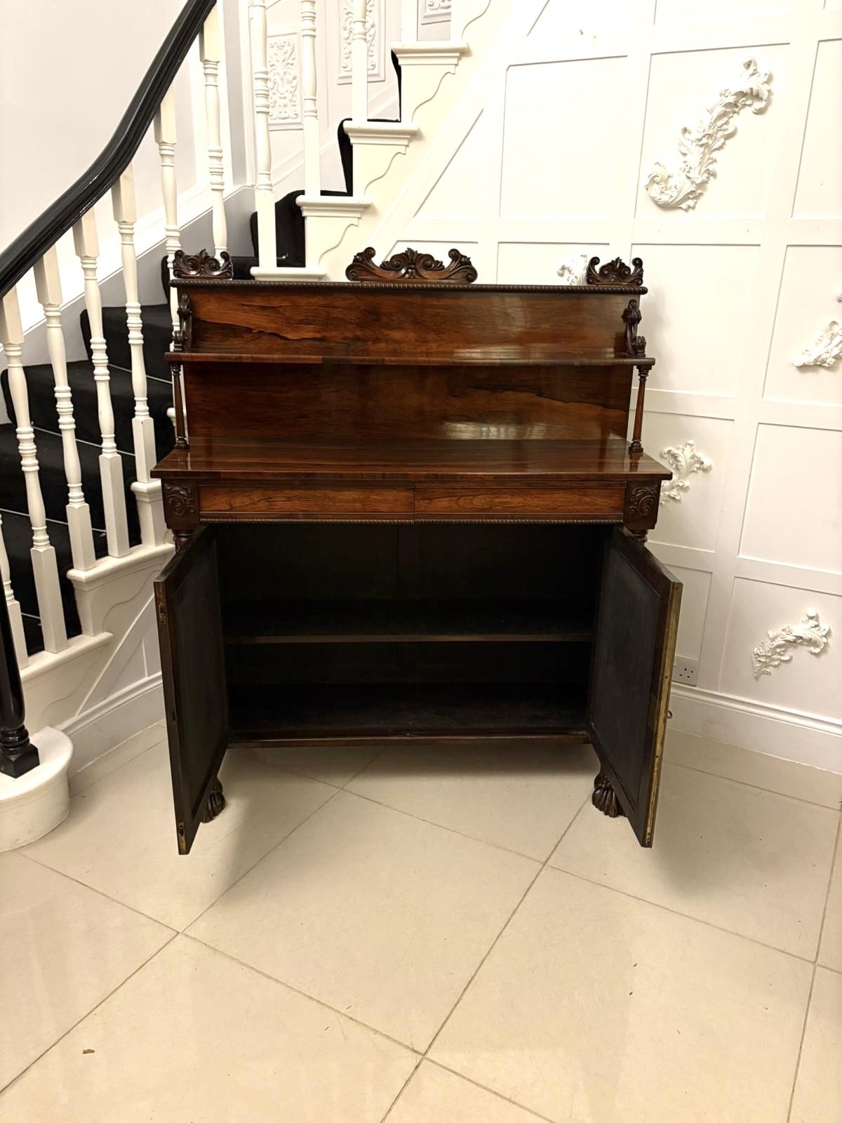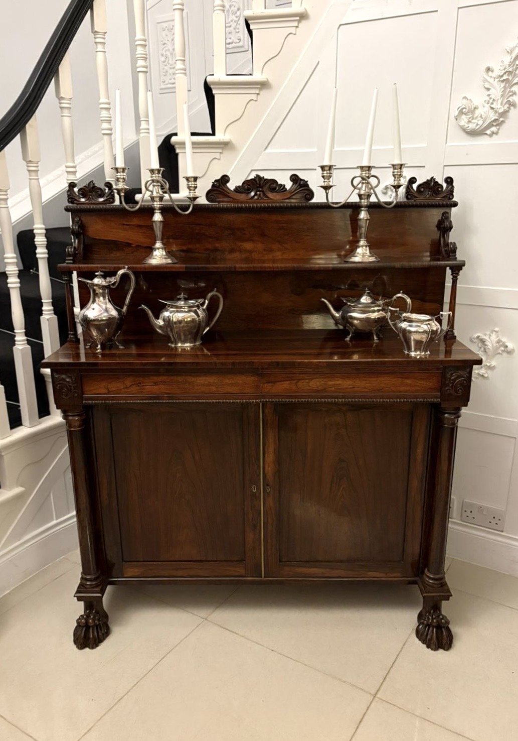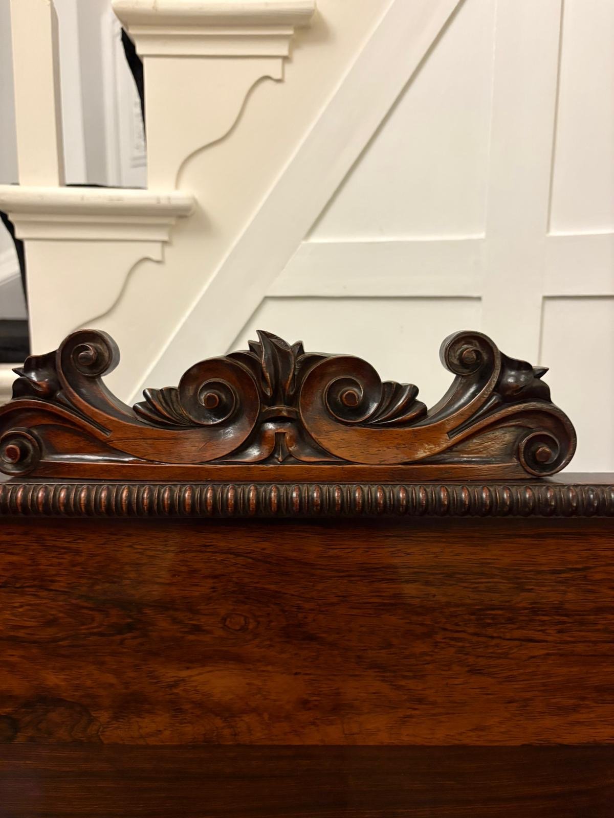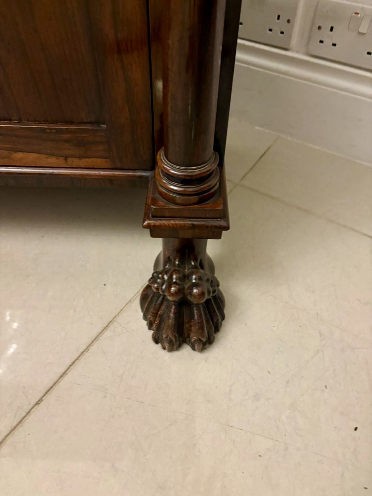 The front is flanked by slender column supports and the sideboard stands proudly on bold carved lion’s paw feet, adding both balance and grandeur to the overall design. The clean classical lines, restrained ornamentation, and superior timber selection are all hallmarks of Regency furniture at its best.