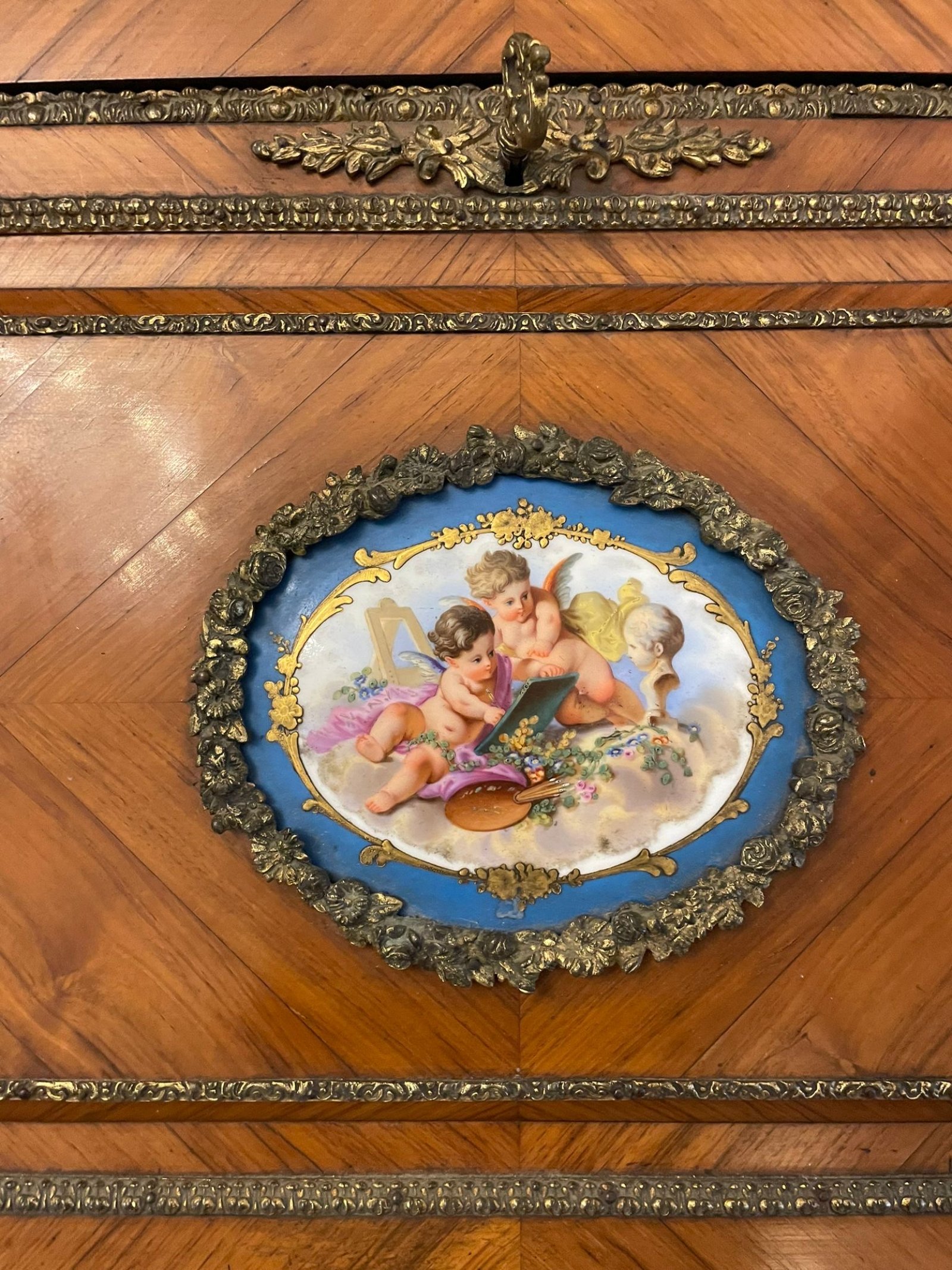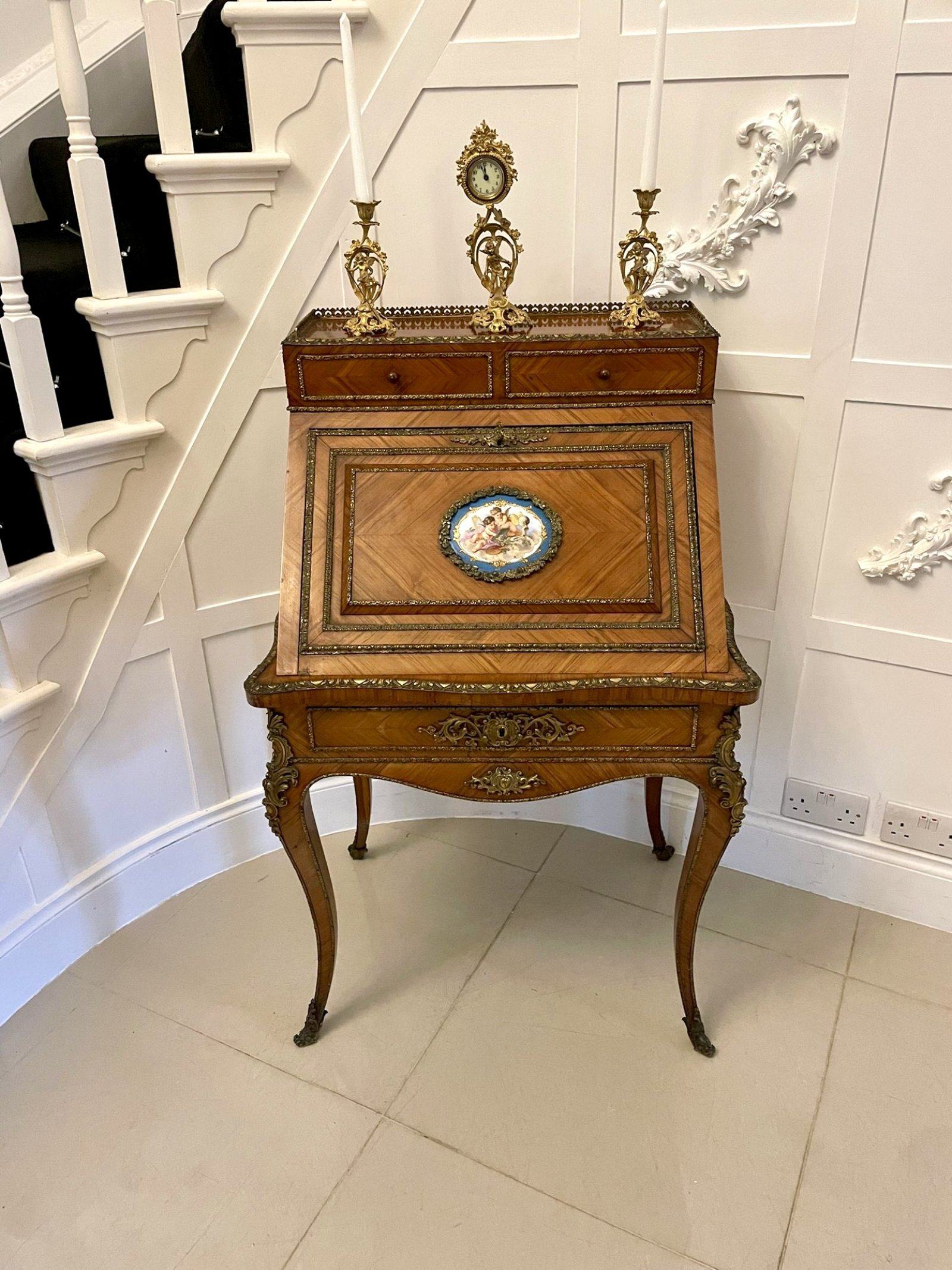 Fine quality French antique Victorian kingwood and ormolu mounted bureau/desk having the original ornate ormolu gallery above two drawers and boasting ormolu beading above the kingwood bureau full, ormolu beading and an exquisite sevres plaque to the centre in an ornate ormolu mount opening to reveal a fitted interior consisting of four drawers, pigeon holes and the original velvet writing surface above one long frieze drawer with ormolu mounts, fantastic kingwood and ormolu mounted sides, freestanding polished back standing on shaped cabriole legs with ormolu mounts and ormolu feet