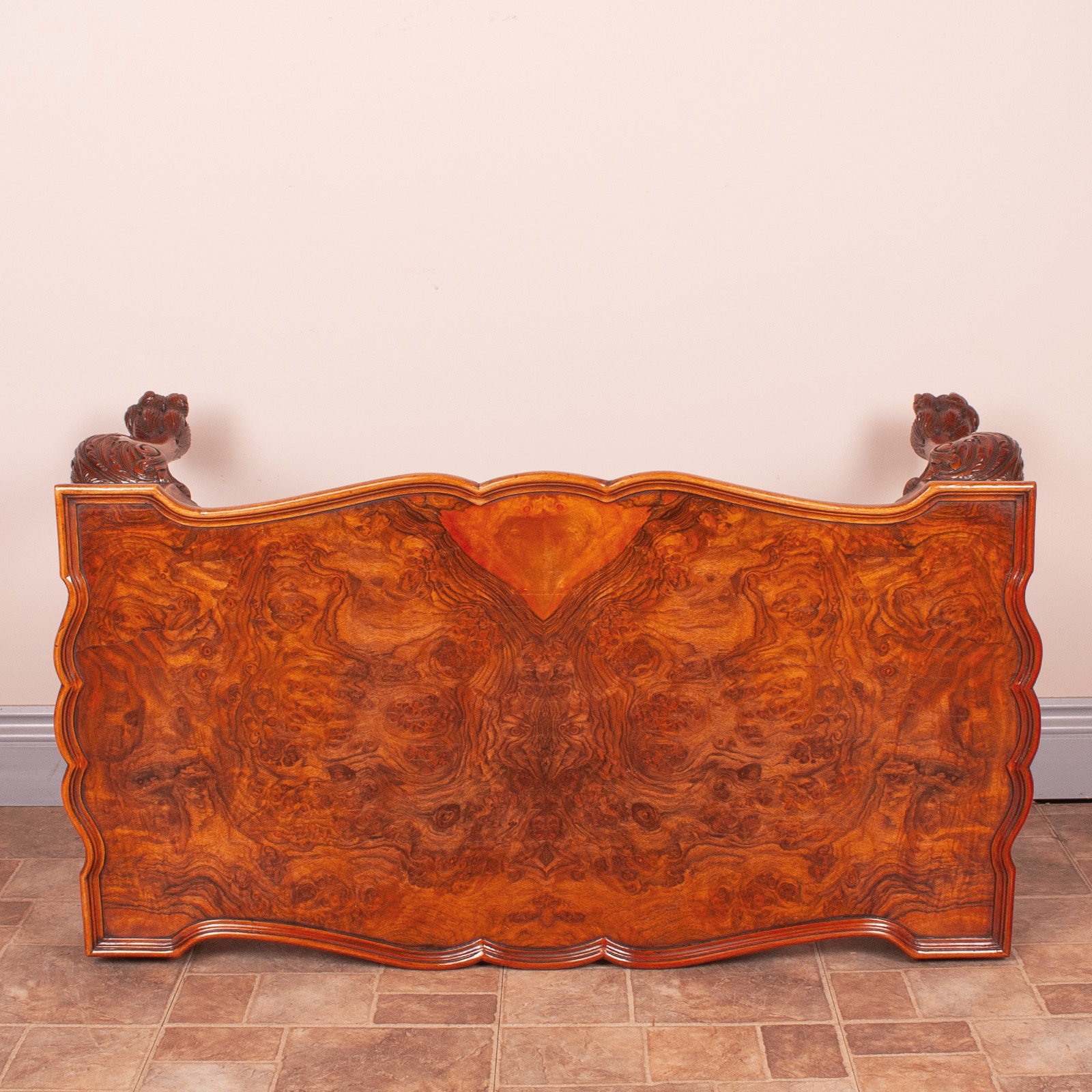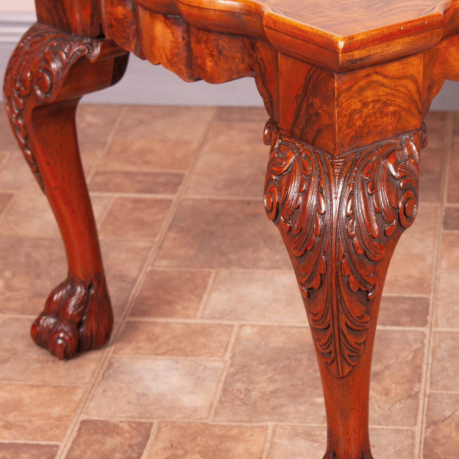 The shaped apron is veneered in figured walnut. The shaped top has a piecrust moulding to its edge and is veneered in beautifully figured, book matched walnut veneer.