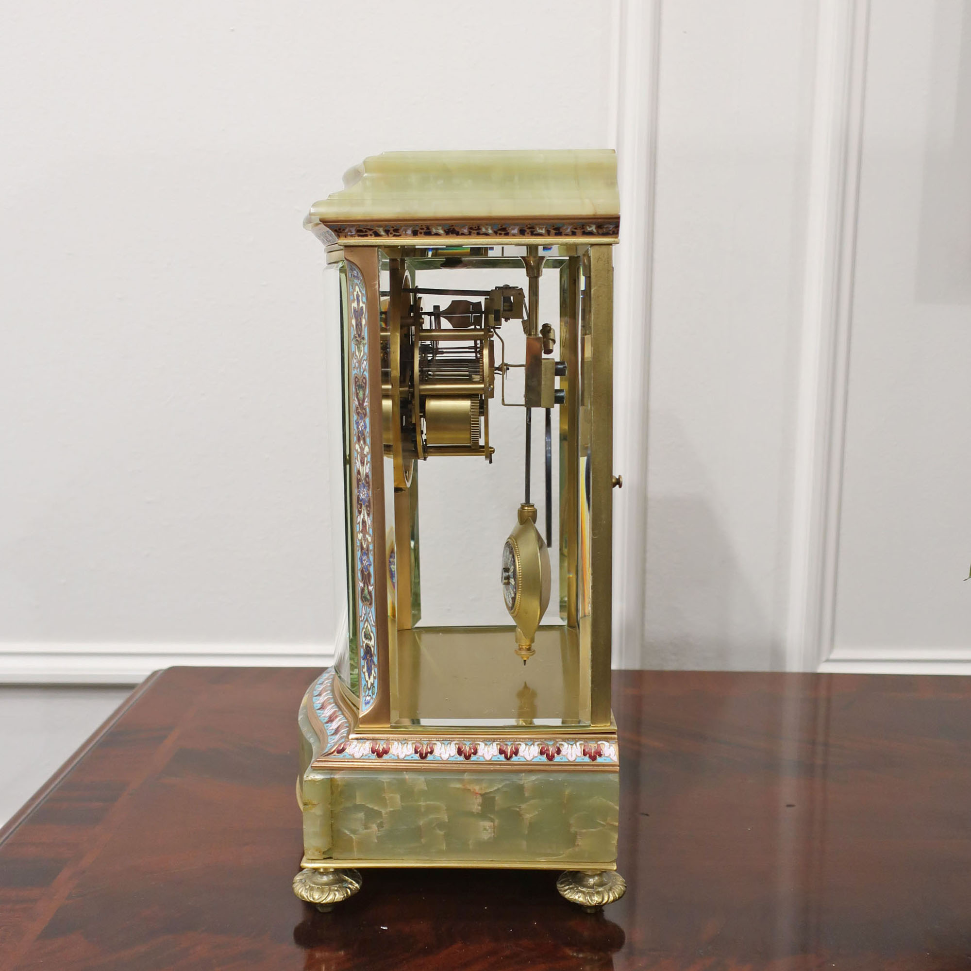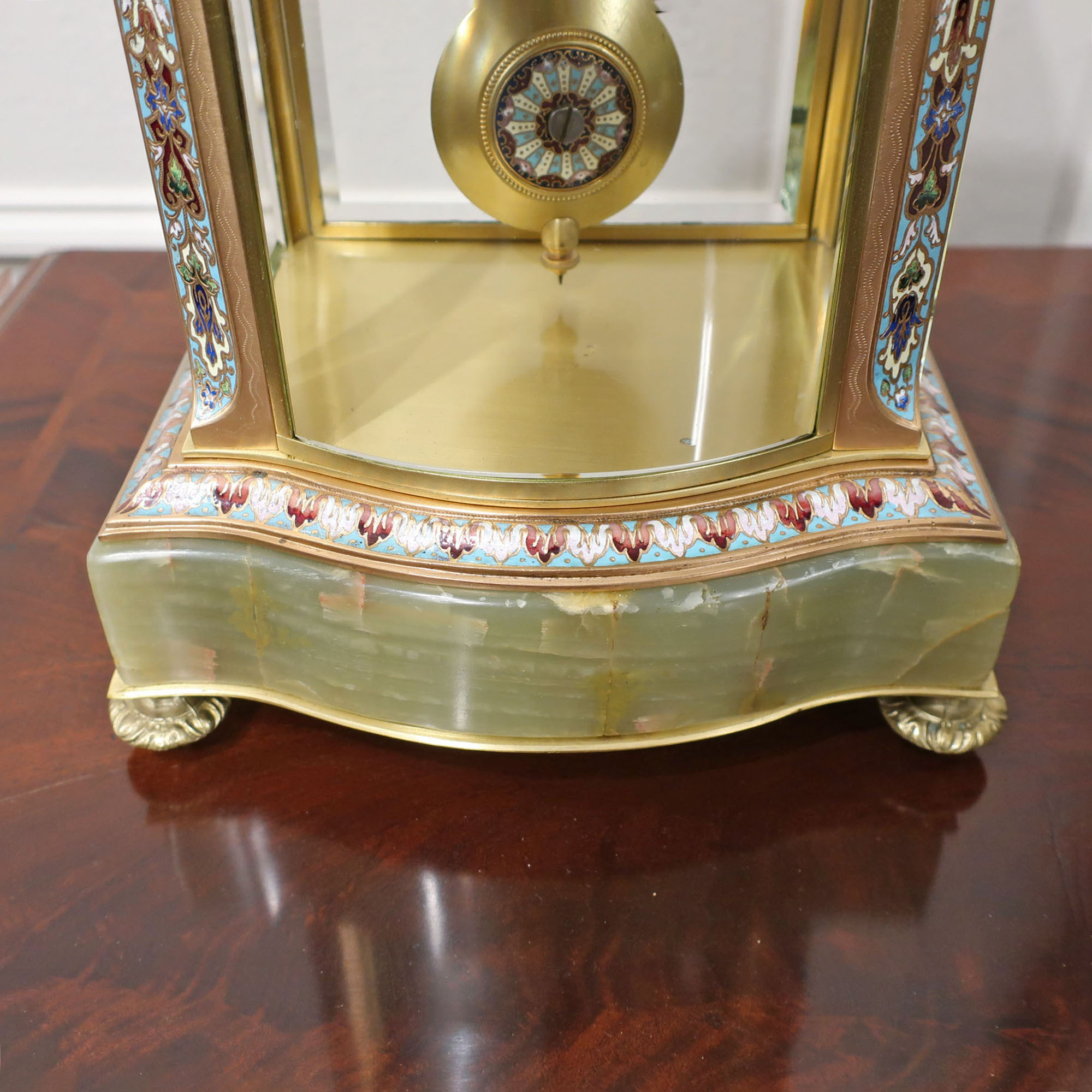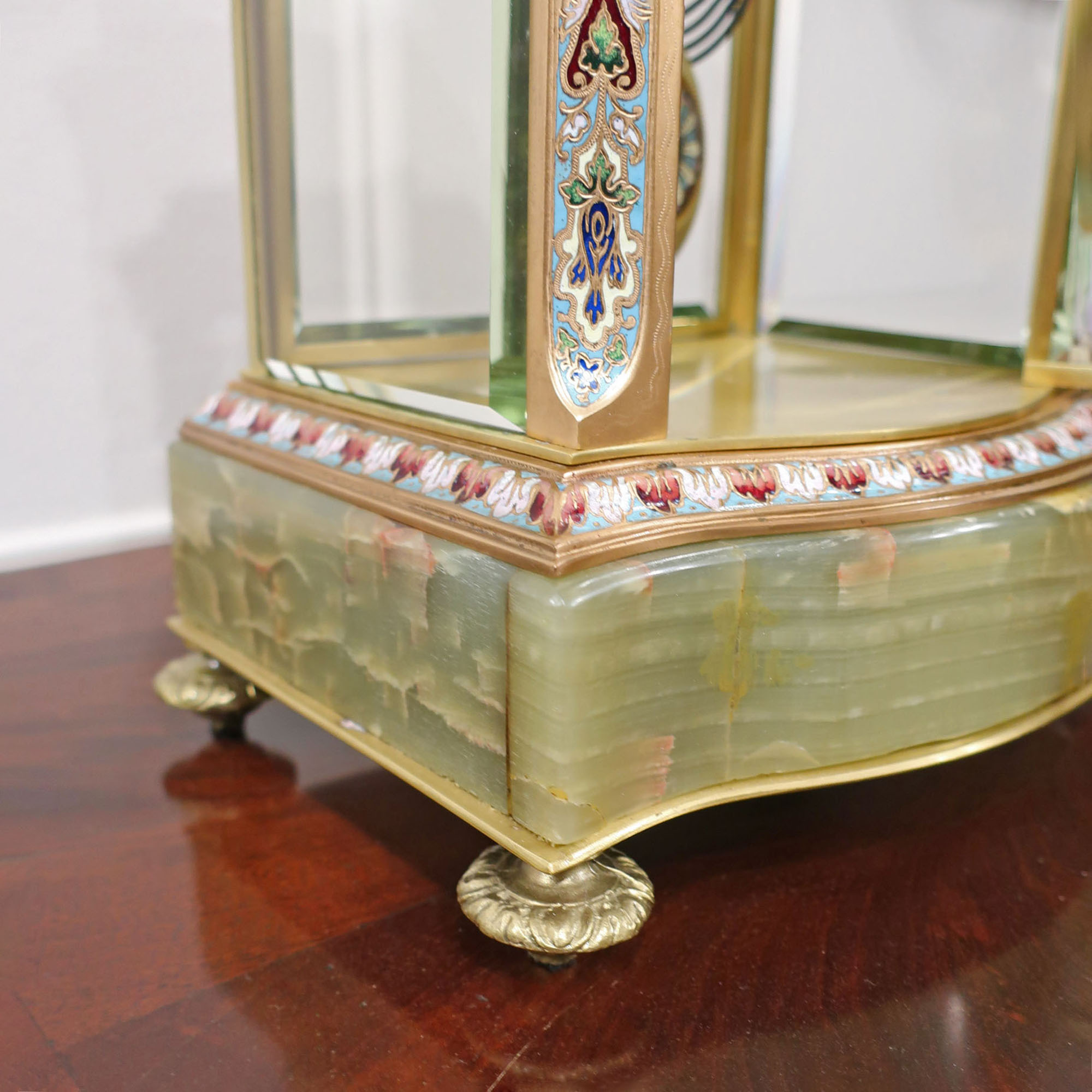 An extremely good quality French Belle Epoque brass four glass Victorian antique mantel clock with beautiful champlevé coloured enamel ornamentation to the case, pendulum and dial stood on shaped moulded onyx plinth base and top with decorative brass feet and four bevelled glass panels.