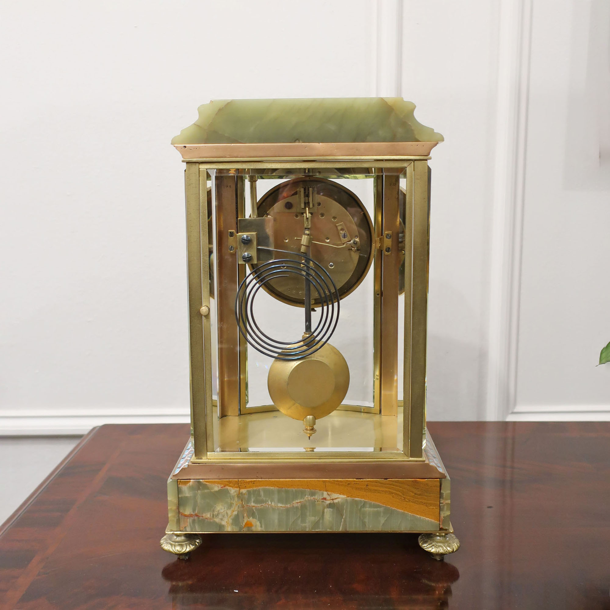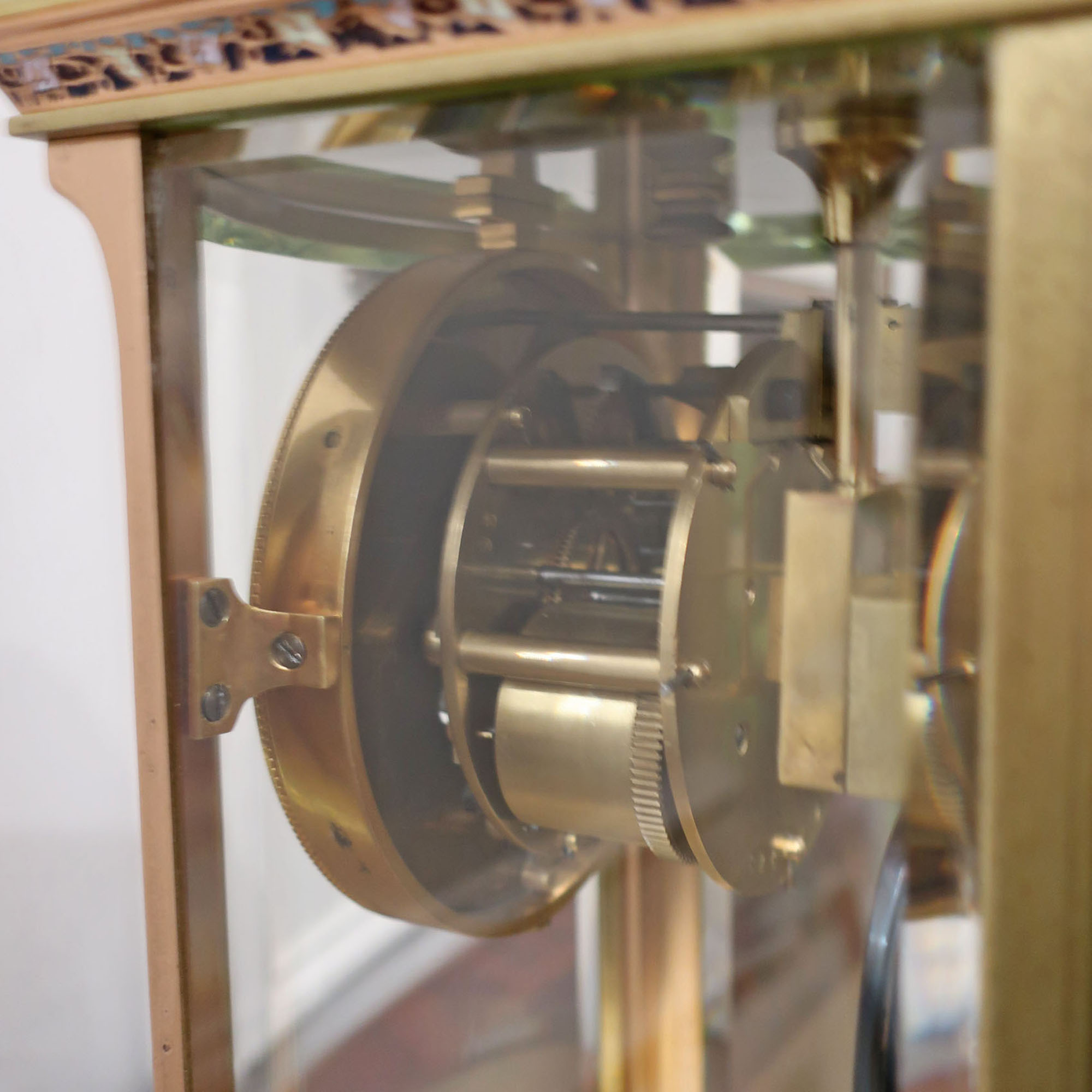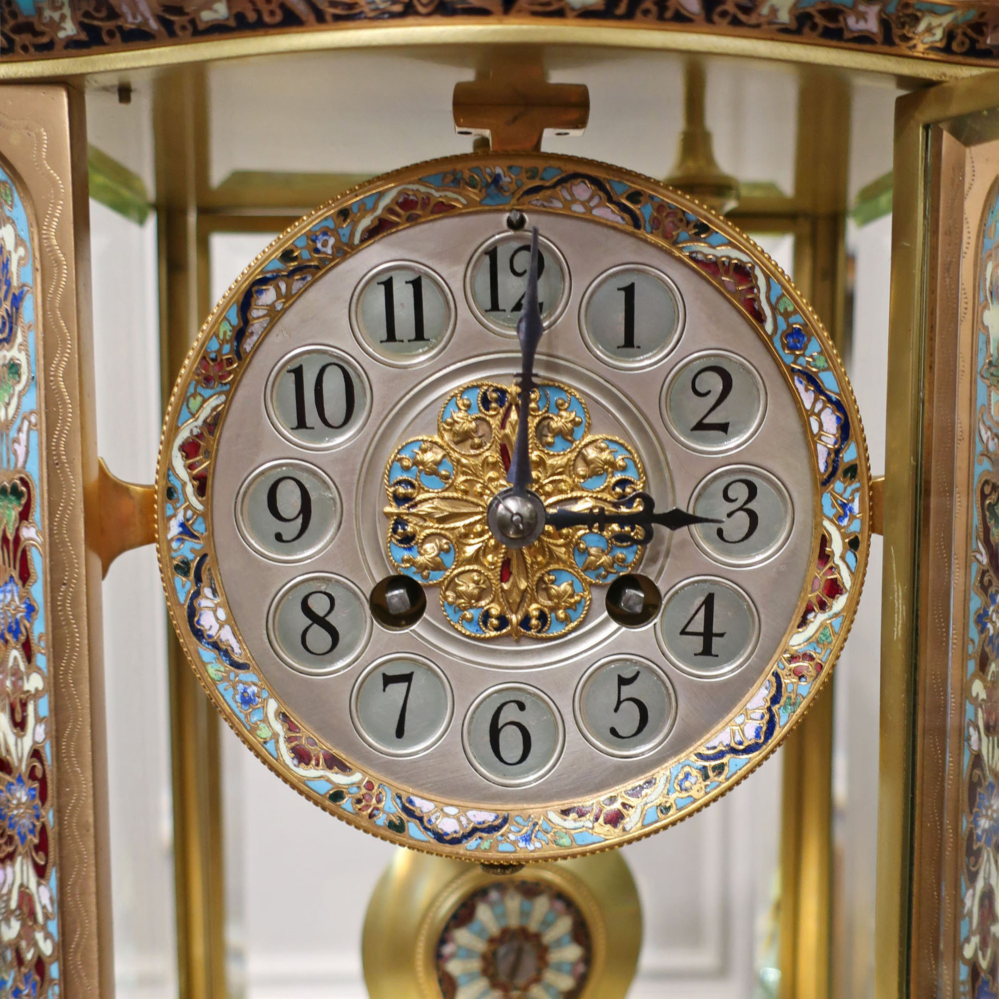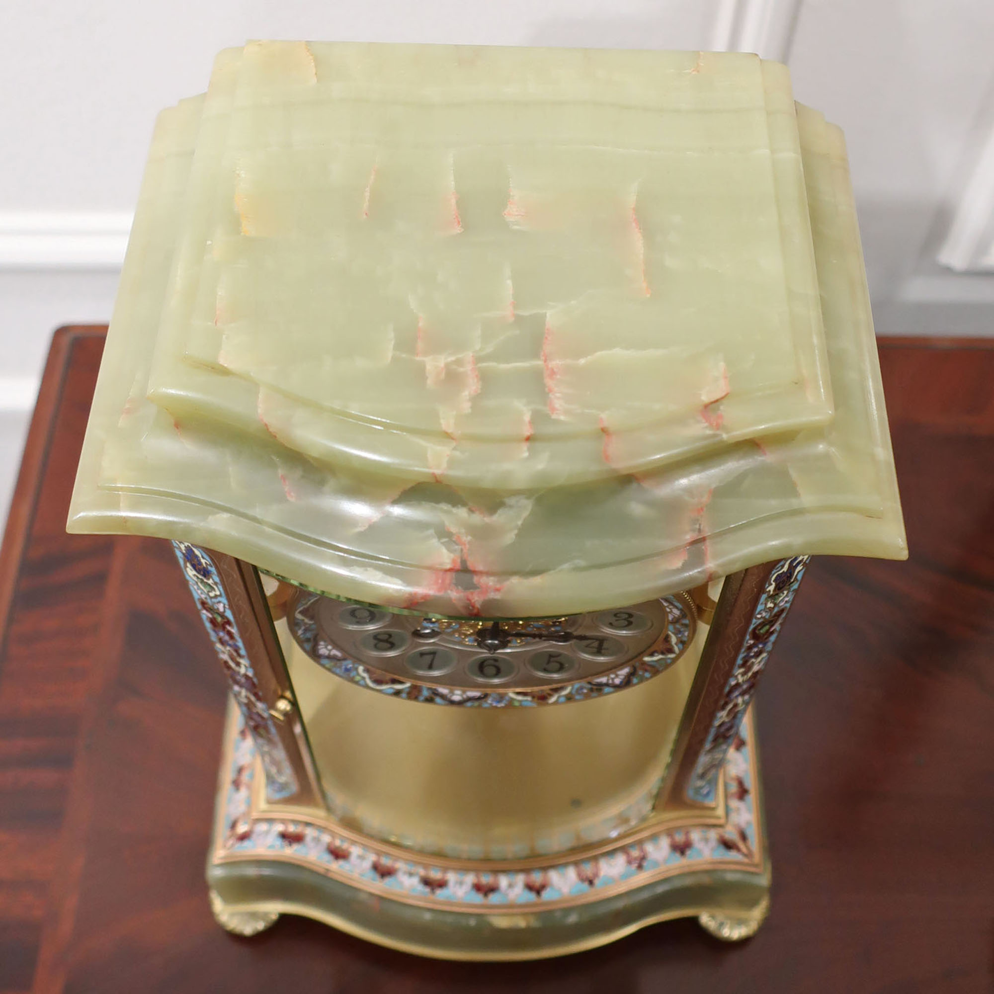 An extremely good quality French Belle Epoque brass four glass Victorian antique mantel clock with beautiful champlevé coloured enamel ornamentation to the case, pendulum and dial stood on shaped moulded onyx plinth base and top with decorative brass feet and four bevelled glass panels.