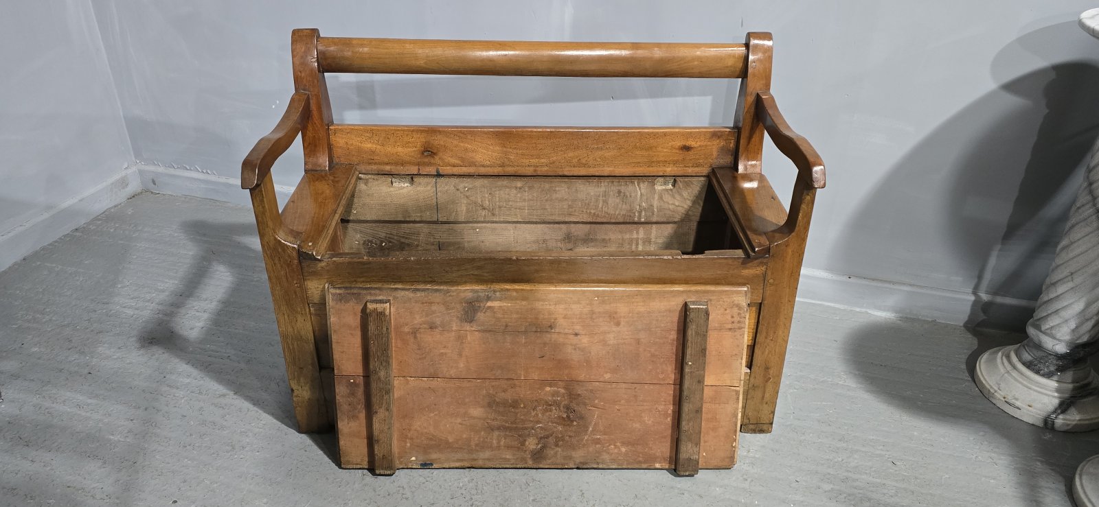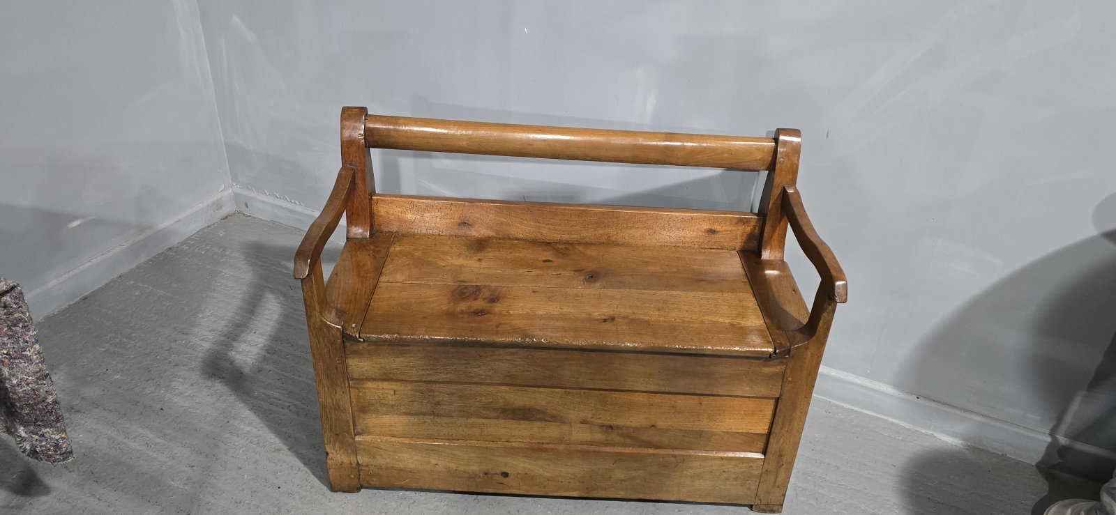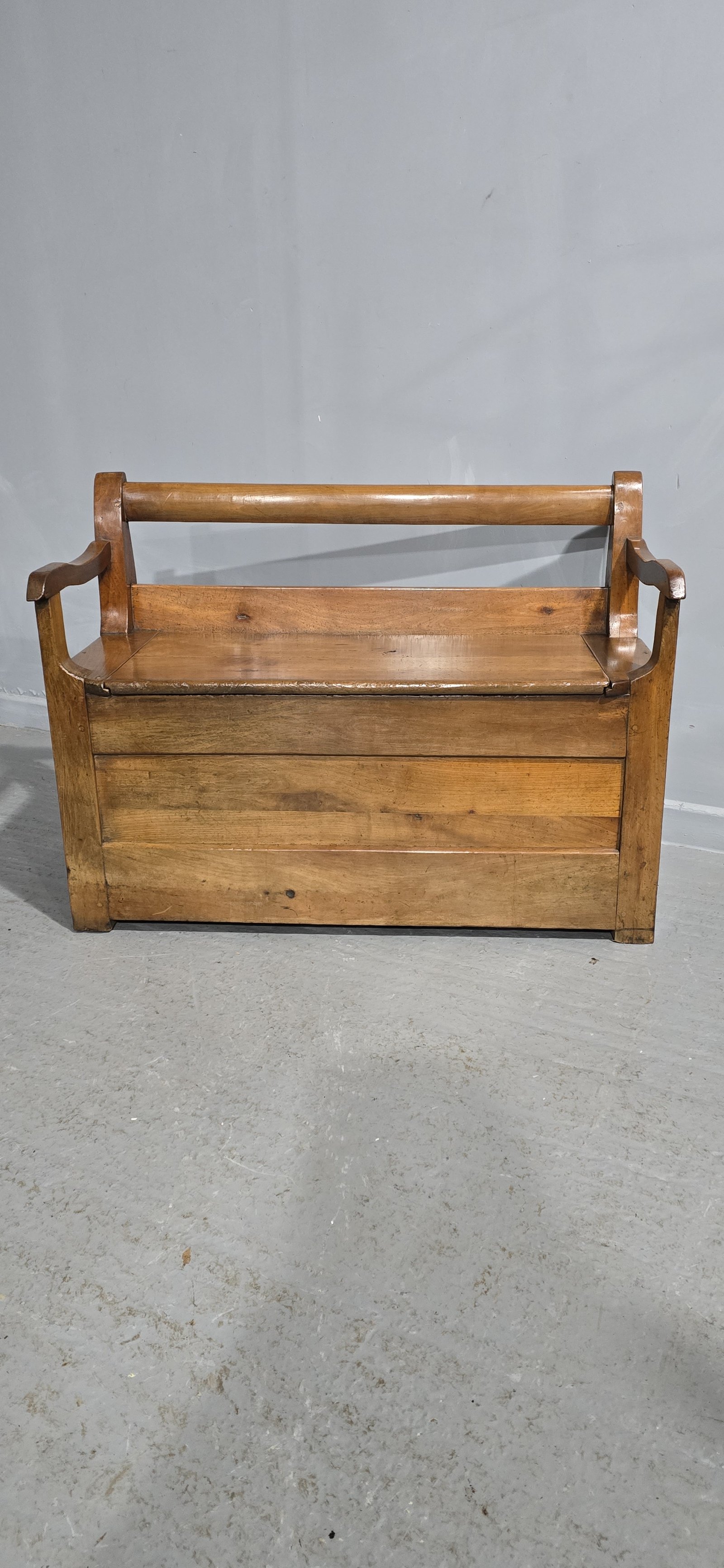 A super French cherrywood monks bench or hall bench, solid panels with lift and slide lid, excellent colour and lovely condition.
