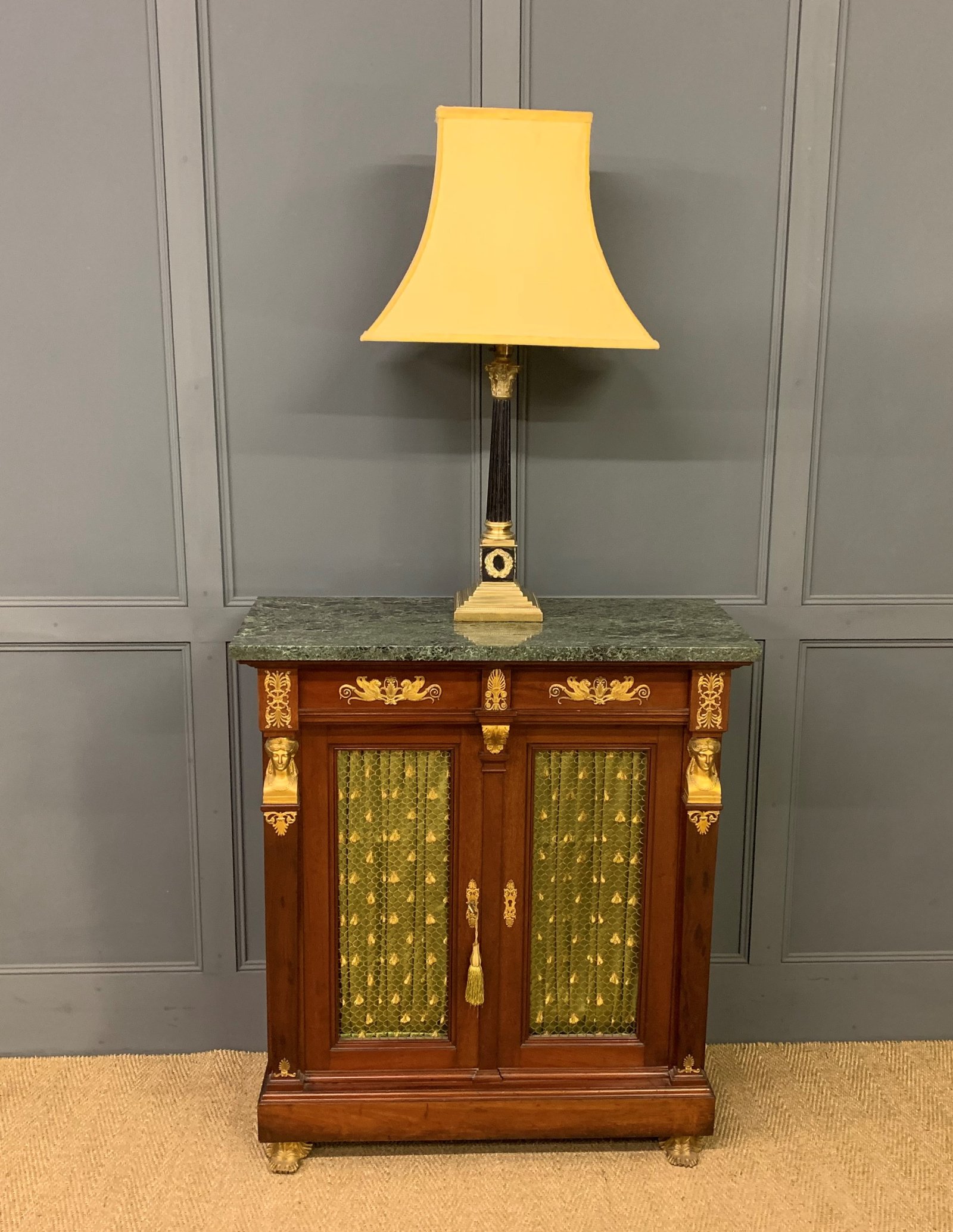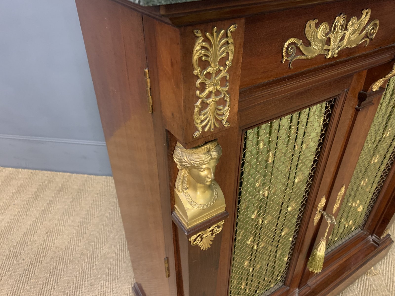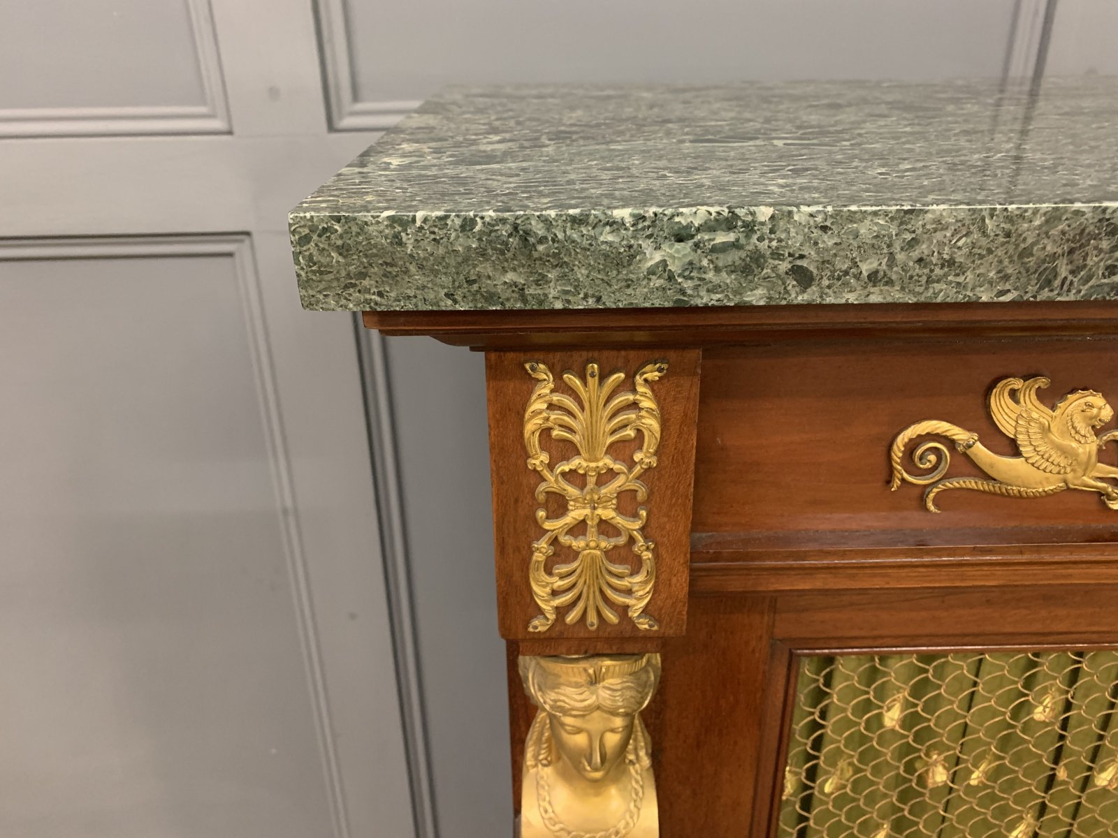 See shipping detailsA splendid 19th century mahogany French Empire chiffonier, or side cabinet. Of excellent construction in mahogany with a varigated blue/green marble top. Embellished with fine quality crisply cast ormolu mounts. With a pair of doors (lockable, key supplied) fitted with brass grills with silk material behind. The doors open to reveal a shelved interior and are flanked by a pair of monopodia topped with female busts and terminating in elaborate feet. This stunning cabinet is offered for sale in very good original condition.