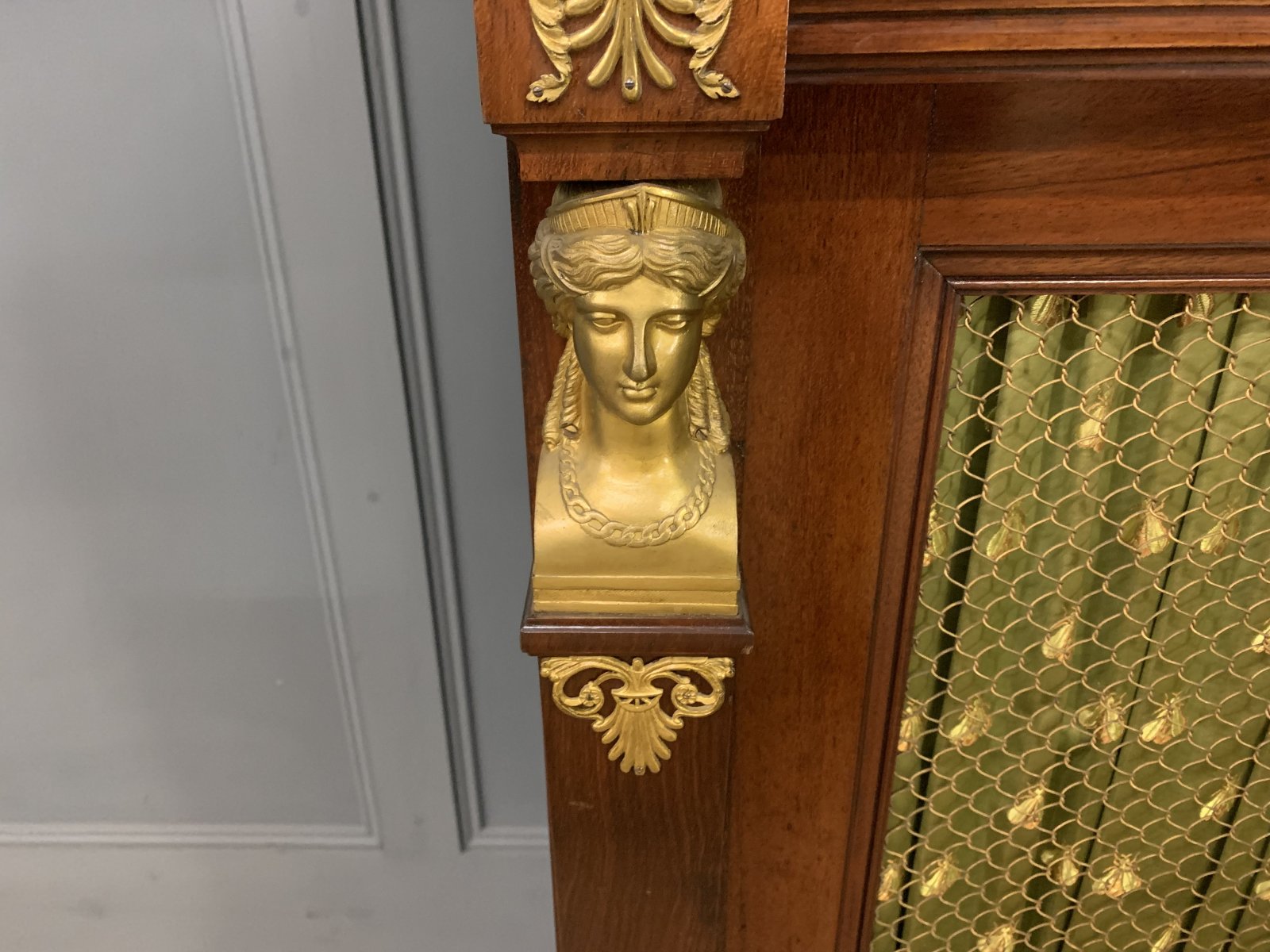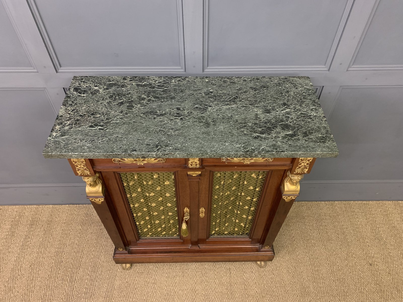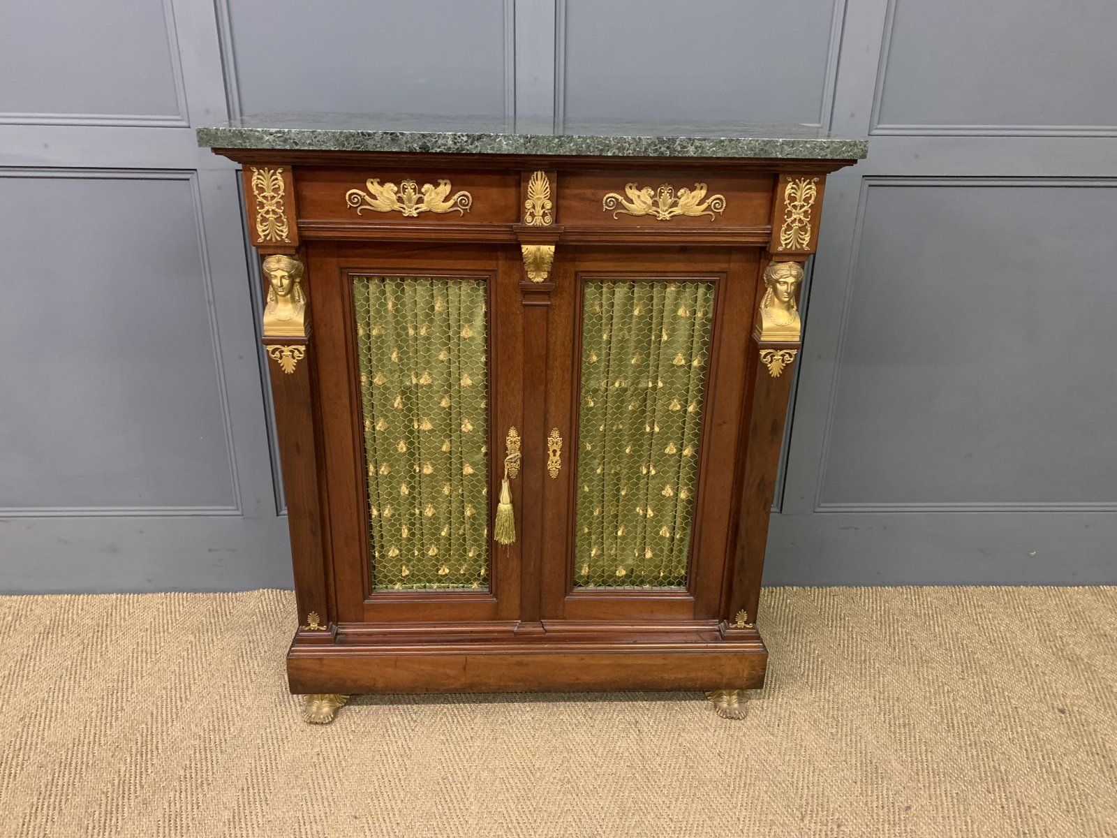 See shipping detailsA splendid 19th century mahogany French Empire chiffonier, or side cabinet. Of excellent construction in mahogany with a varigated blue/green marble top. Embellished with fine quality crisply cast ormolu mounts. With a pair of doors (lockable, key supplied) fitted with brass grills with silk material behind. The doors open to reveal a shelved interior and are flanked by a pair of monopodia topped with female busts and terminating in elaborate feet. This stunning cabinet is offered for sale in very good original condition.