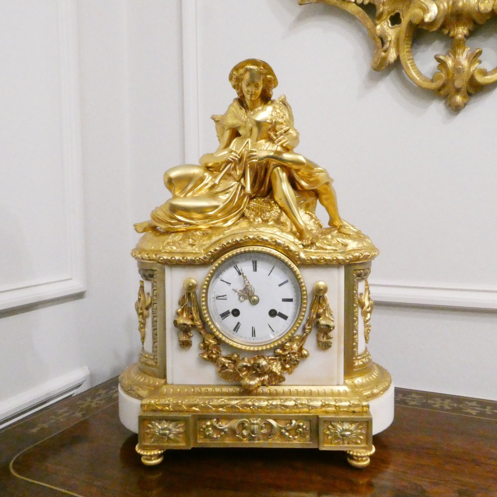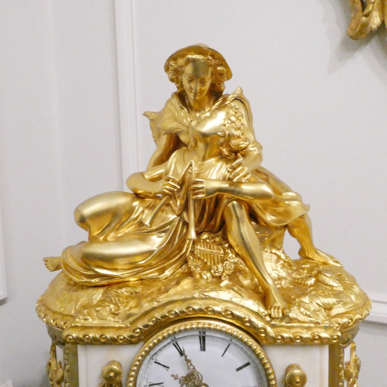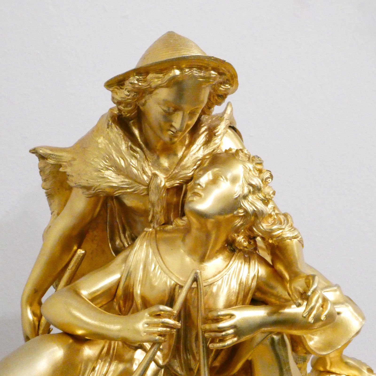 See shipping detailsA superb quality French mid 19th century bronze gilt mantel clock with beautifully cast Greek mythological male figure of Paris, The Shepherd, accompanied by a female goddess.