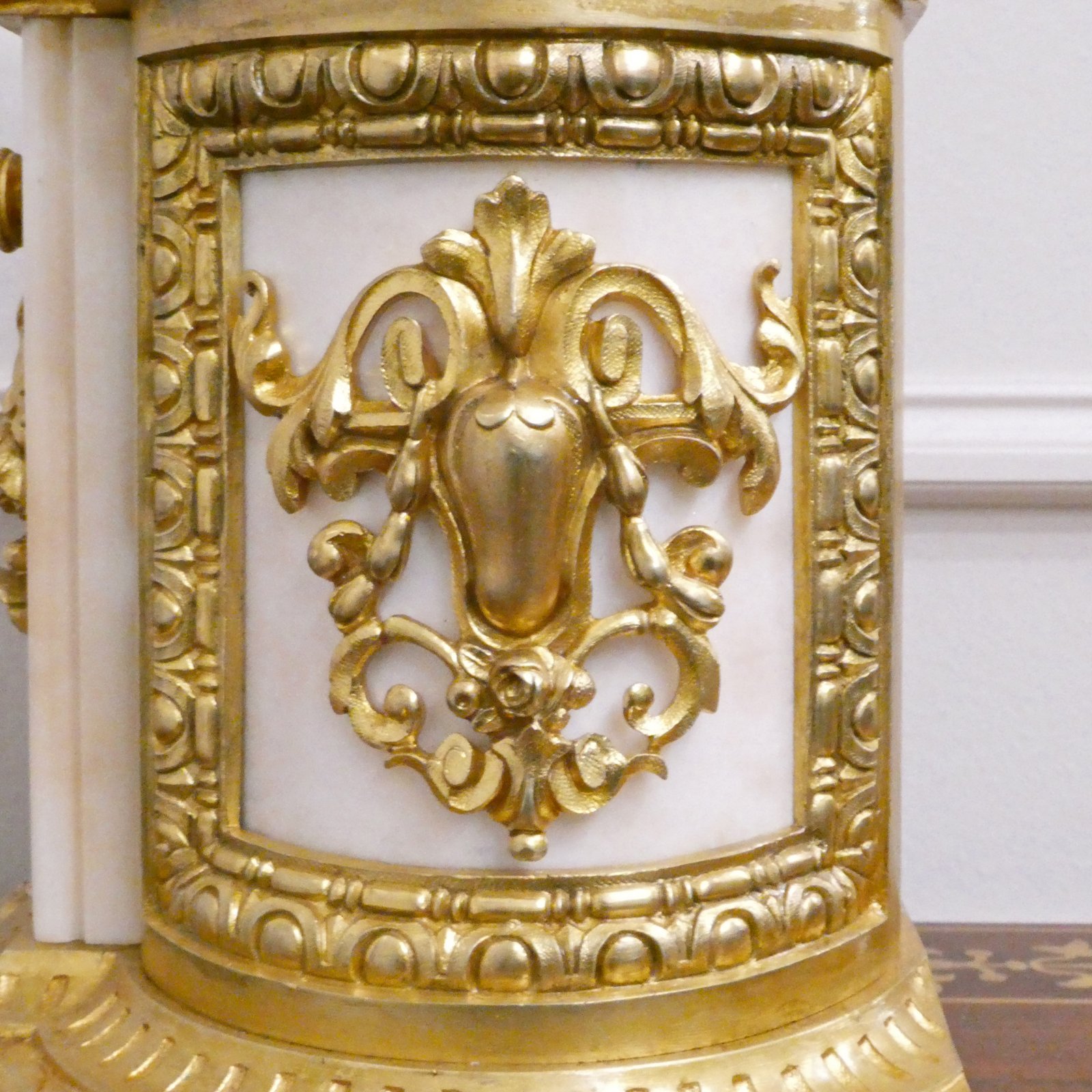 The clock has a white marble body and plinth, and it is adorned with floral garland, laurel leaf and egg and dart moulding. The clock has a beaded bezel and a white enamel dial with Roman numerals.