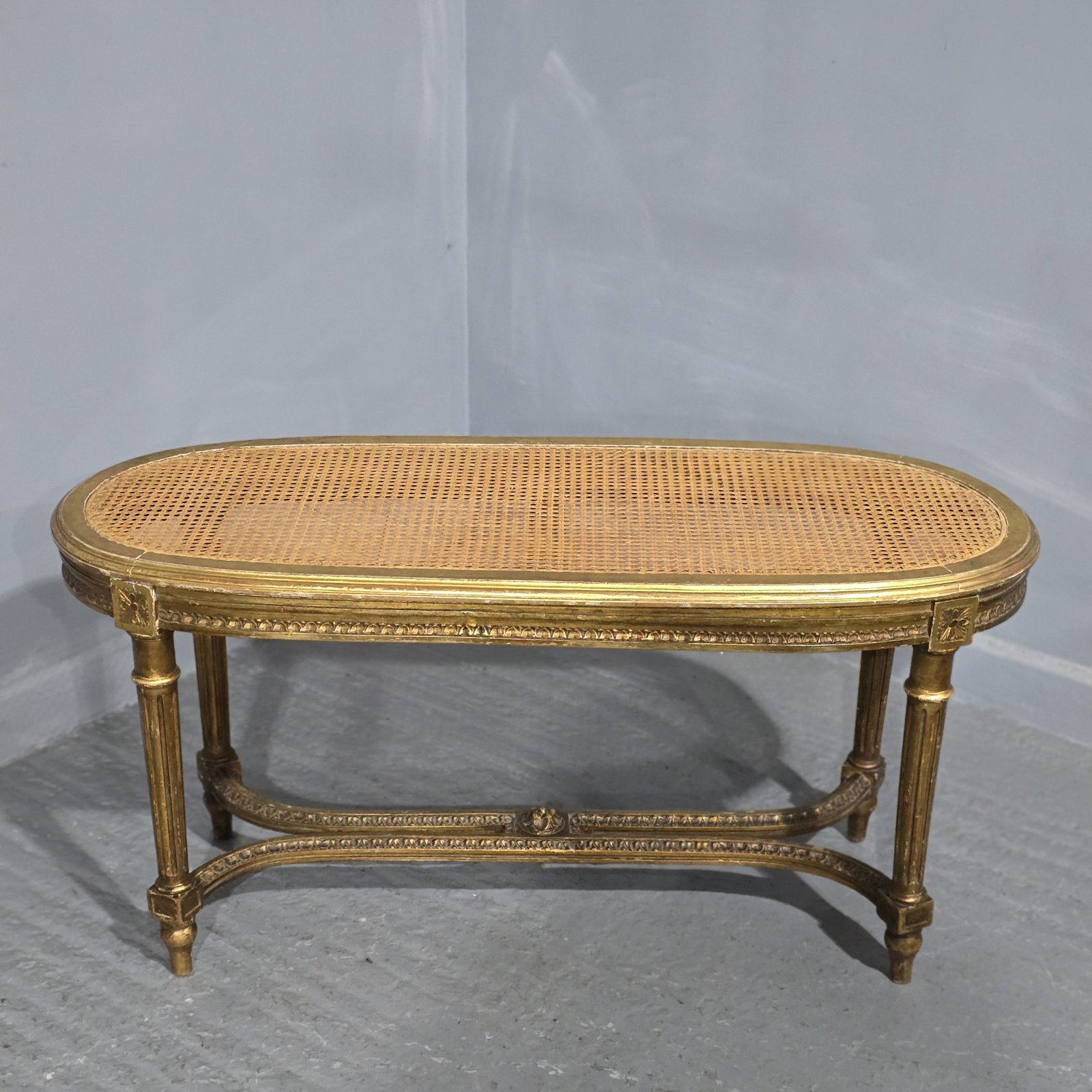Very nice French gilt duet or footboard stool, with bergere cane top and green silk seat pad, in very good overall condition.
