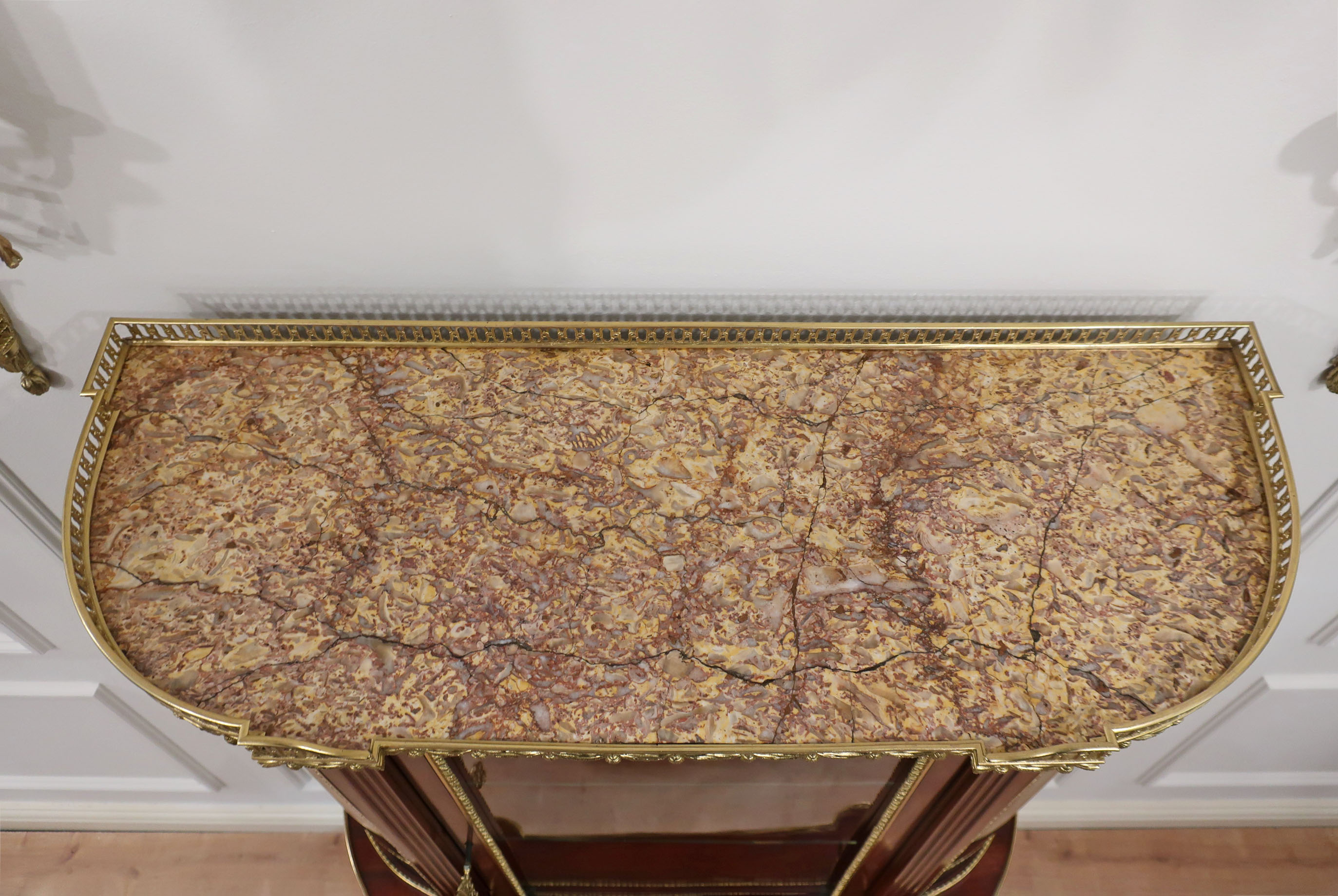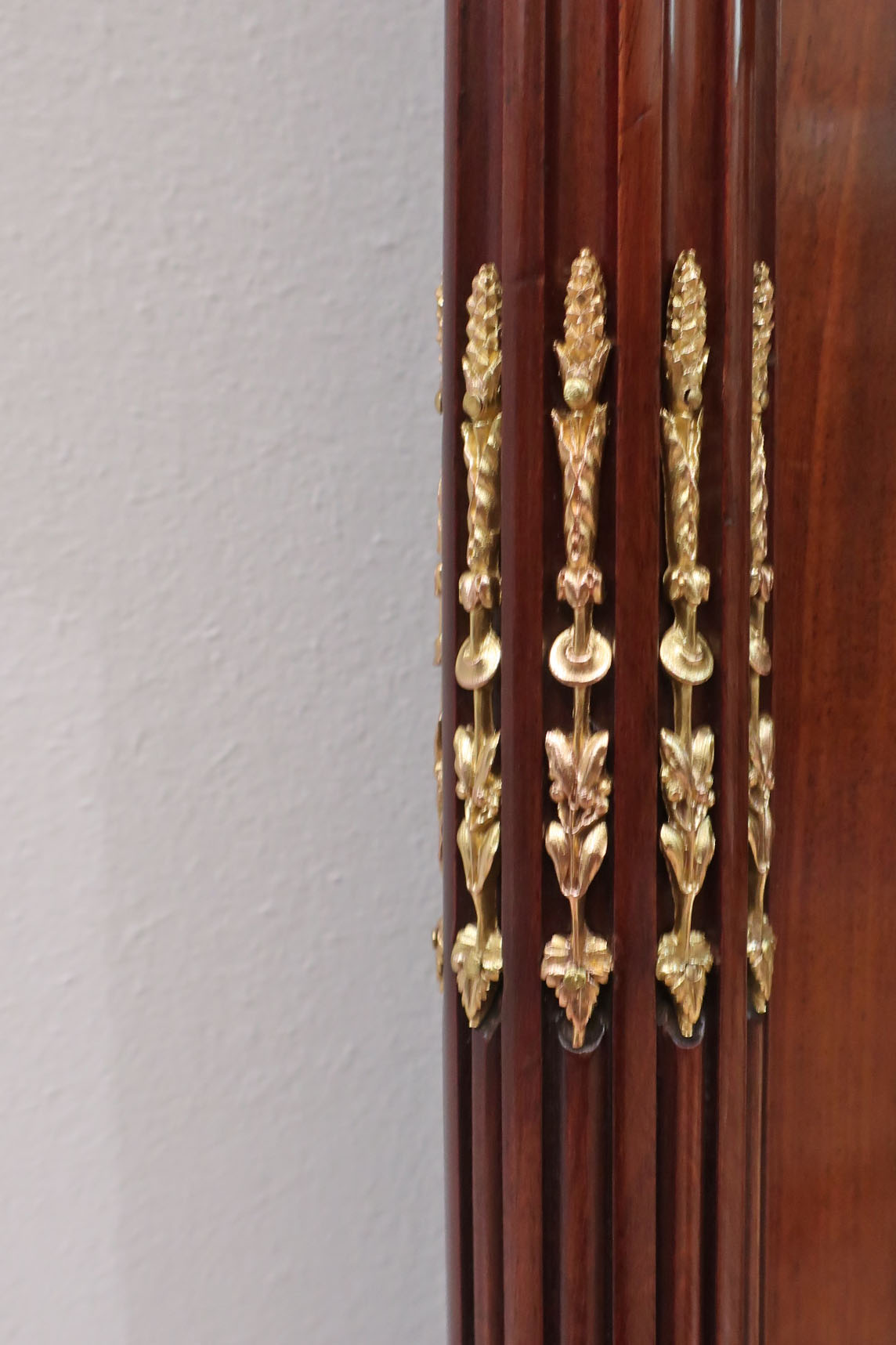 The cabinet has an open display base and is stood on turned tapering fluted and stop reeded legs and is fitted with the finest quality bronze gilt mounts and mouldings throughout. The top section of the cabinet is fitted with an open pierced bronze gilt gallery.