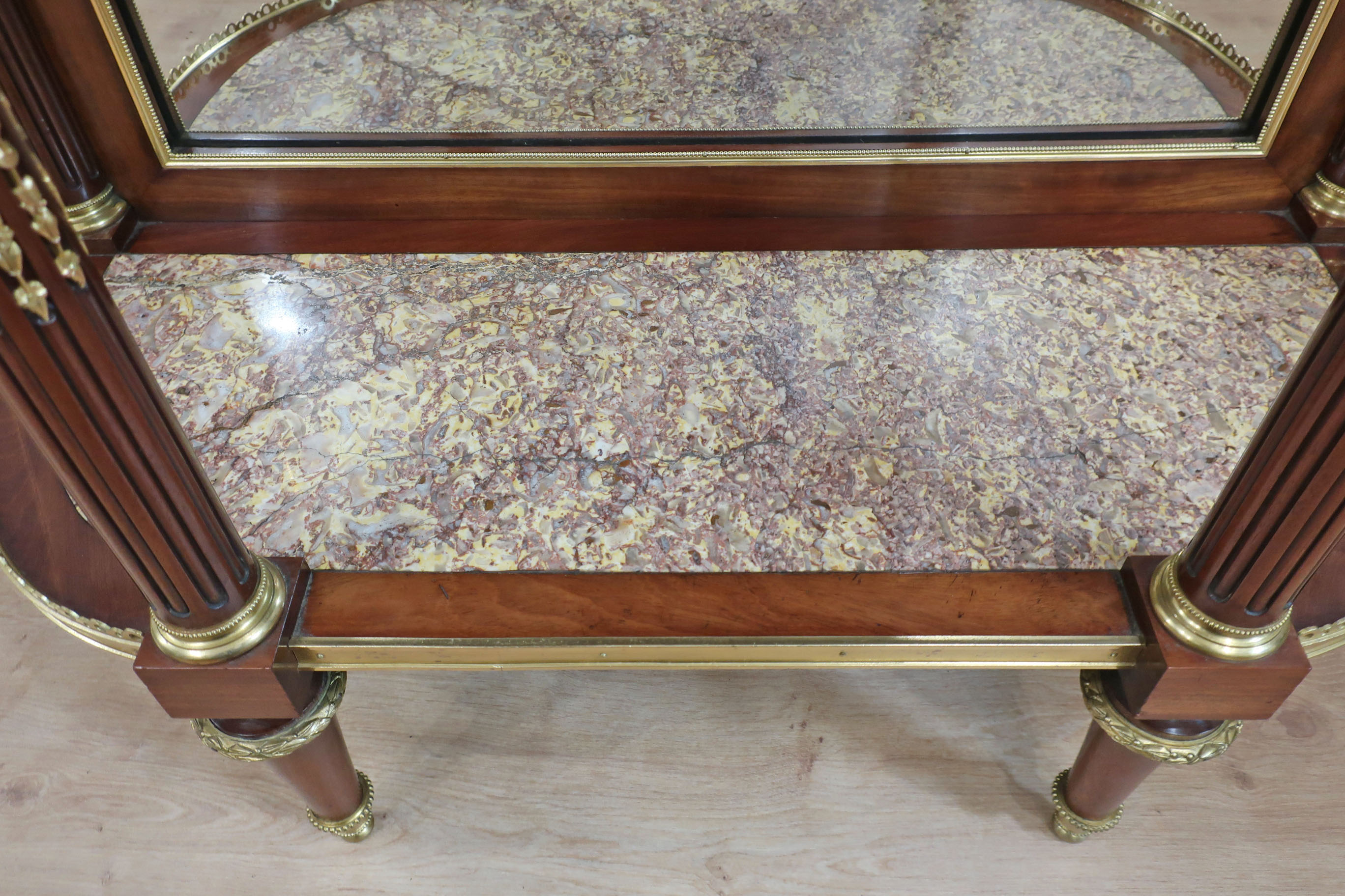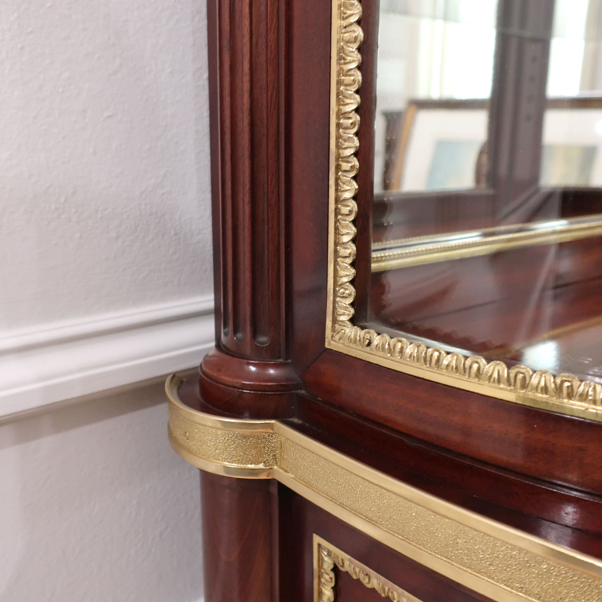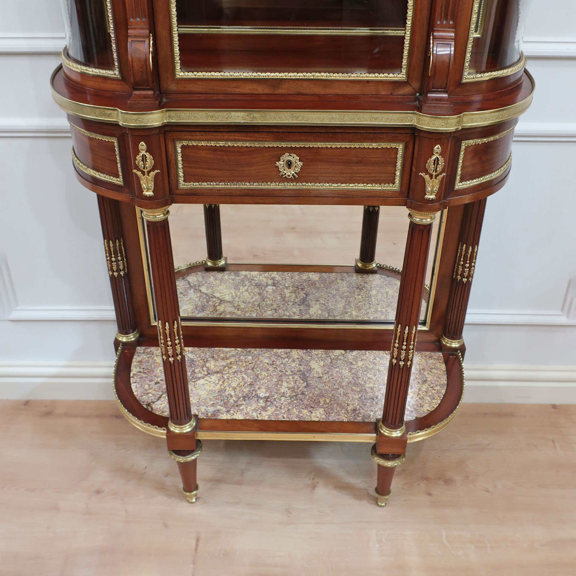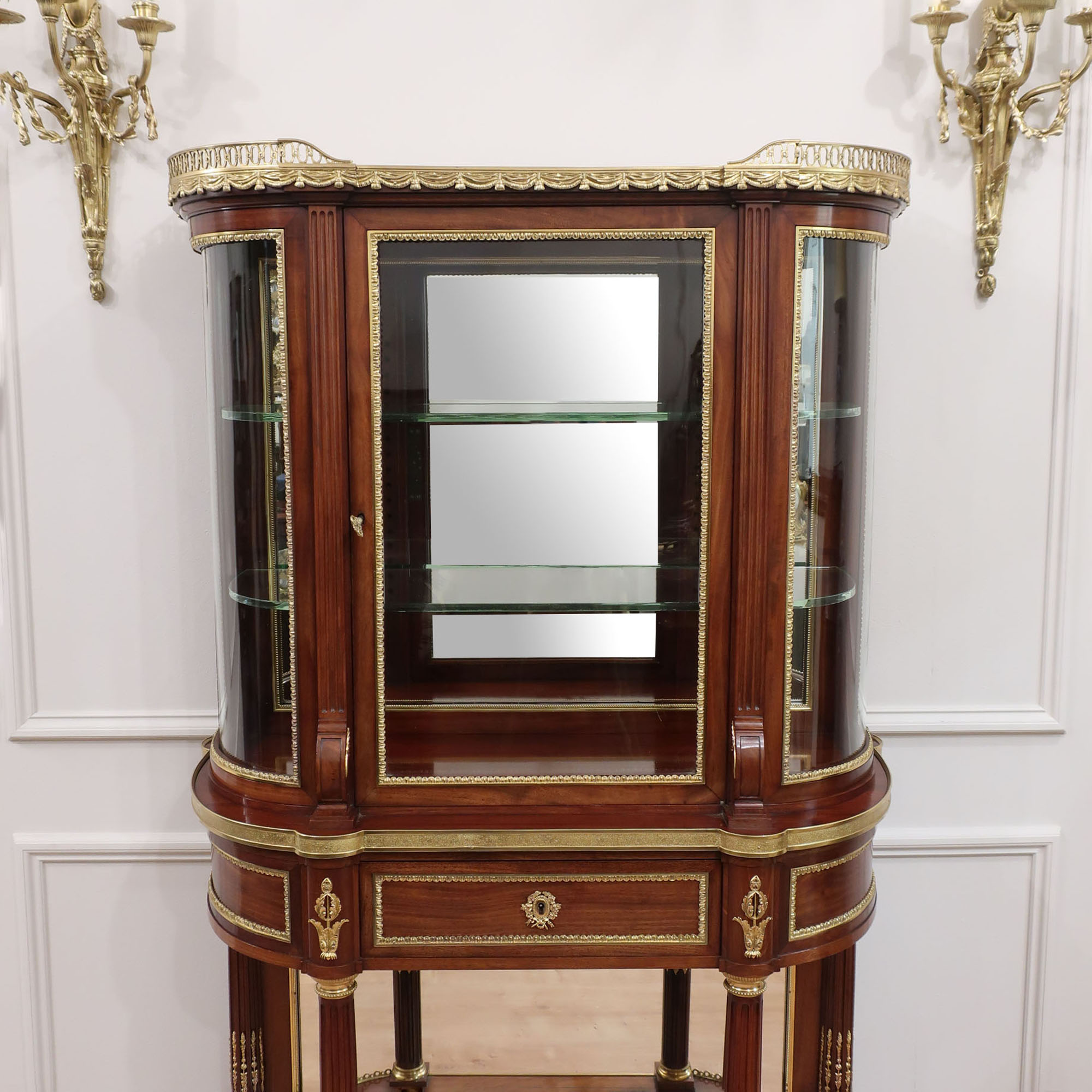 A magnificent French mahogany antique vitrine display cabinet in the Louis XVI style with bowed ends, original mirror back and glass shelves with a drawer to the front.