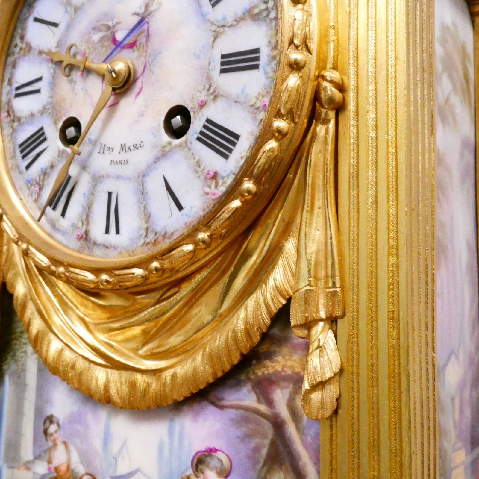 There are beautifully hand painted inset porcelain panels to the case with classical and landscape scenes. The porcelain dial is also hand painted with fine floral leaf design, Roman numerals, and it has the retailers name -
