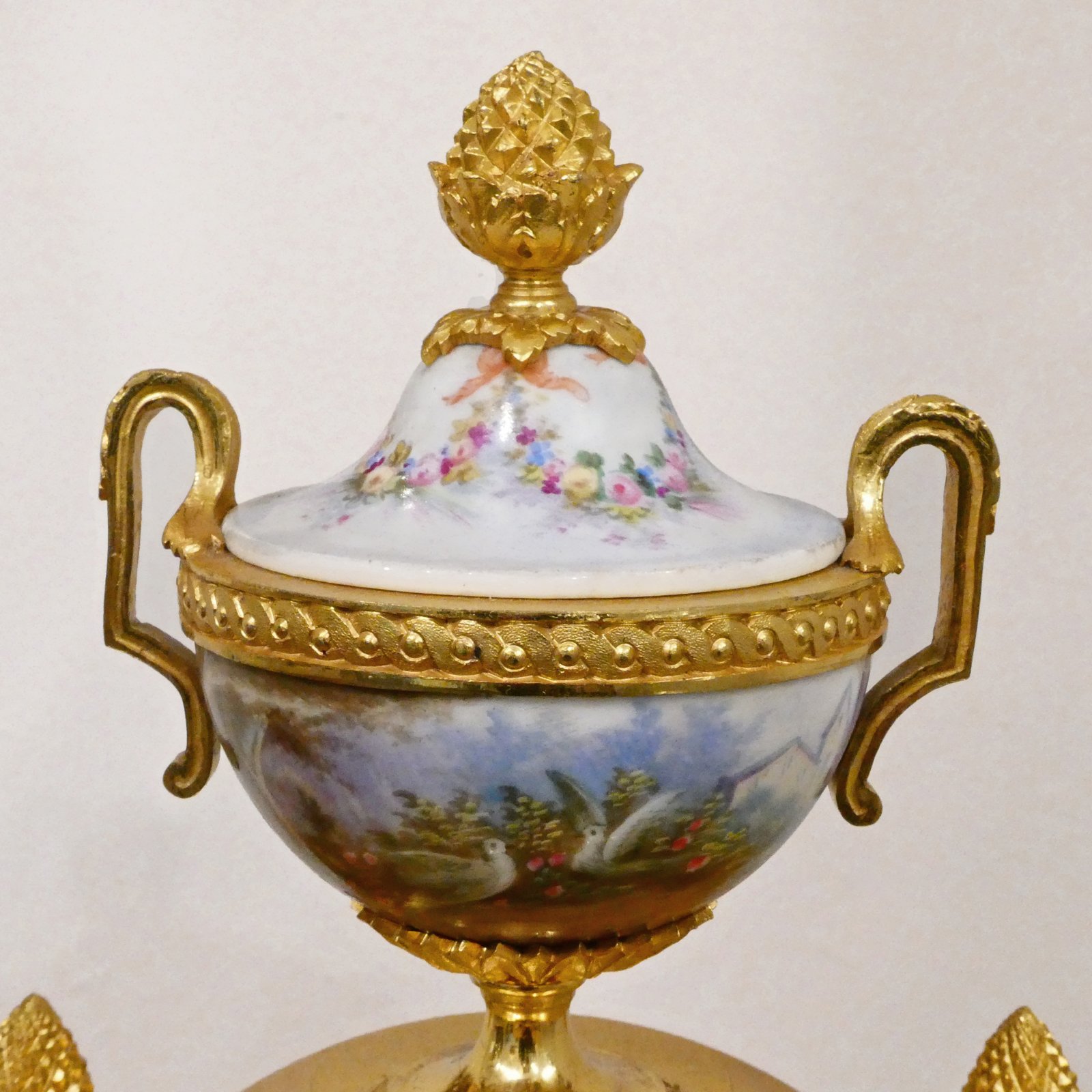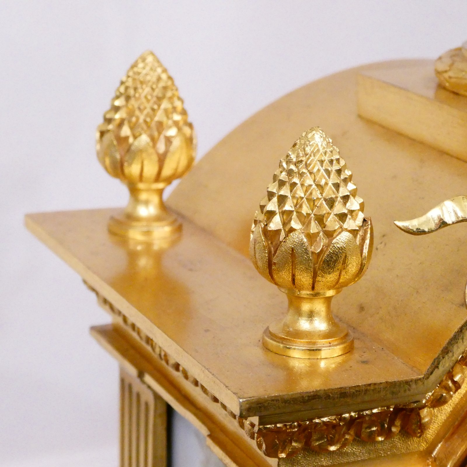 A French Louis XVI style gilt bronze and porcelain mantel clock of superb quality dating from the mid 19th century. The finely cast case has acanthus leaf moulding and entwined leaf design, fluted columns, ribbon, fabric swags and pineapple finials to the top. The clock is surmounted with a porcelain urn, delicately hand painted with doves and floral design, flanked by two foliate handles and finished with finial to the top.