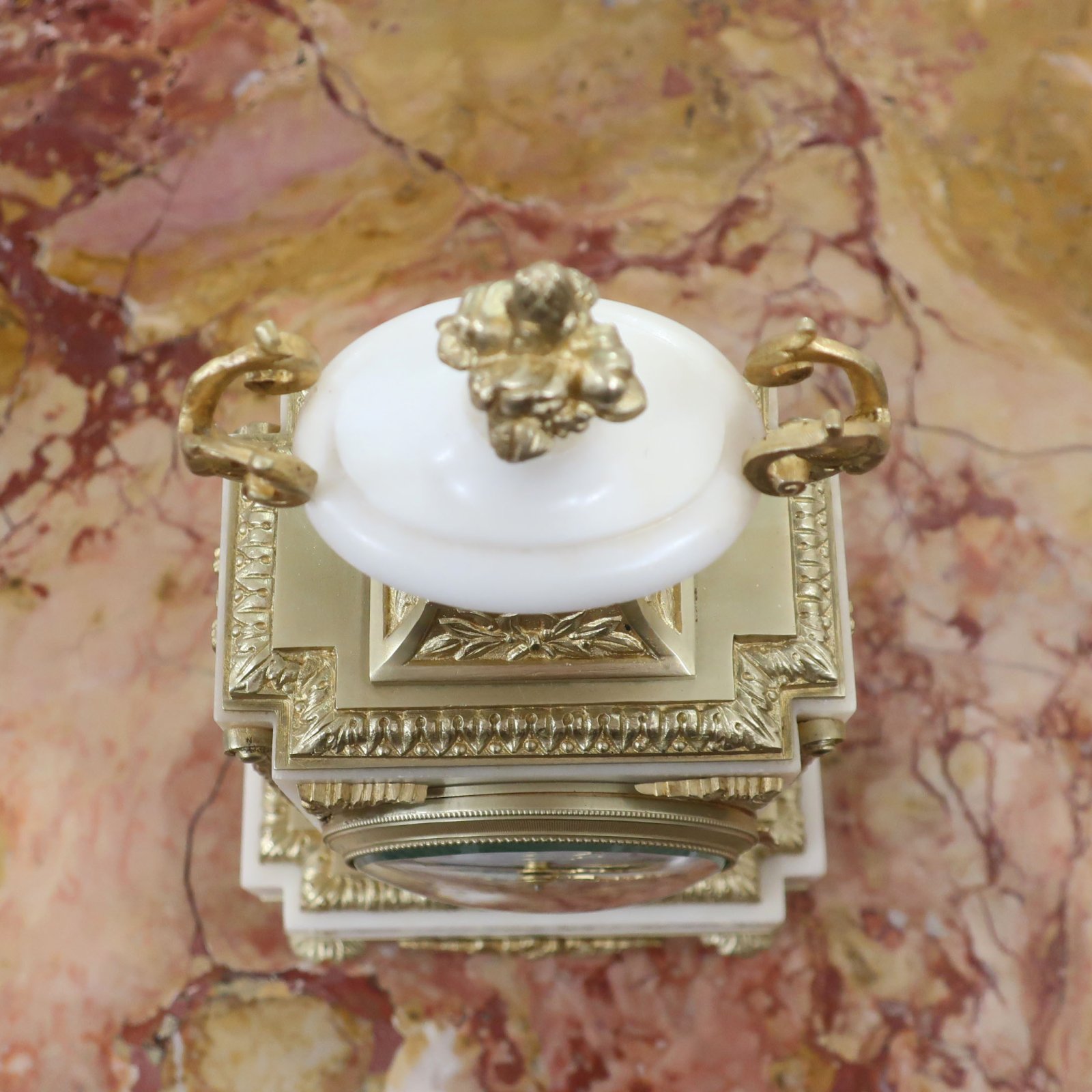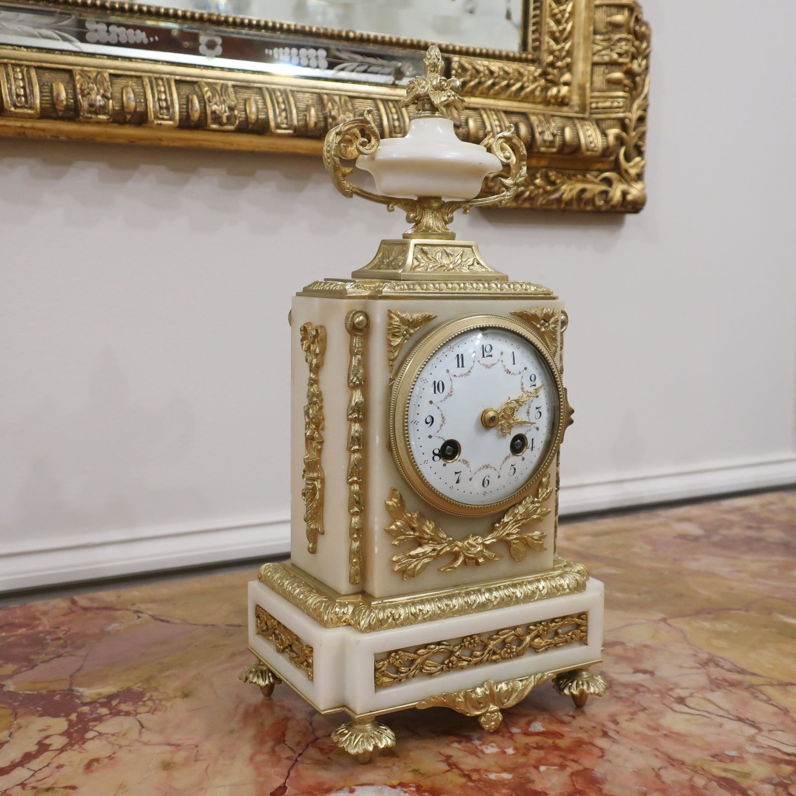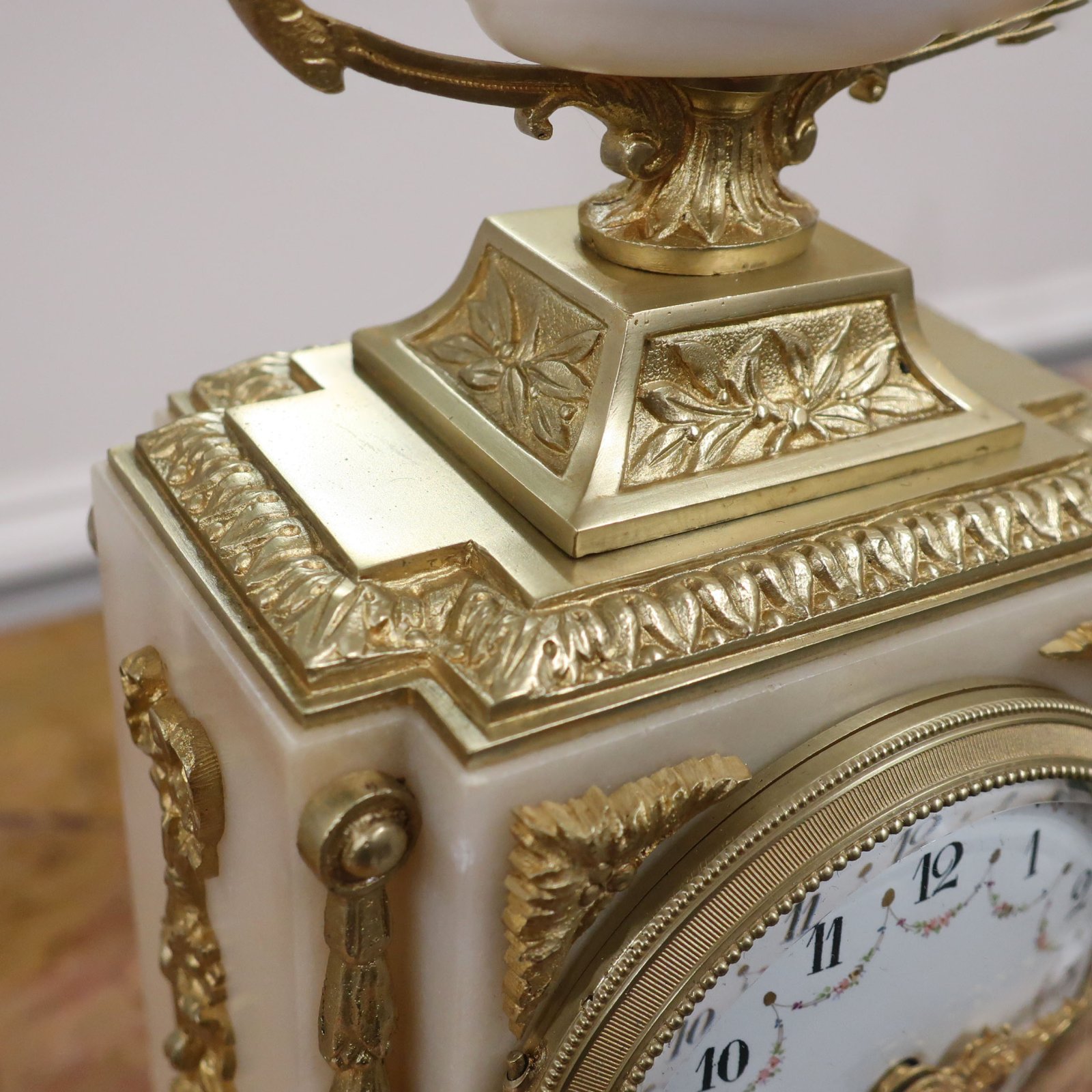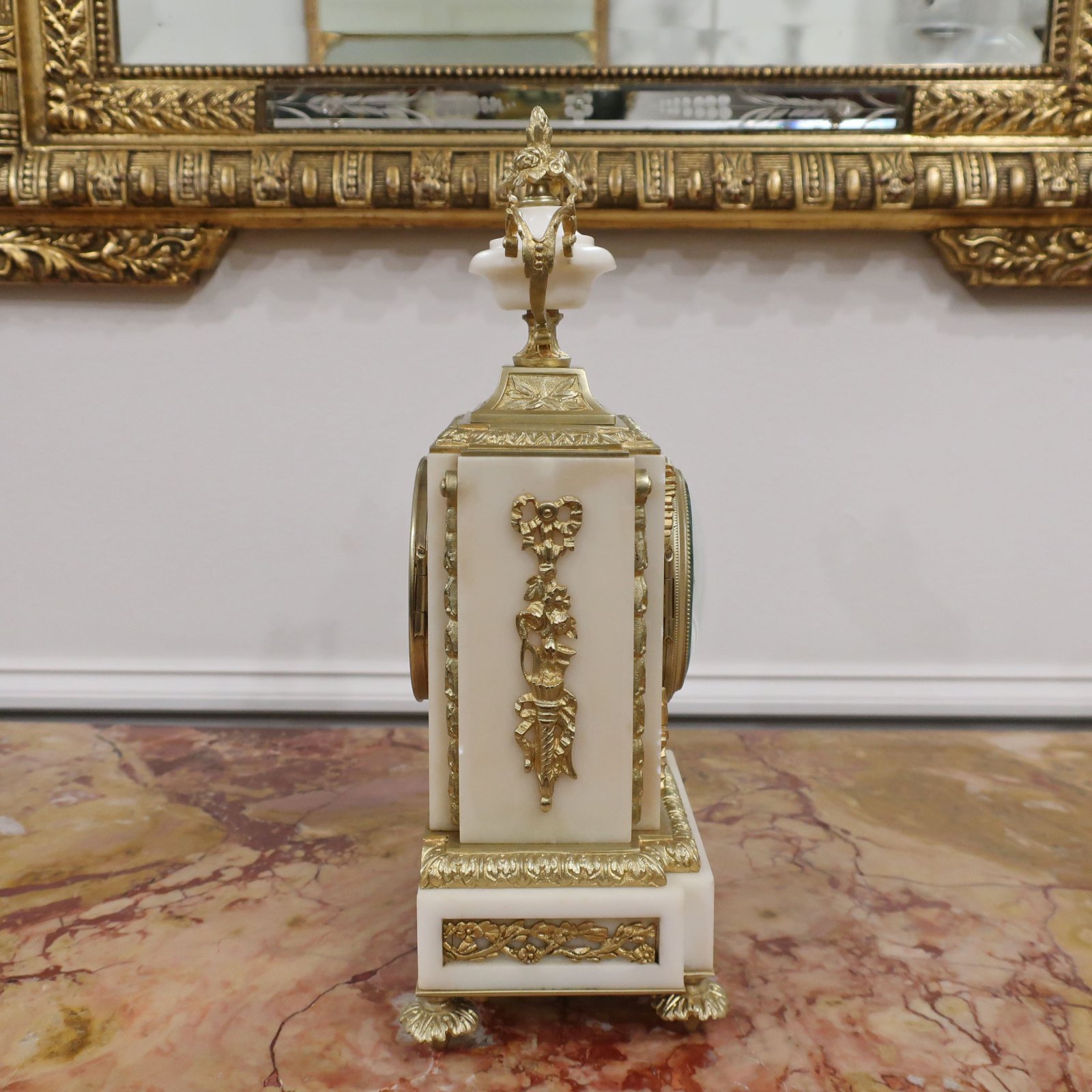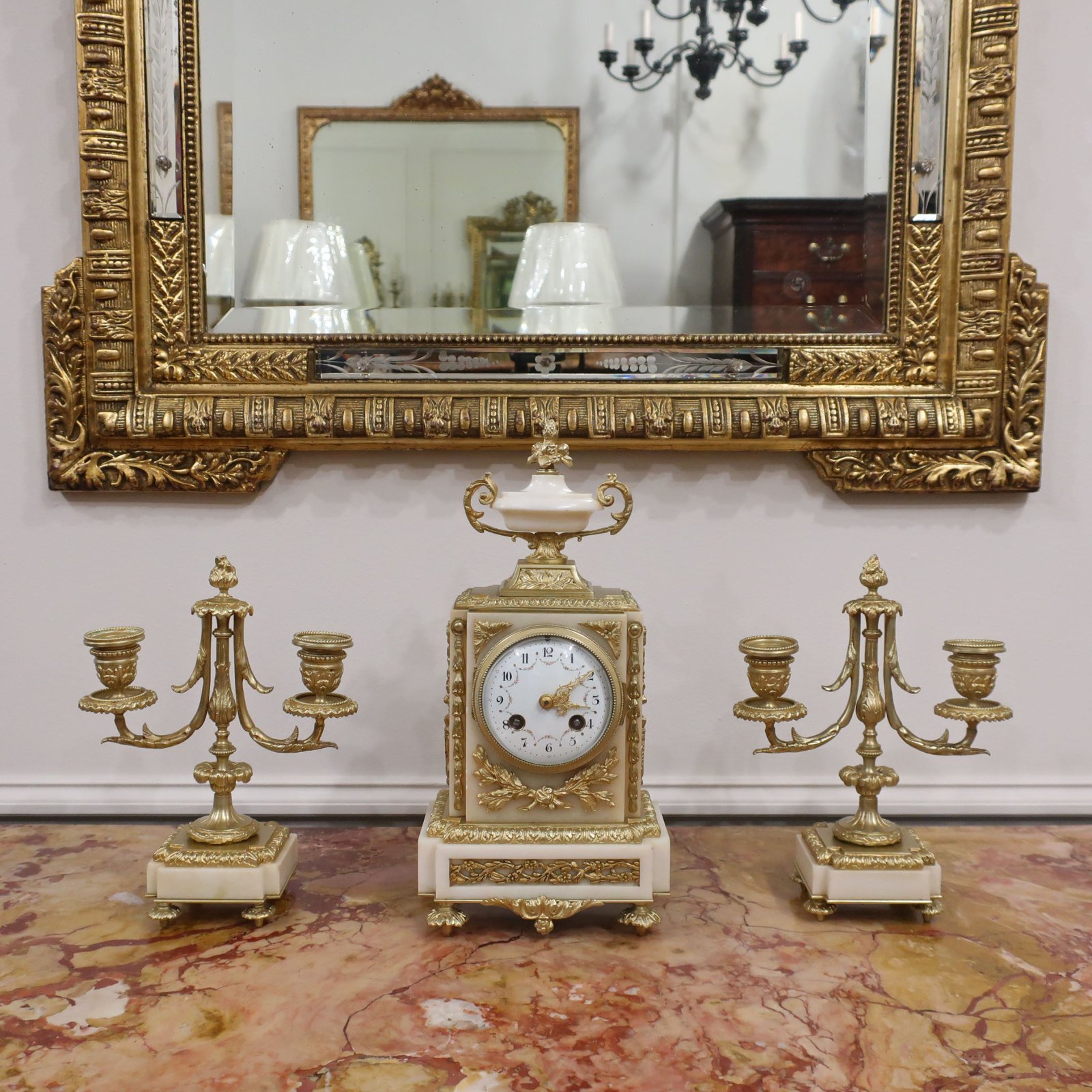 A fine quality French Louis XVI style white marble antique clock set comprising of a mantel clock and a pair of candelabra garnitures which are adorned with bronze gilt ormolu mounts. The clock case has laurel leaf mounts and acanthus leaf mouldings with ribbon, flower and torch mounts to the sides and pierced entwined floral inset mounts to the base. The clock stands on toupie shaped feet and is finished with an urn to the top.