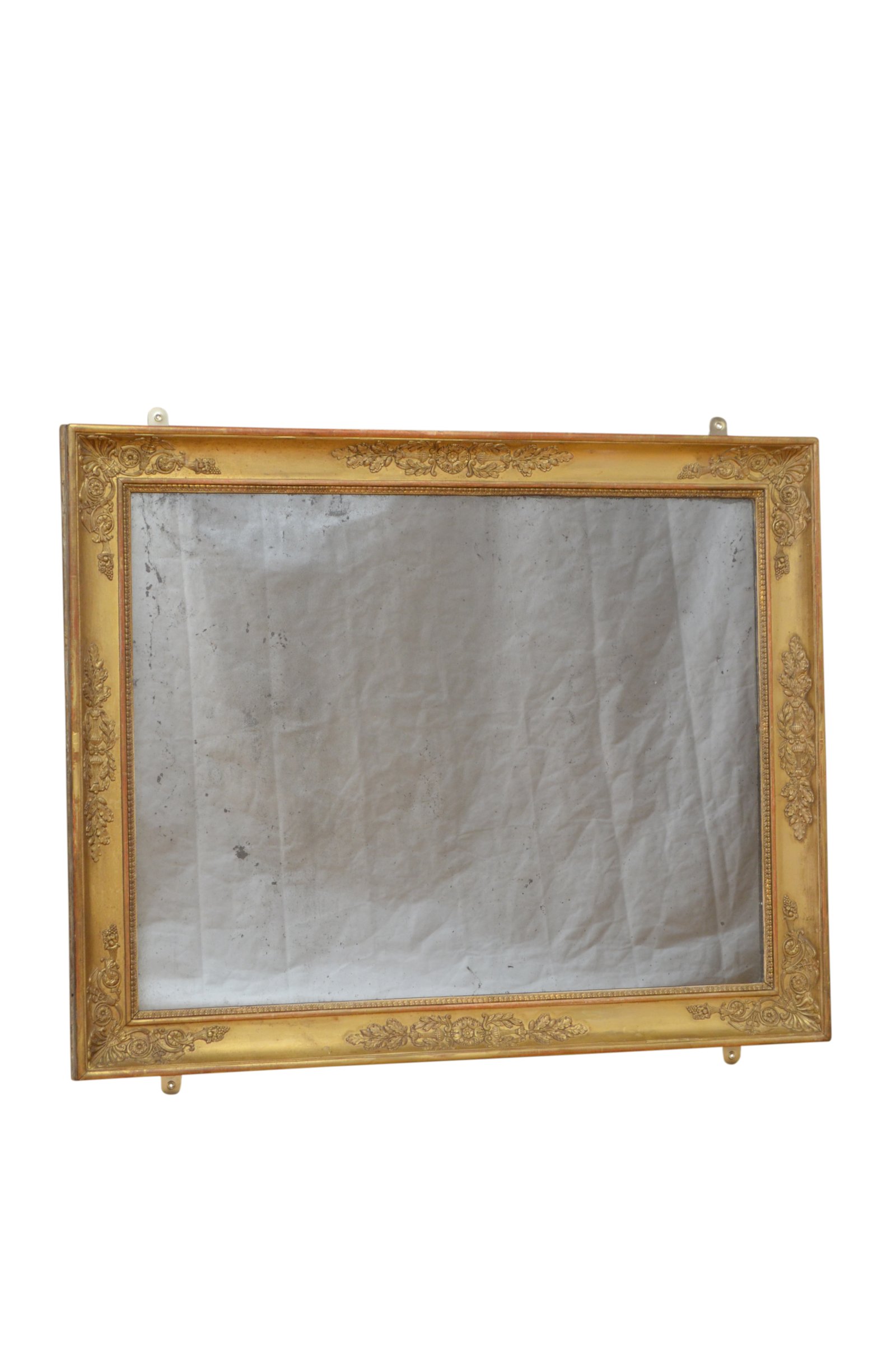 P0150 Fine XIXth century gilded wall mirror which can be positioned horizontally or vertically, having foxed glass in carved gilt frame decorated with intricate floral designs including oak leaf with acorns, horn of plenty and caduceus which is the staff carried by Hermes in Greek mythology. This antique mirror retains its original gilt and original glass, all in excellent home ready condition fitted with a hanging brackets. No missing element, no loose decoration, woodworm free. All in good honest condtion.c1830