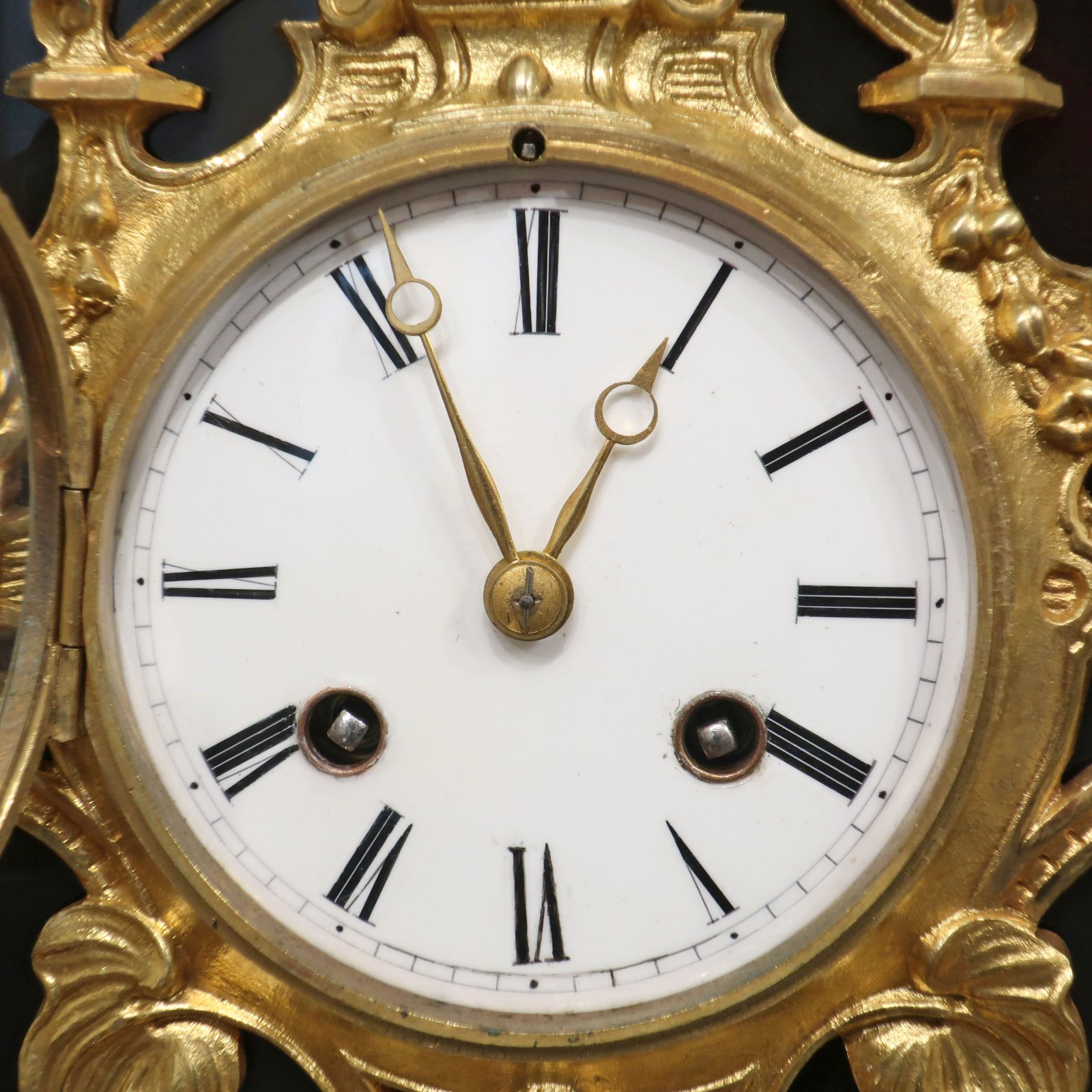 The clock has a white enamel dial with Roman numerals and a French eight day movement which strikes the hours and half hours on a bell with outside count wheel.