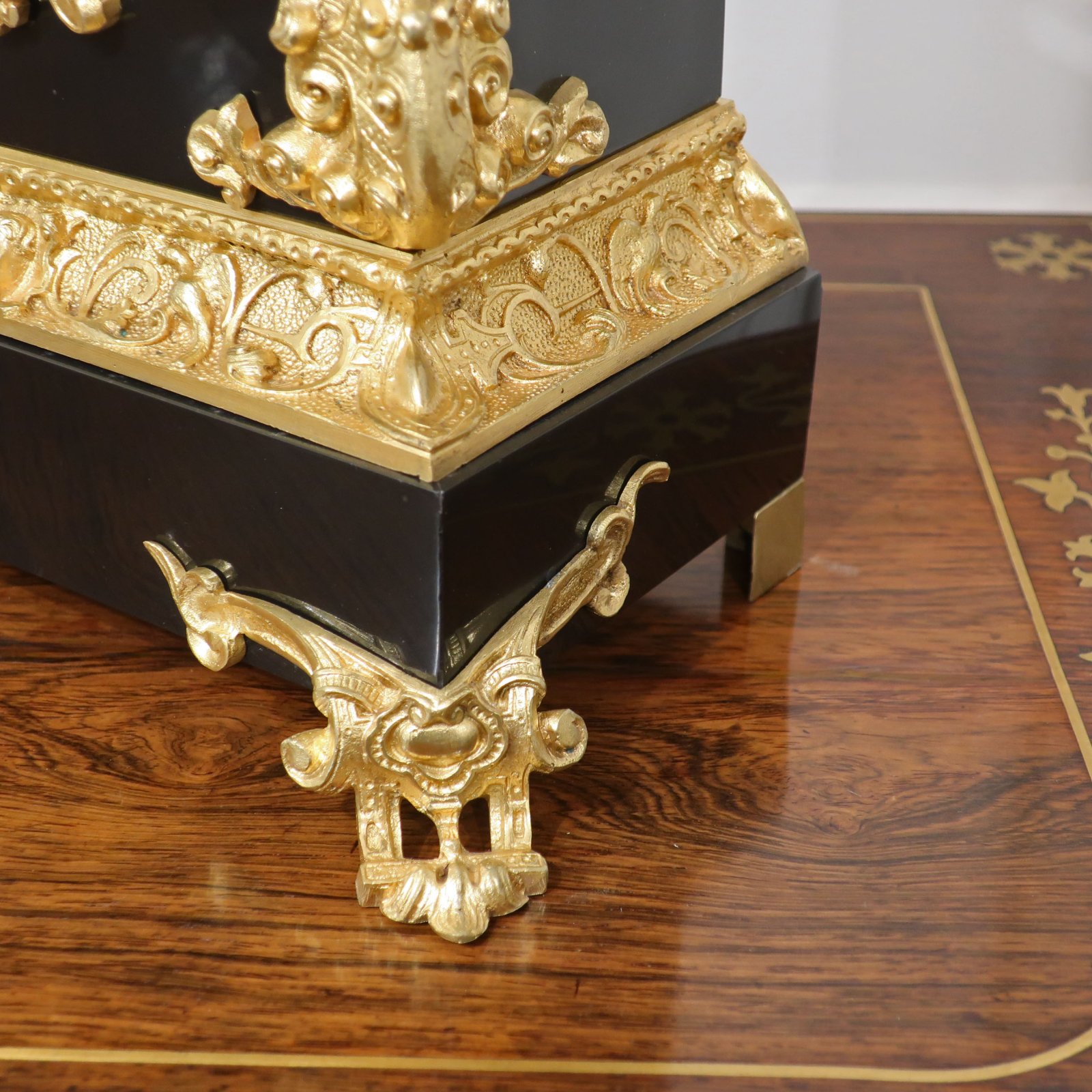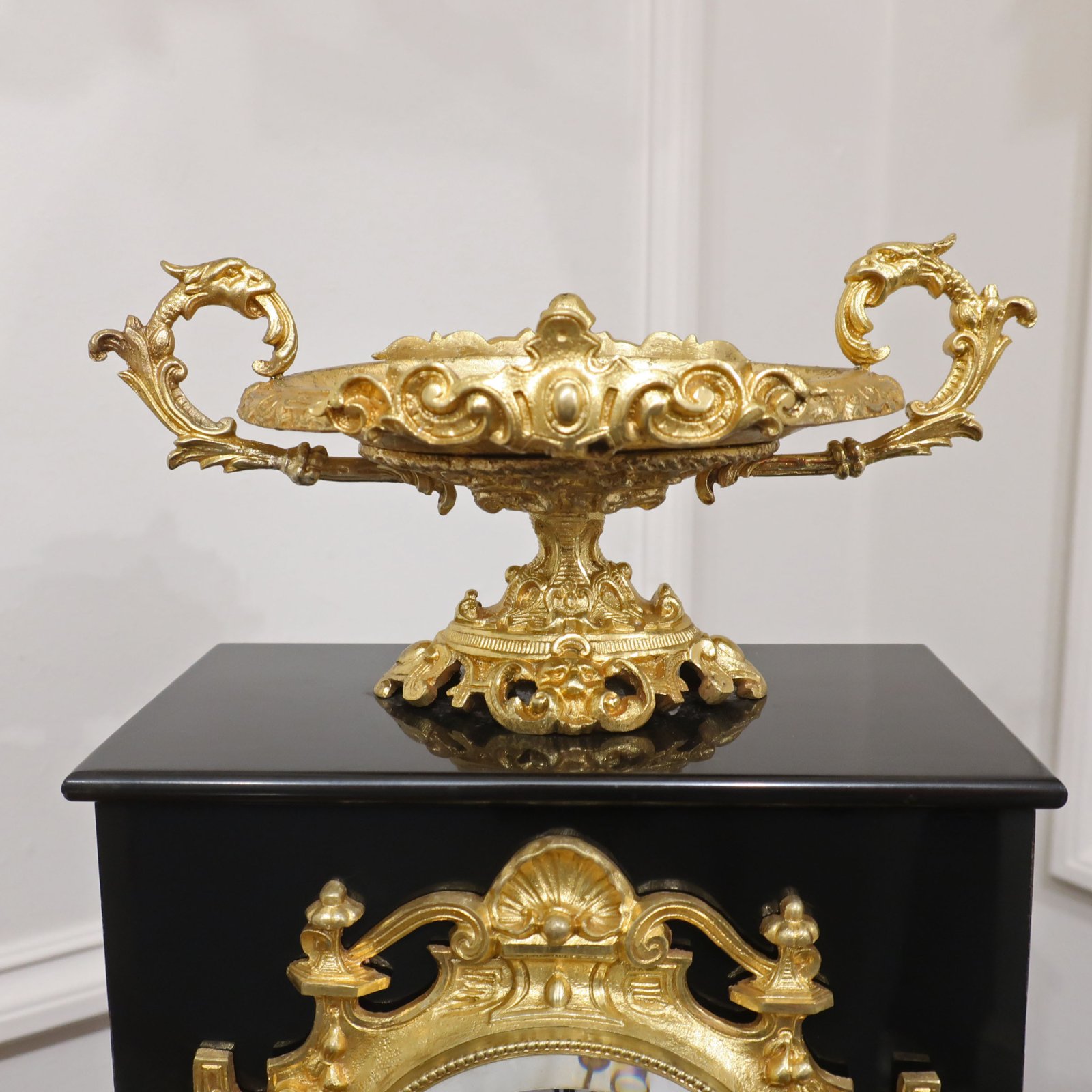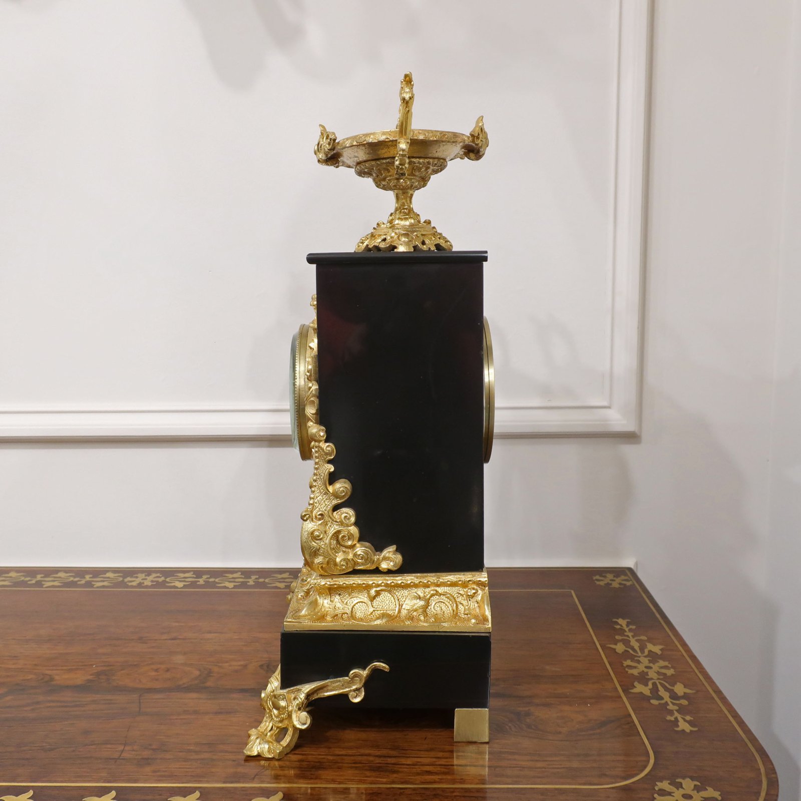 An extremely good quality French polished black slate mantel clock with scrolling bronze gilt rococo style mounts and moulds. The case features shell detail, cherub mask, birds and swags stood on bracket feet surmounted with urn with phoenix handles to the top.