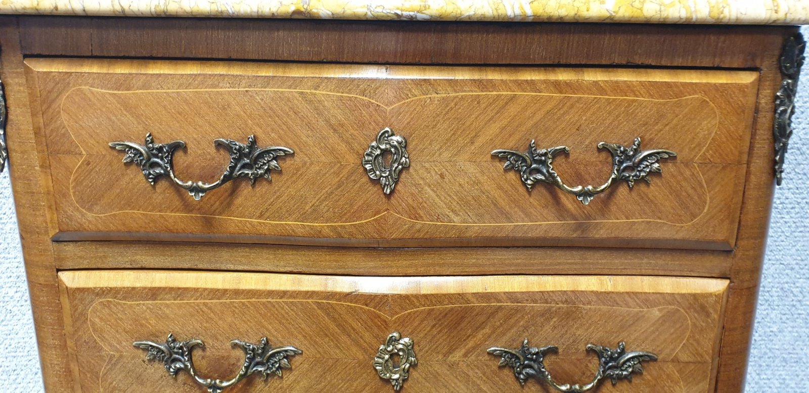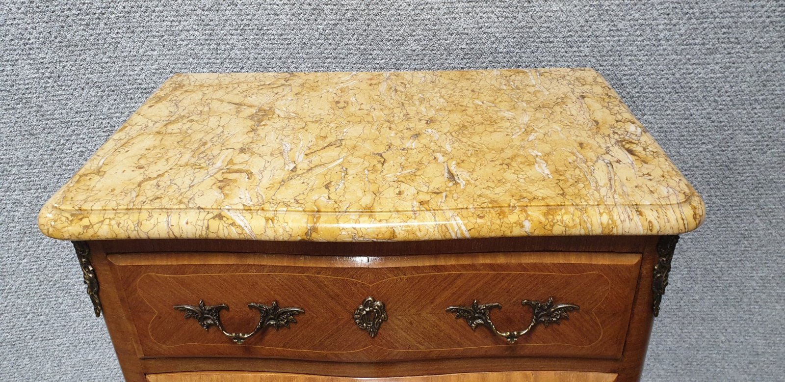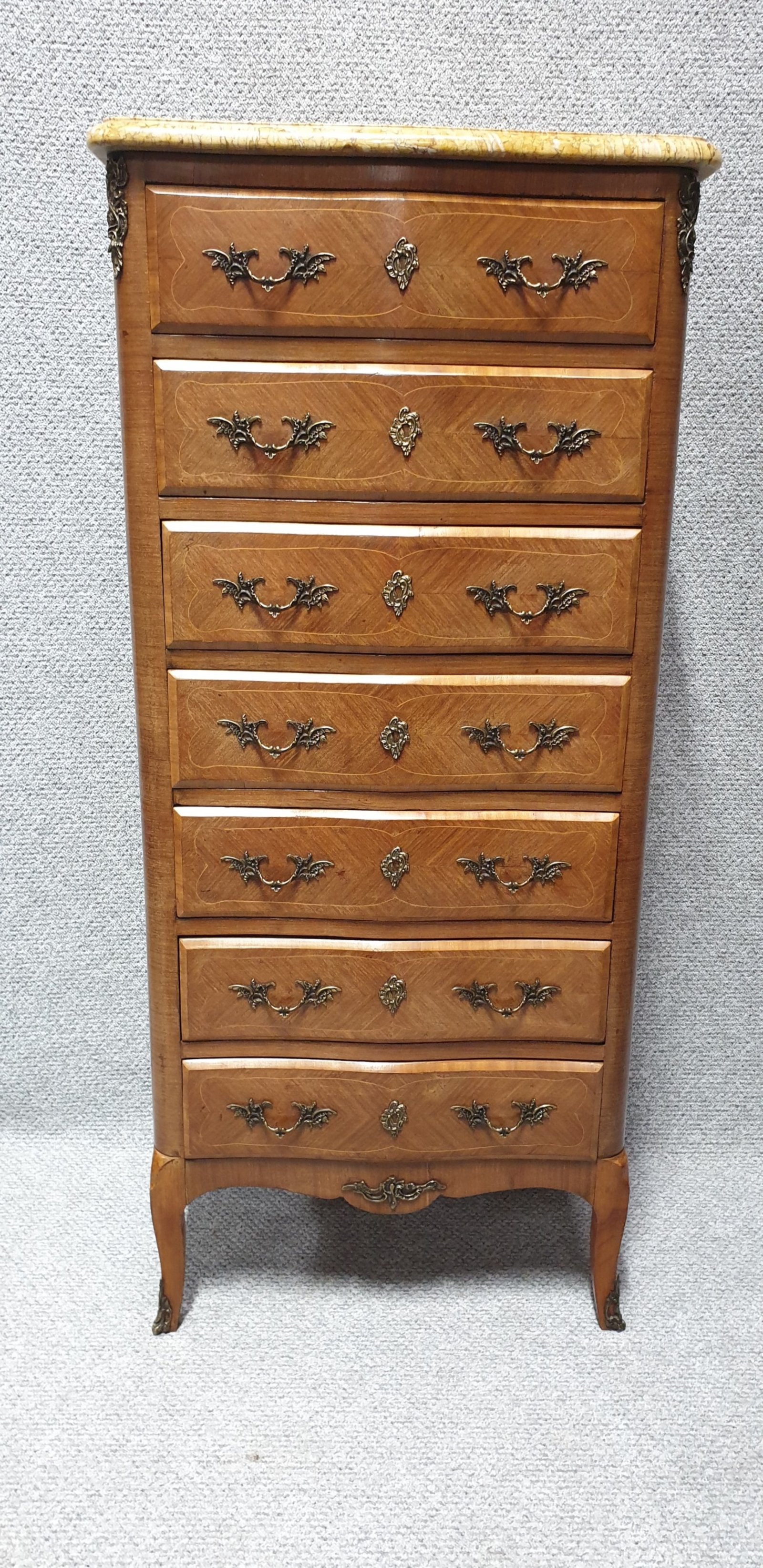 A very nice seven drawer chest of drawers; tulipwood inlaid with boxwood, brass handles and mounts, slight serpentine drawers, super marble top, in overall very good condition.