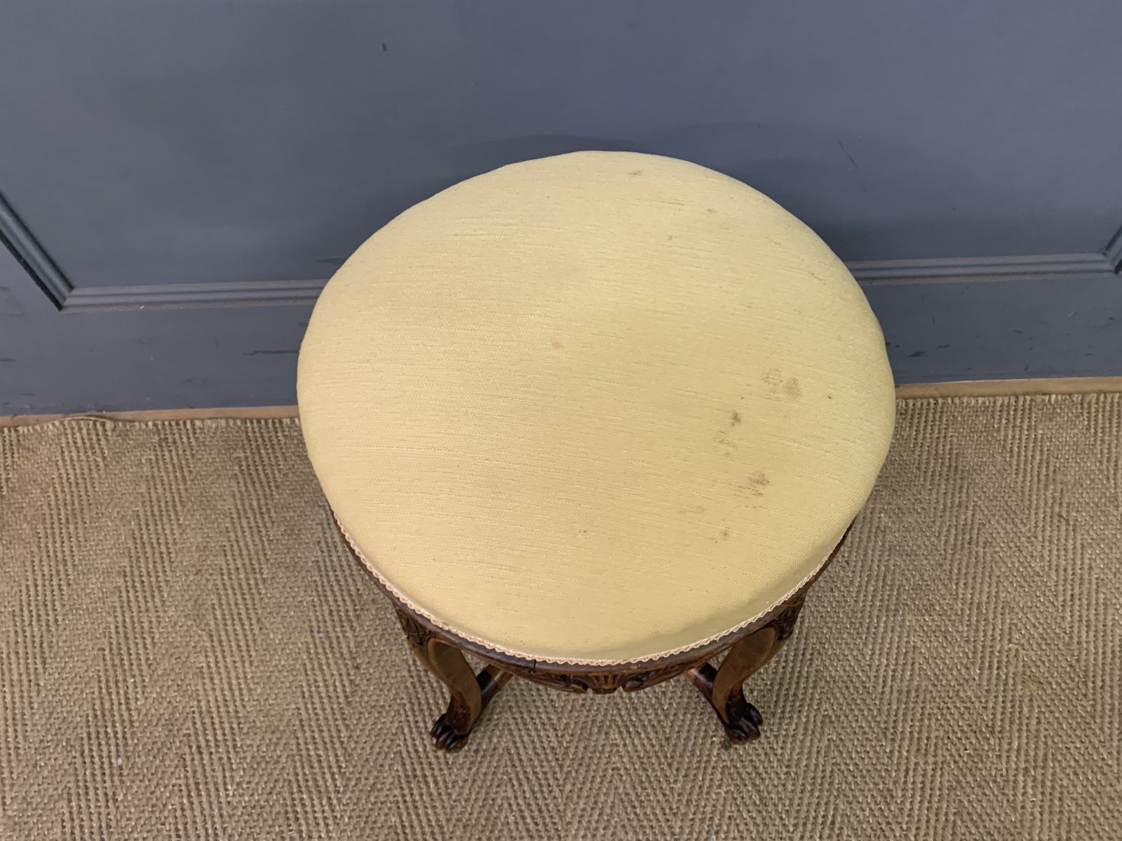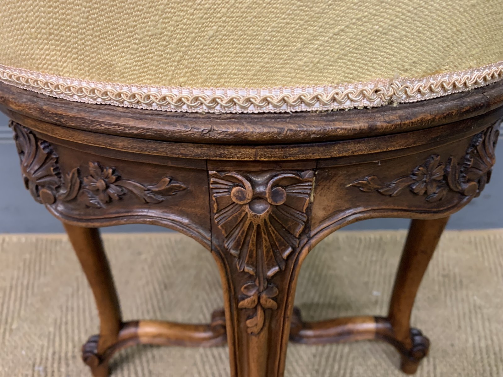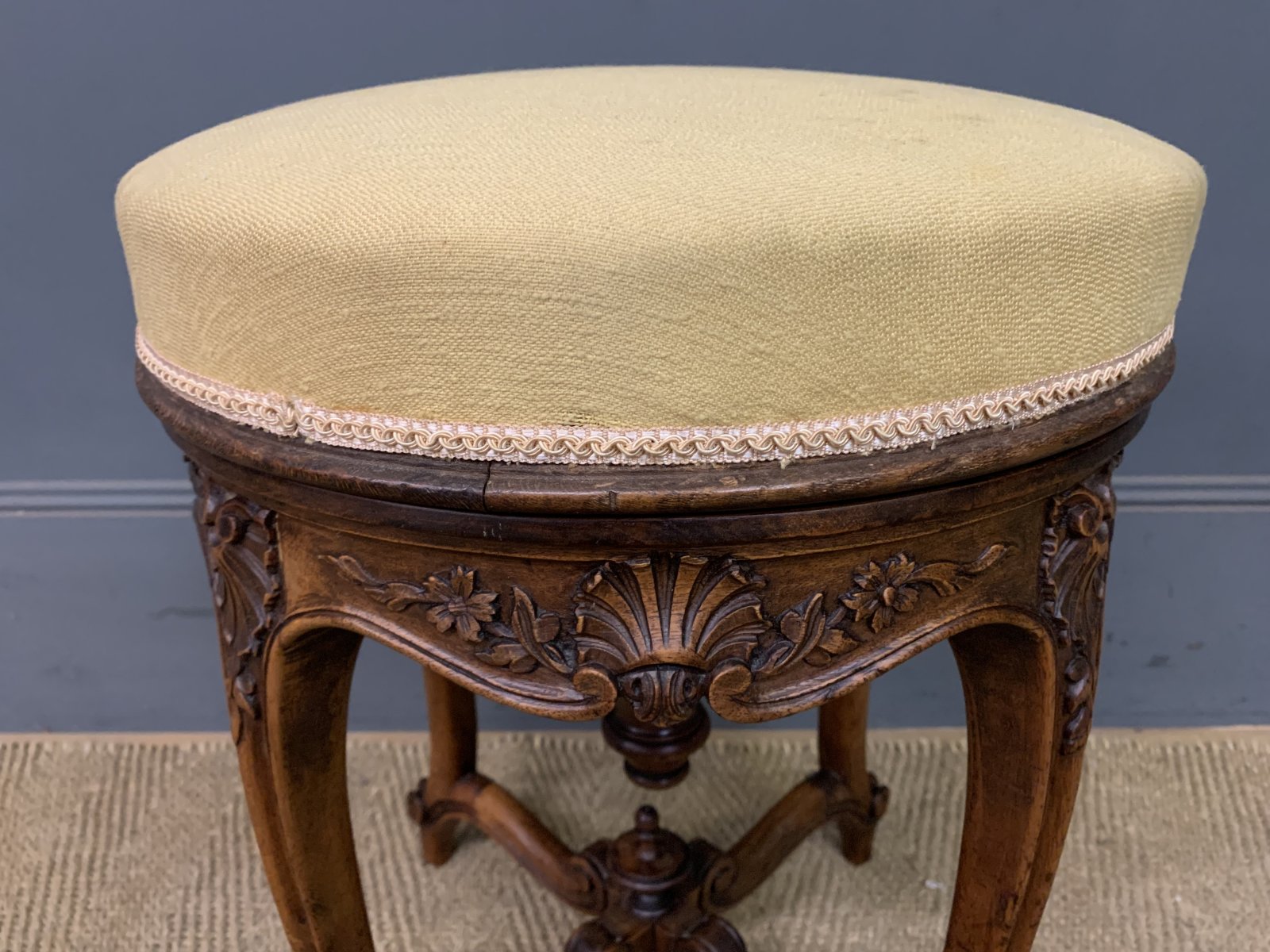 See shipping detailsA charming 19th century French walnut piano stool. With a rotating top making it adjustable in height. With a lovely frame in solid walnut with crisply carved decorations, The cabriole legs are united by under-stretchers giving extra strength and stability. Cleaned and waxed in our workshops and now offered for sale in very good condition with a good colour. Some historic marks to the fabric.