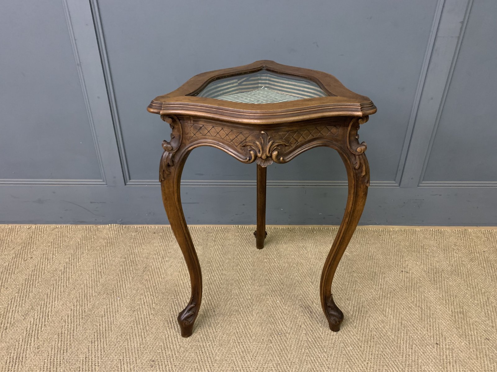 A charming late 19th century French bijouterie table. Well constructed in solid walnut and decorated with crisply carved detailings throughout. Of triangular shape and standing on elegant cabriole legs. With a glazed top that opens to access display space with original lining (some marks to this). Cleaned and waxed in our workshops and offered for sale in very good original condition.