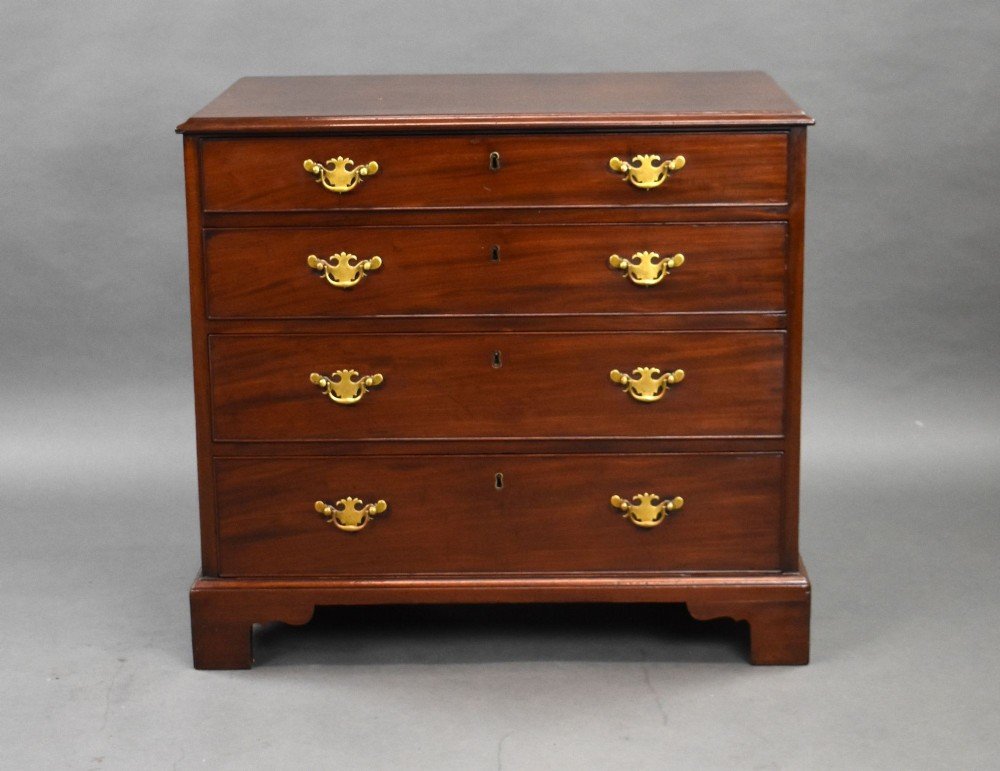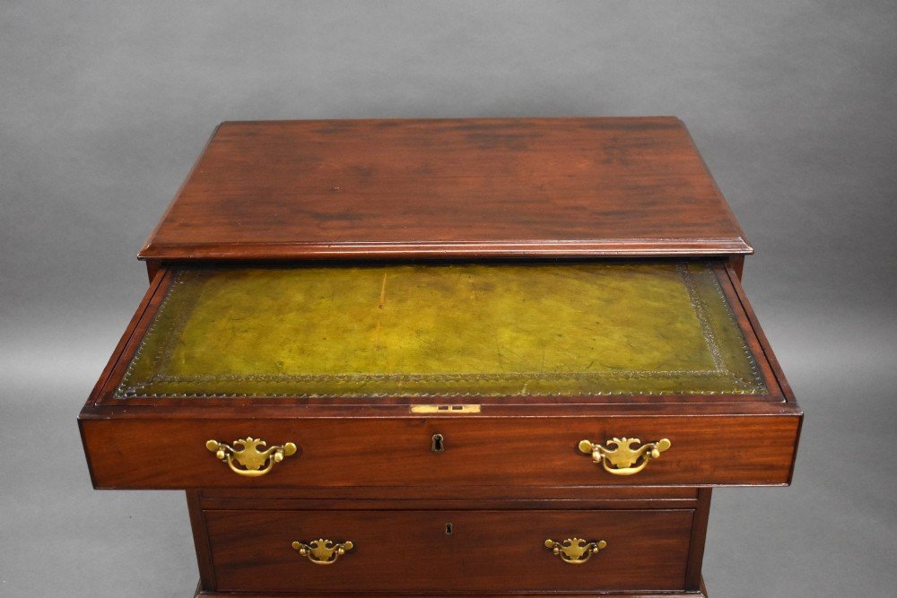 For sale is a good quality George II mahogany dressing chest of drawers, with four graduated oak lined drawers, the uppermost fitted with a leather mounted slide and internal divisions, with a revolving stationary compartment to the side, raised on bracket feet, this piece remains in excellent condition for its age.