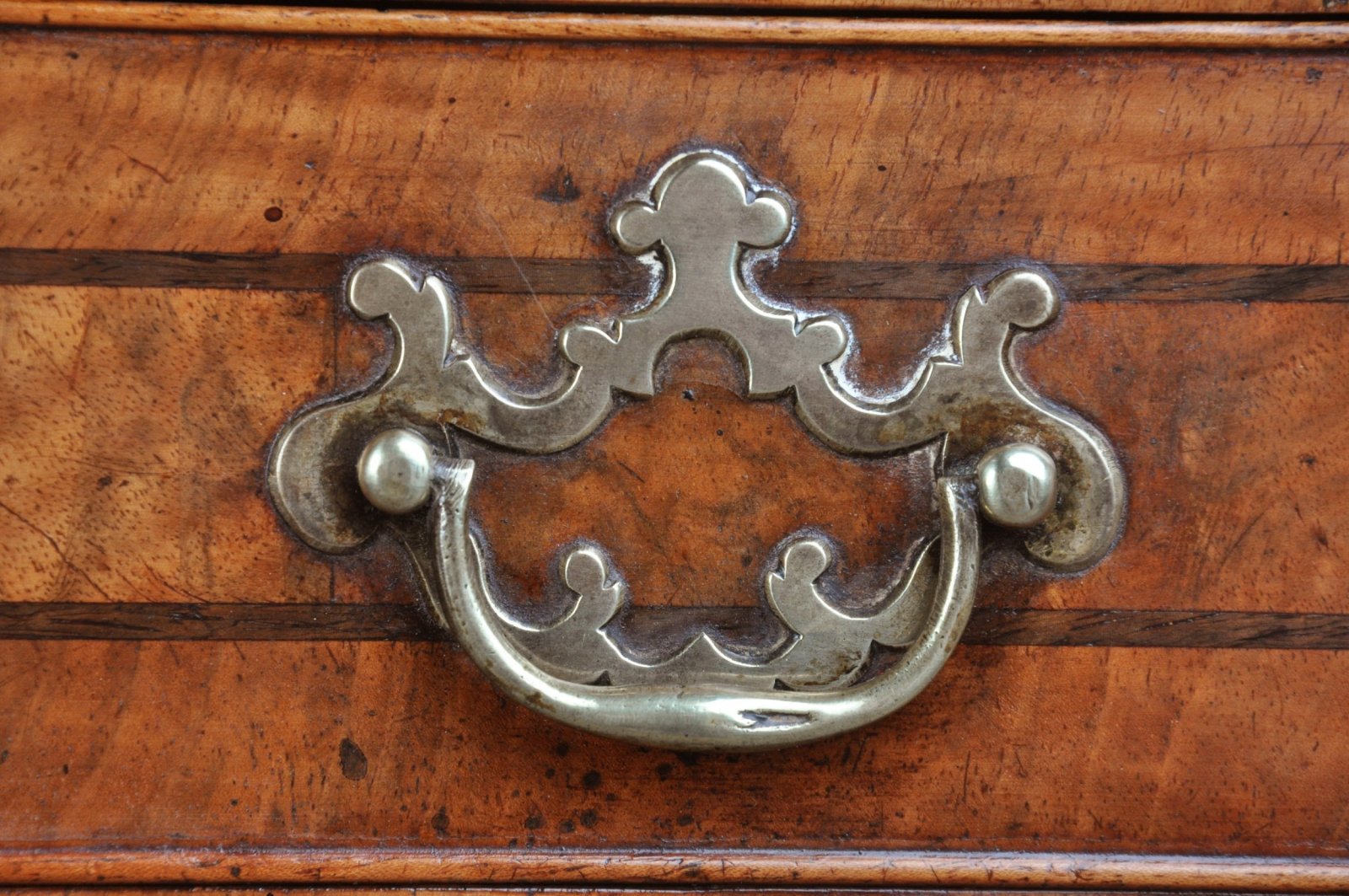 A Fine 18th Century George II Figured Walnut Kneehole Desk of rich honey colour with brushing slide. The quarter veneered top with rosewood stringing, cross banding and ogee cross grain mouldings. The drawer fronts also having rosewood stringing and cross banding matching the central door. The Desk is in remarkably original condition retaining the original handles and locks, it has very good clean original oak drawer linings with the drawer fronts veneered on pine.