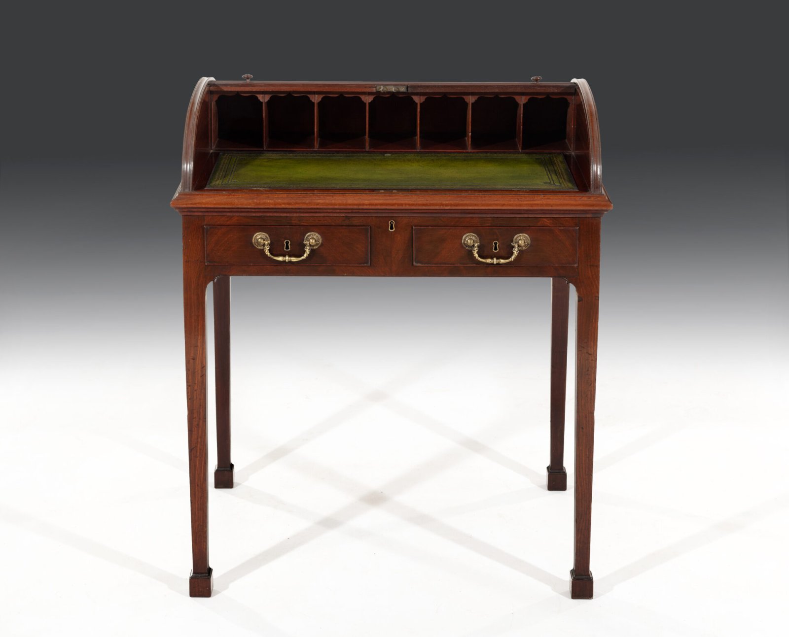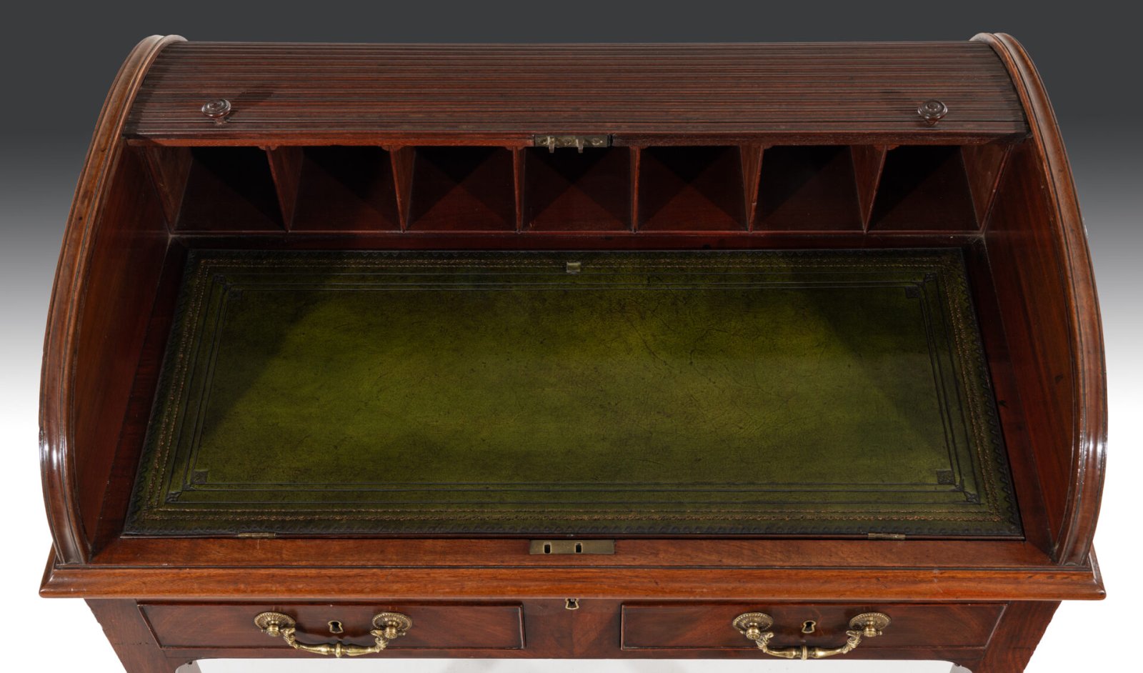 The cylinder shaped tambour top opens to reveal seven divided pigeon holes behind a British racing green leather lined writing surface. The writing surface has been blind tooled and with a broken gilt tooling to contrast the leather lined top. The writing surface is ratcheted so will adjust if needed and is fitted to a solid mahogany thumb nailed moulded edge.