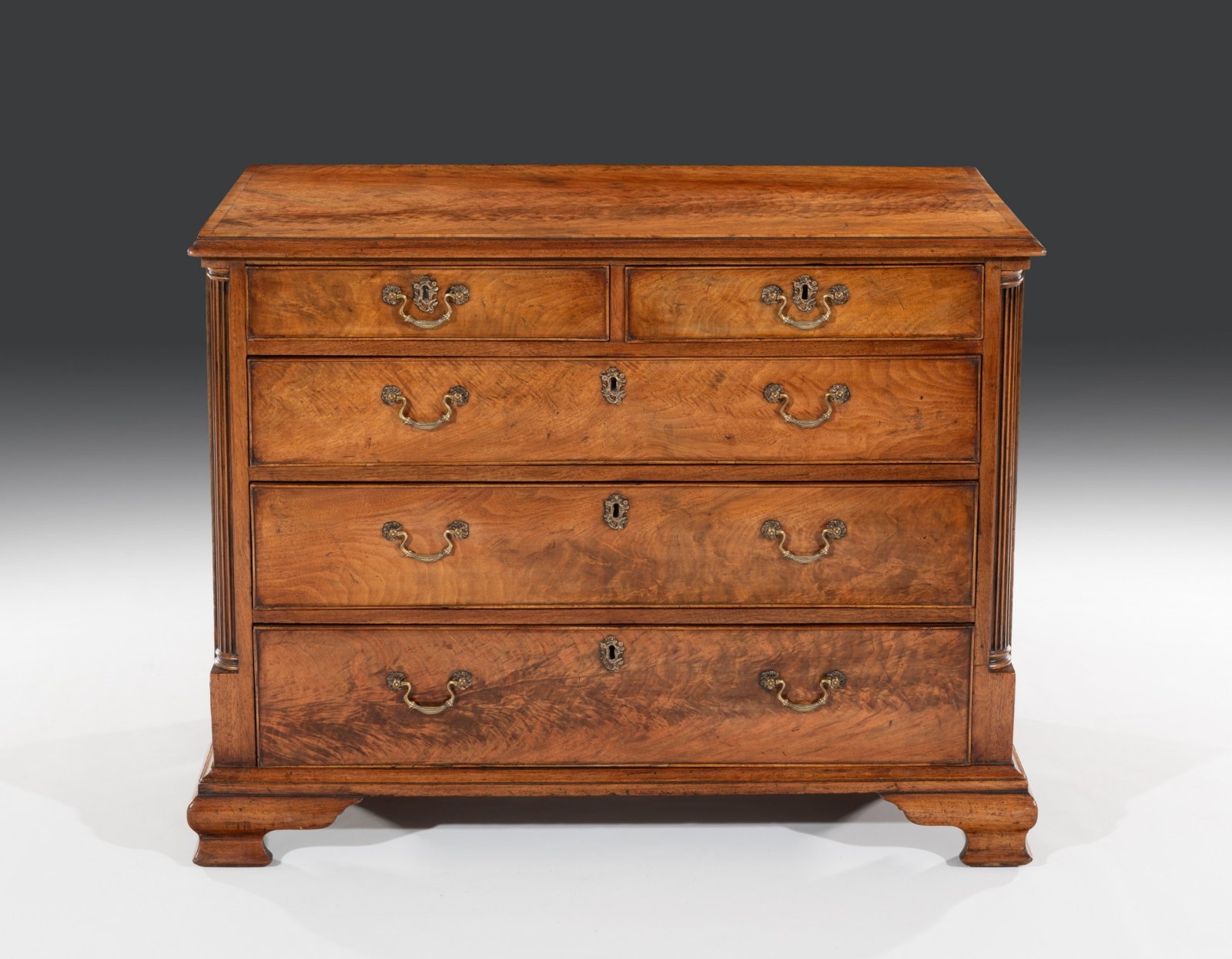 The highly figured walnut drawer fronts are fitted with the original gilt brass swan neck handles and escutcheons. The drawers with applied cockbeadings to the front and oak drawer linings are all in good working order.