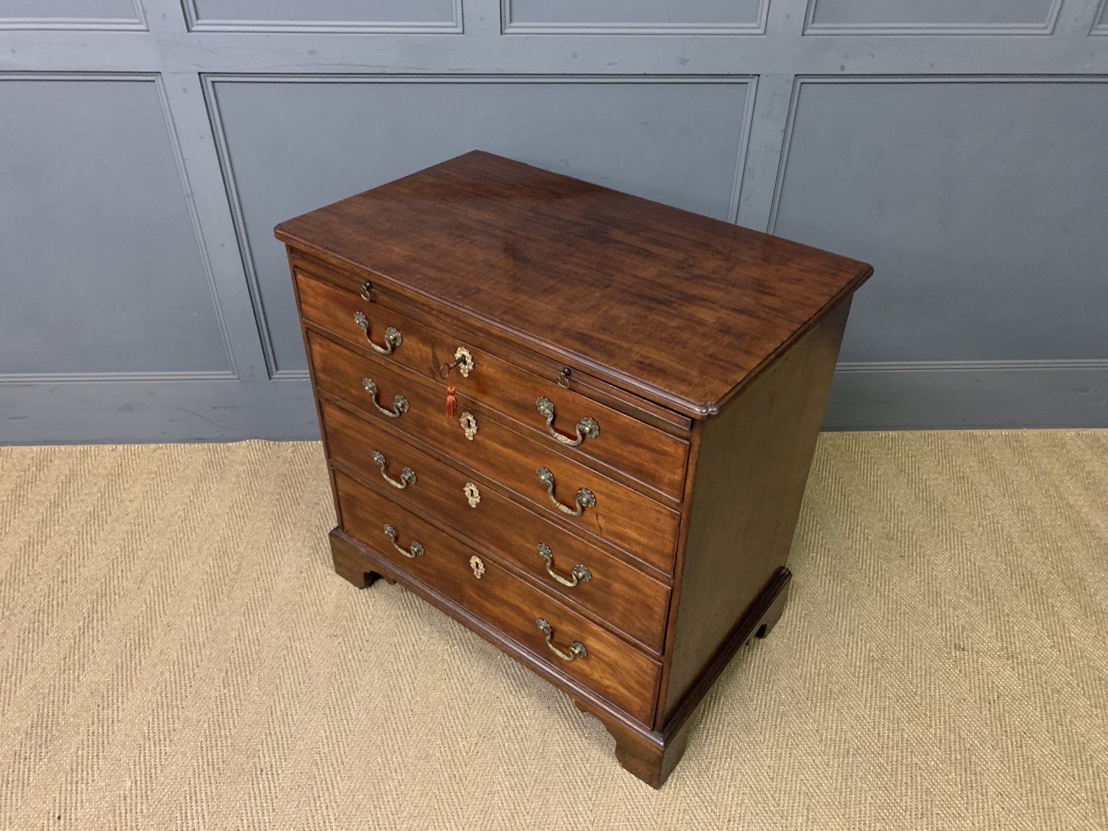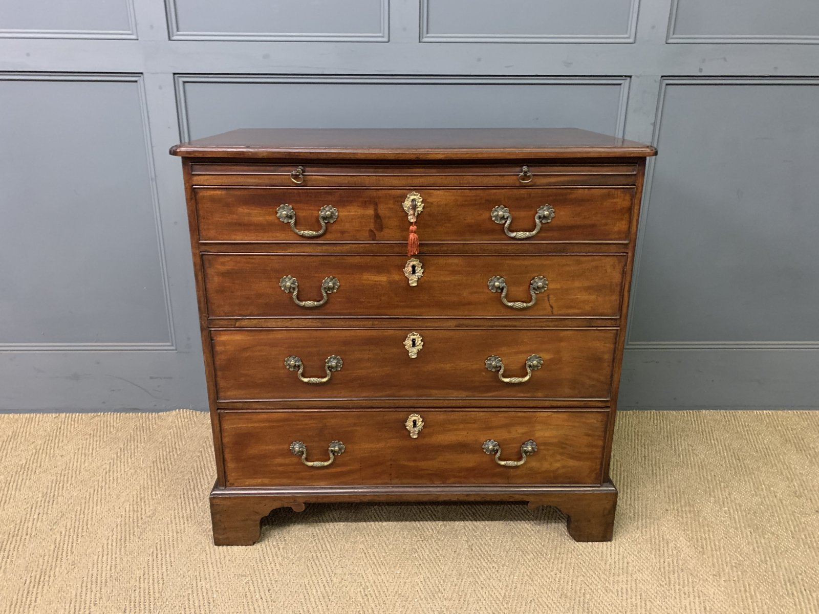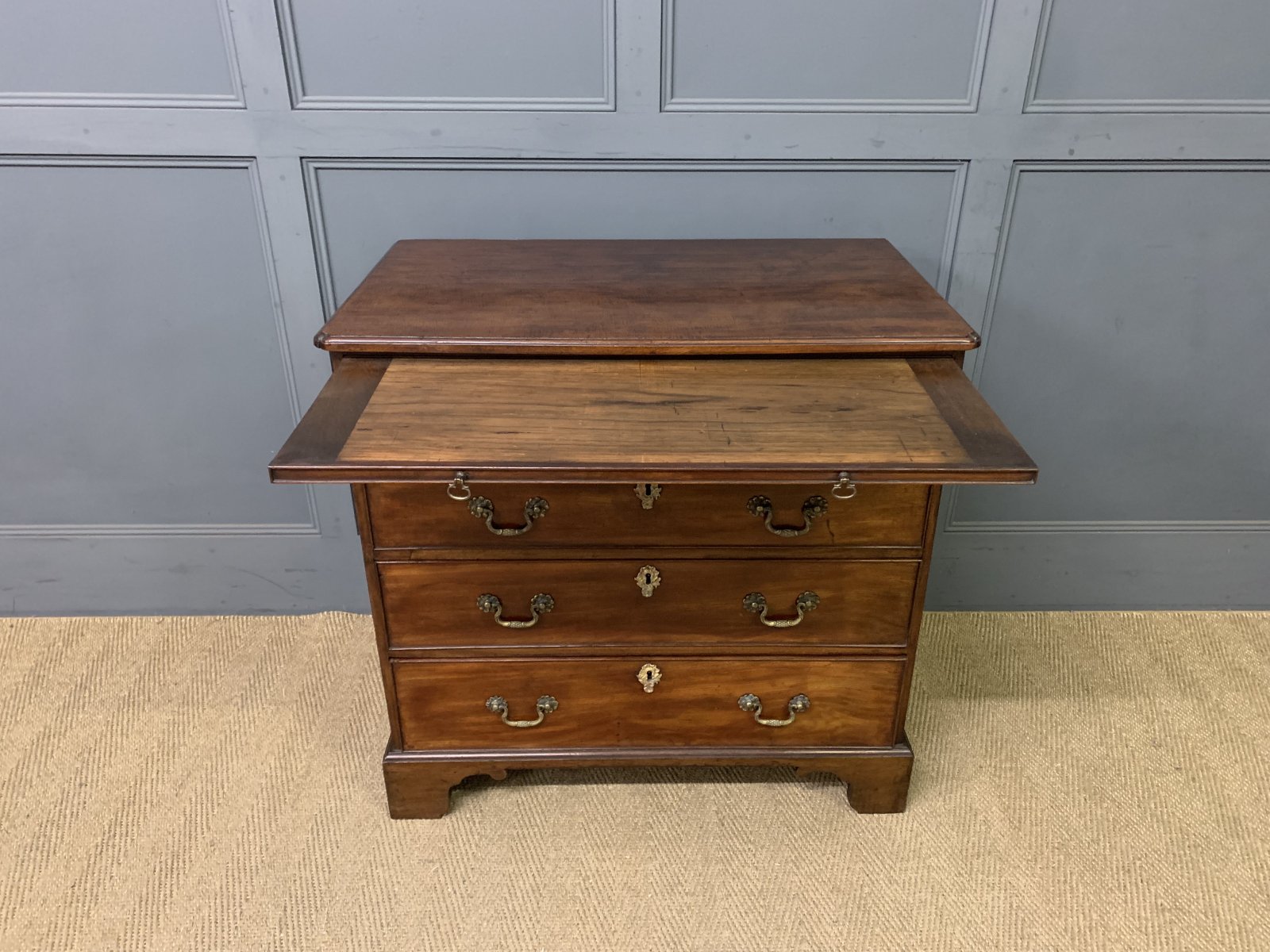 A splendid George III period mahogany bachelors chest of drawers. Of fine construction in beautifully figured mahogany. The top with shaped corners. Beneath is a brushing slide and 4 graduated drawers and all sitting on bracket feet. Original brass swan-neck handles and oak drawer linings. Original locks, working key suplied. Offered for sale in excellent condition with a great colour and patina.
