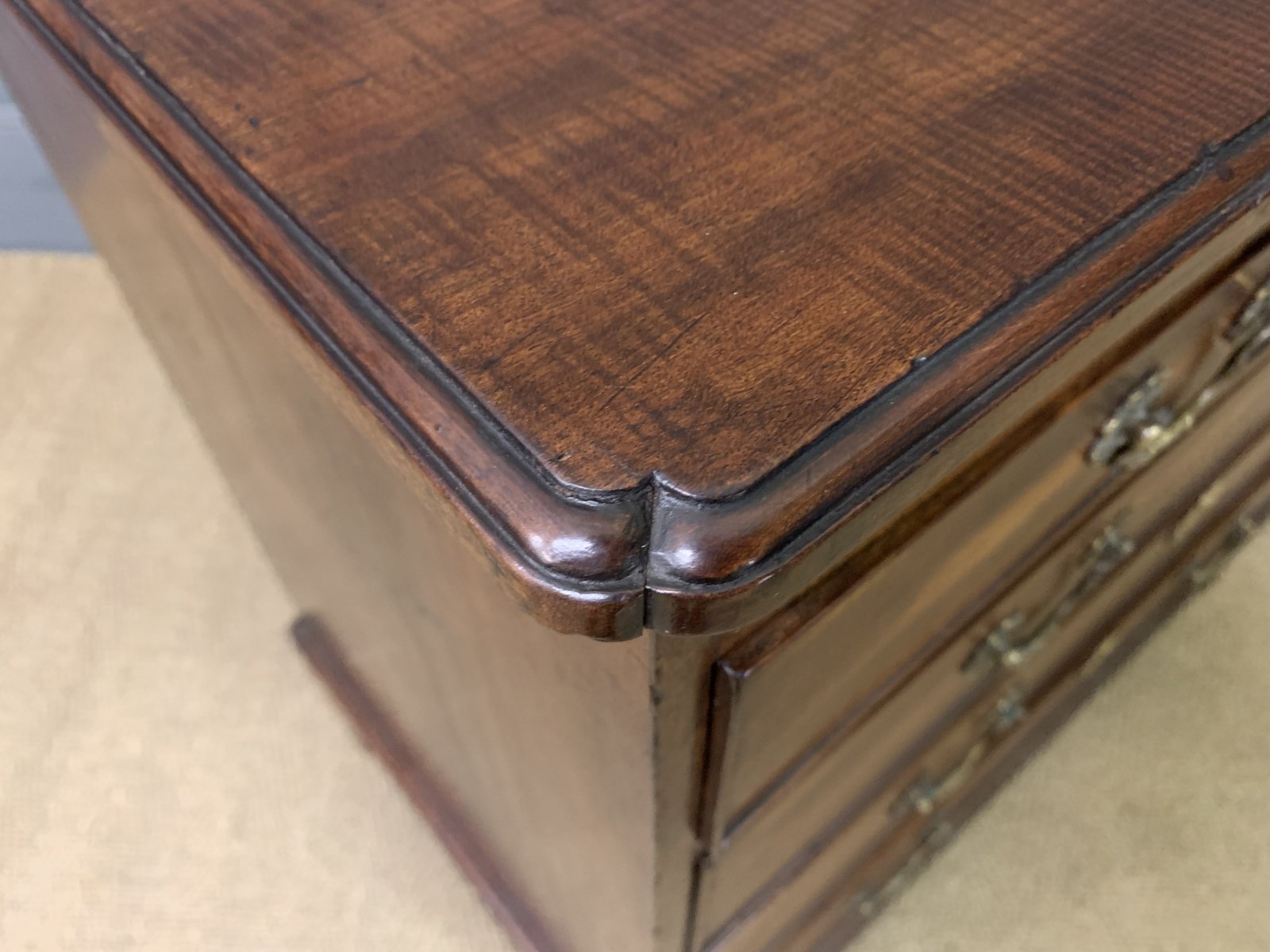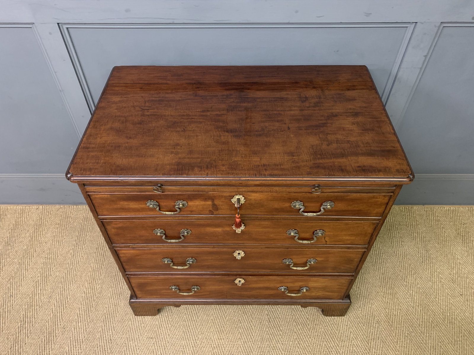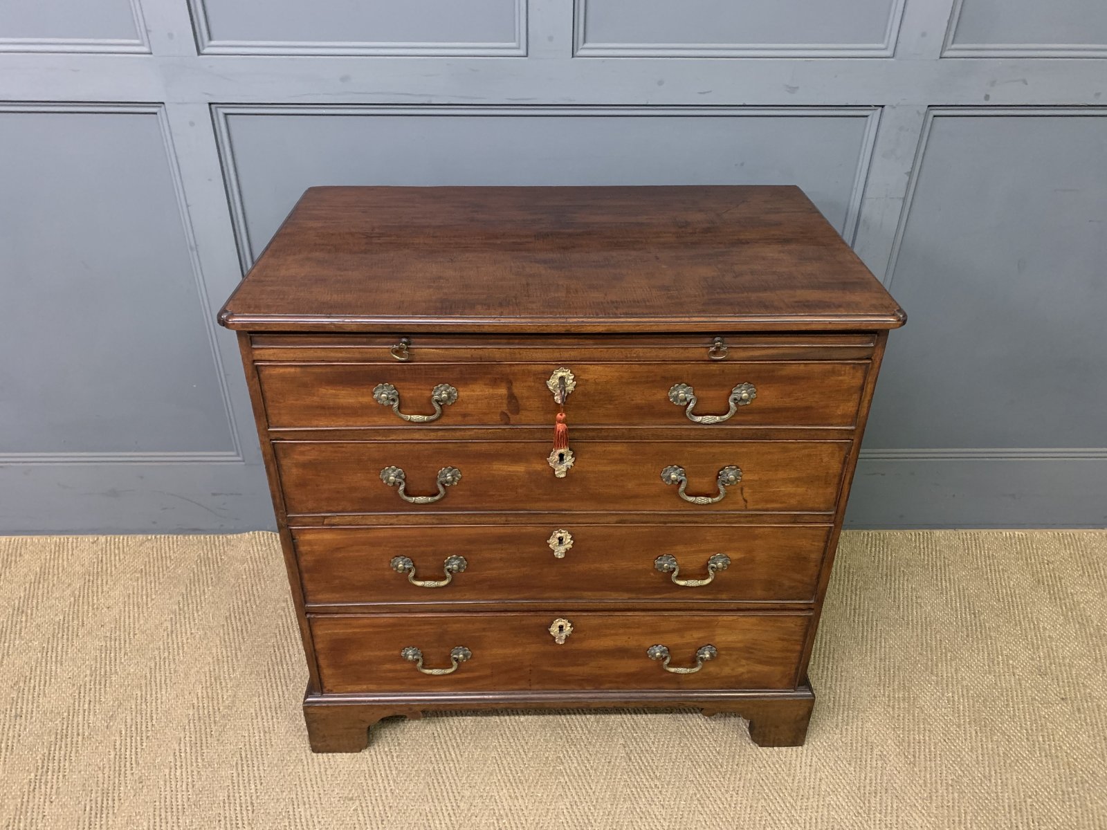 A splendid George III period mahogany bachelors chest of drawers. Of fine construction in beautifully figured mahogany. The top with shaped corners. Beneath is a brushing slide and 4 graduated drawers and all sitting on bracket feet. Original brass swan-neck handles and oak drawer linings. Original locks, working key suplied. Offered for sale in excellent condition with a great colour and patina.