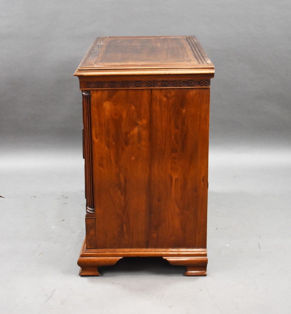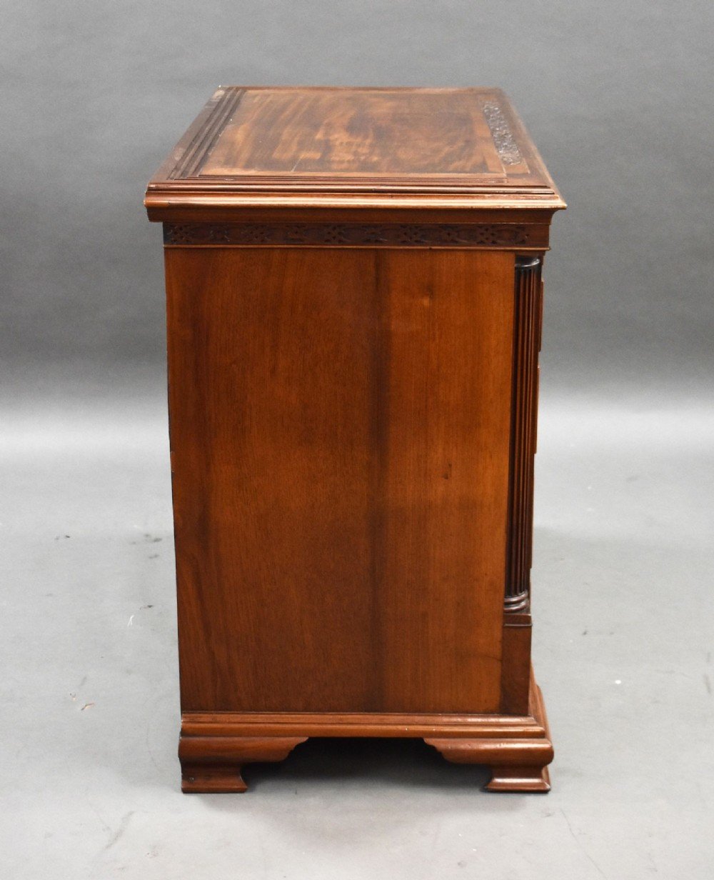 For sale is a good quality George III mahogany chest of drawers, of unusual form, having a brushing slide above two short over three long drawers, each with ornate brass handles, raised ogee bracket feet. The chest remains in very good condition, showing minor signs of wear commensurate with age and use.