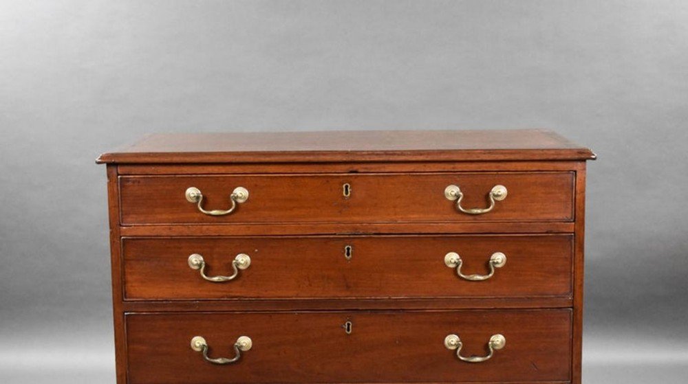 A classic George III period mahogany chest of drawers of well-balanced proportions and understated elegance. Comprising four full-width graduated drawers, each fitted with brass swan-neck handles and key escutcheons, the chest stands on shaped bracket feet and features a moulded edge to the top.