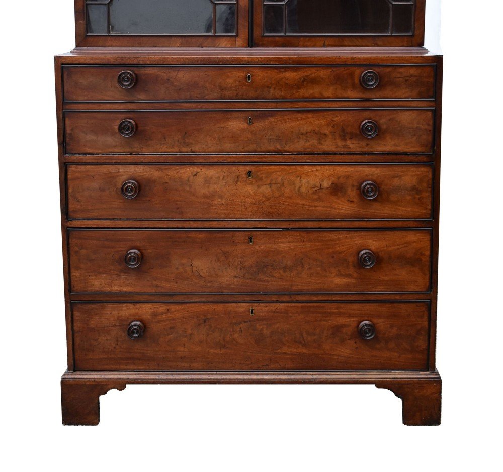 This is a classic example of Georgian craftsmanship, combining refined glazing, balanced proportions, and fine drawer construction in richly figured mahogany.