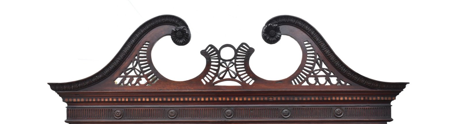 * Swan-neck pediment with carved rosettes and pierced fretwork