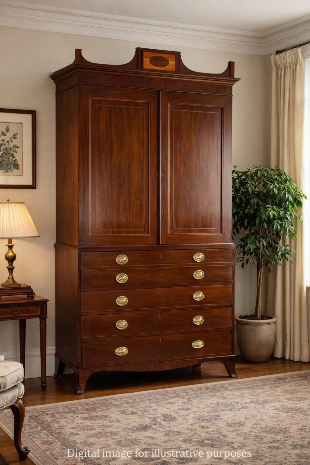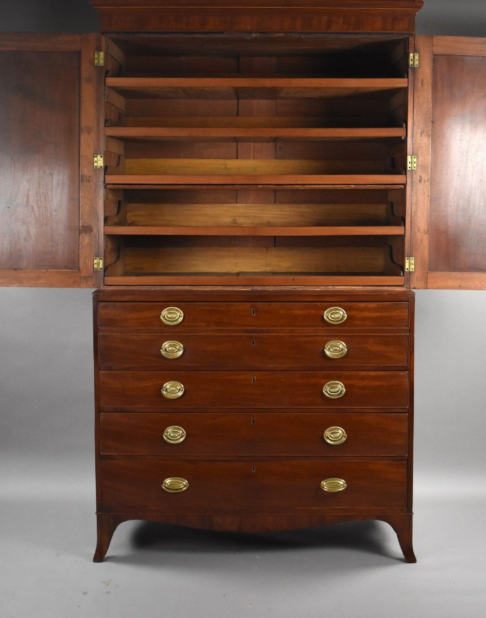 The upper section features a moulded cornice with central oval patera inlay above a pair of large panelled cupboard doors. Inside are a series of original sliding trays, traditionally used for linen storage. The lower section is fitted with a well-graduated arrangement of drawers retaining their attractive oval brass handles and working locks, all raised on neat splayed bracket feet with a gently shaped apron.
