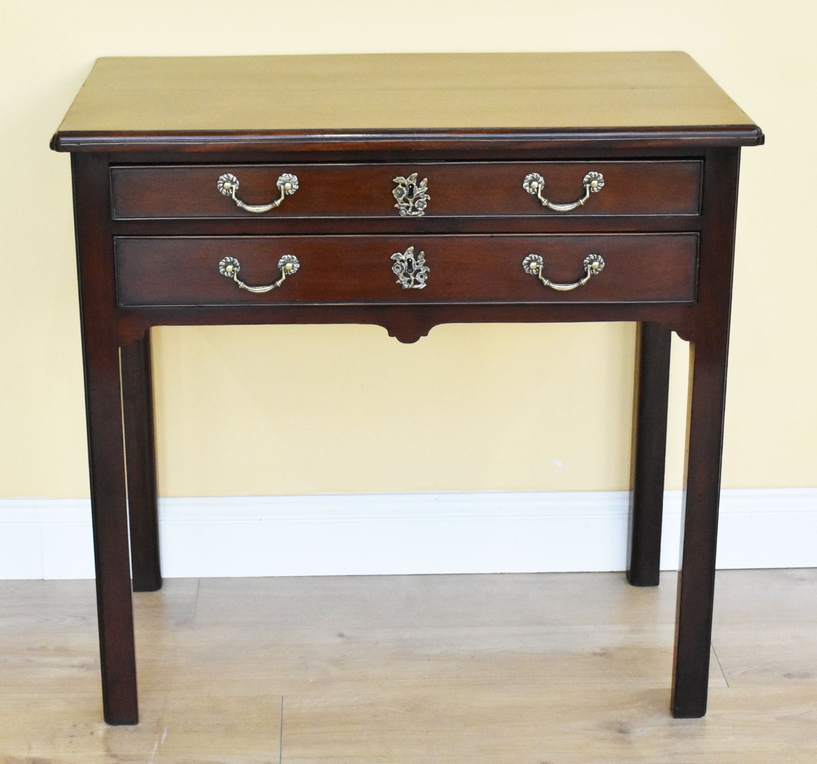 For sale is a fine quality George III Mahogany Two Drawer Side Table. Each drawer is oak lined and has ornate brass handles and escutcheons, standing on square legs, the table is in very good condition having been re-finished by hand. The top shows signs of age related shrinkage, though this has been restored to a high standard.