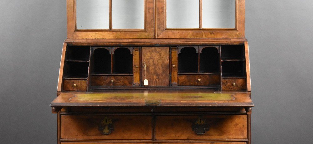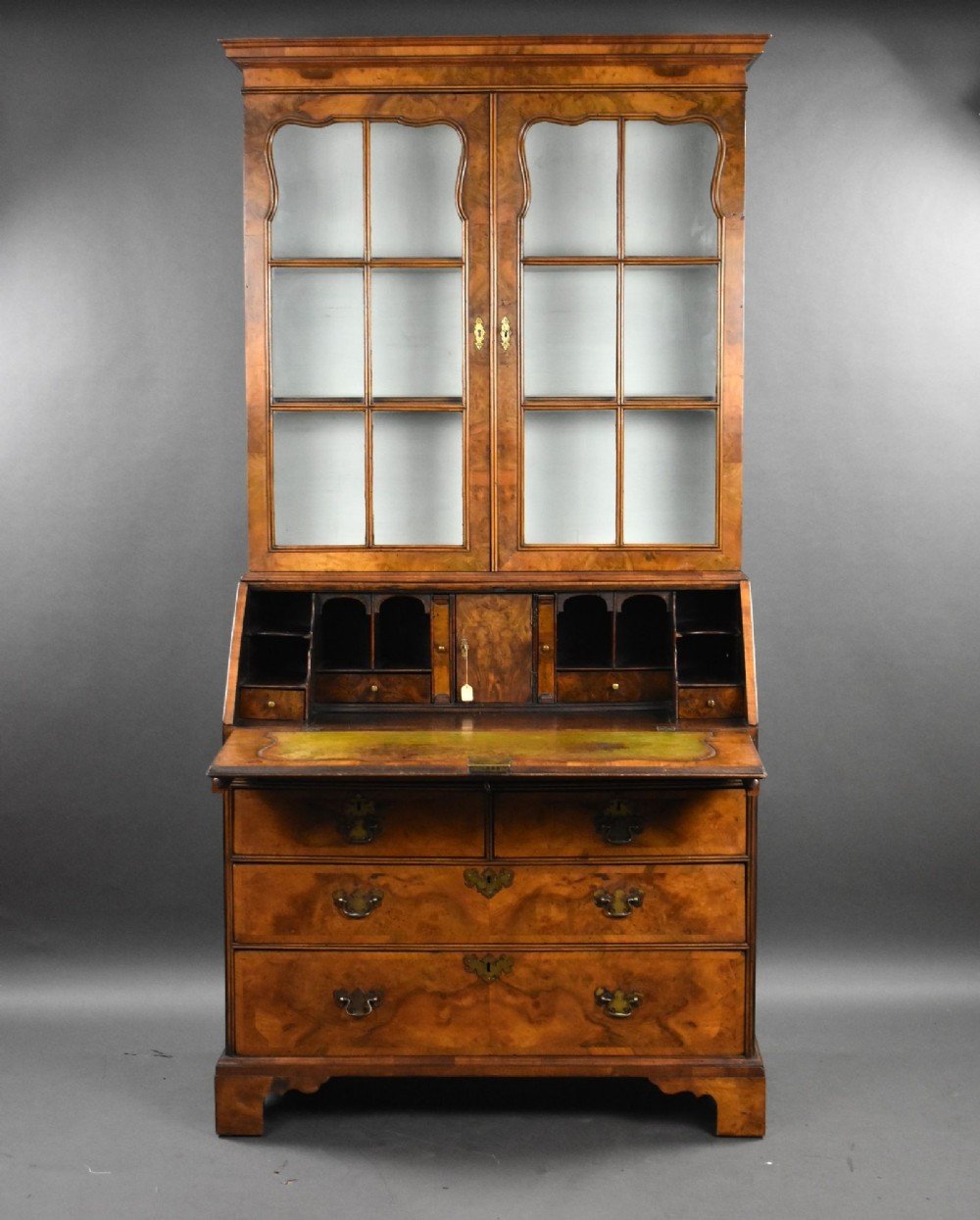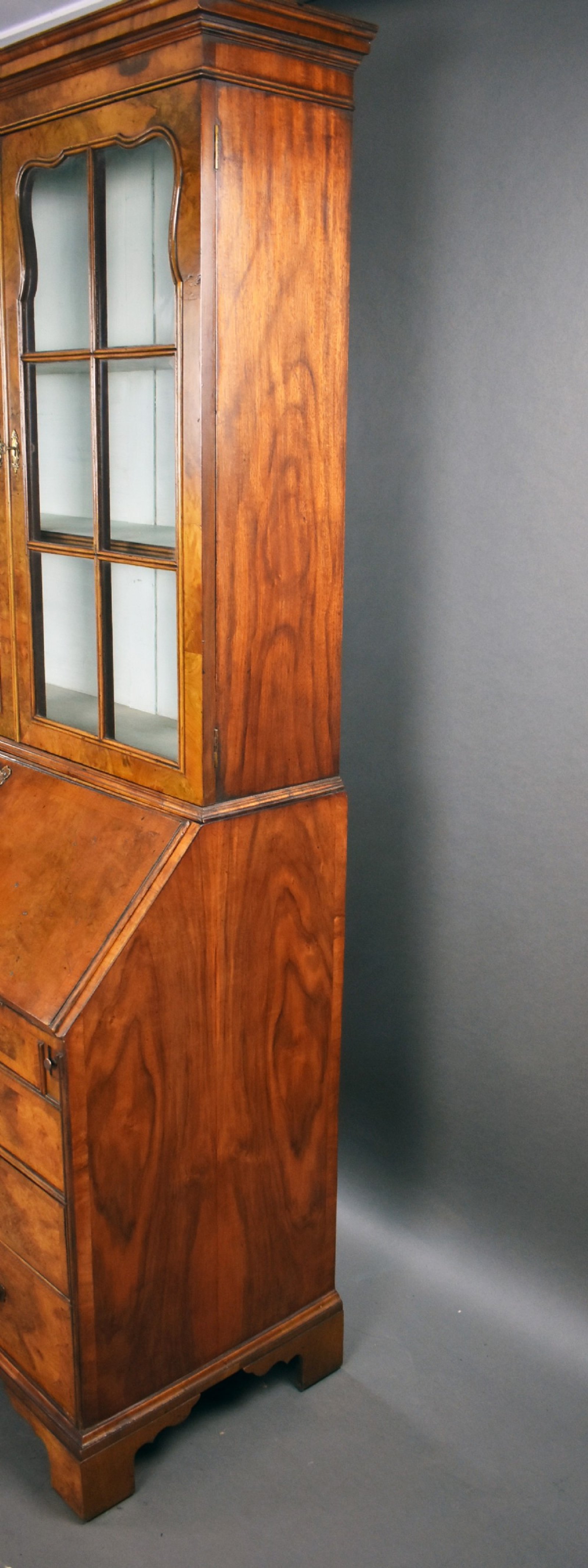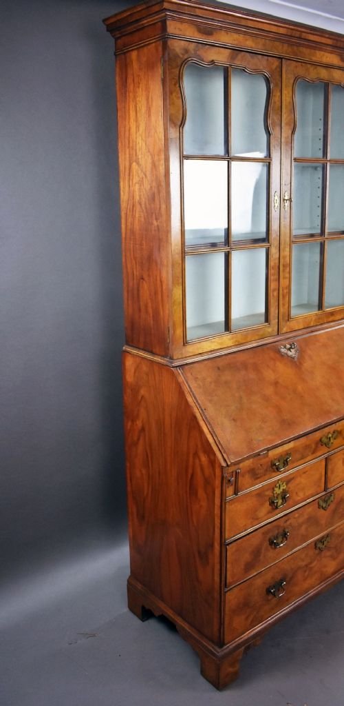 George III Bureau bookcase and later ( the top has been added later 20th Century) with glazed doors to the top enclosing two adjustable shelves, below the top when the fall is down the interior has pigeon holes drawers and a small cupboard to the centre. The base has two small drawers and to long drawers standing on bracket feet.