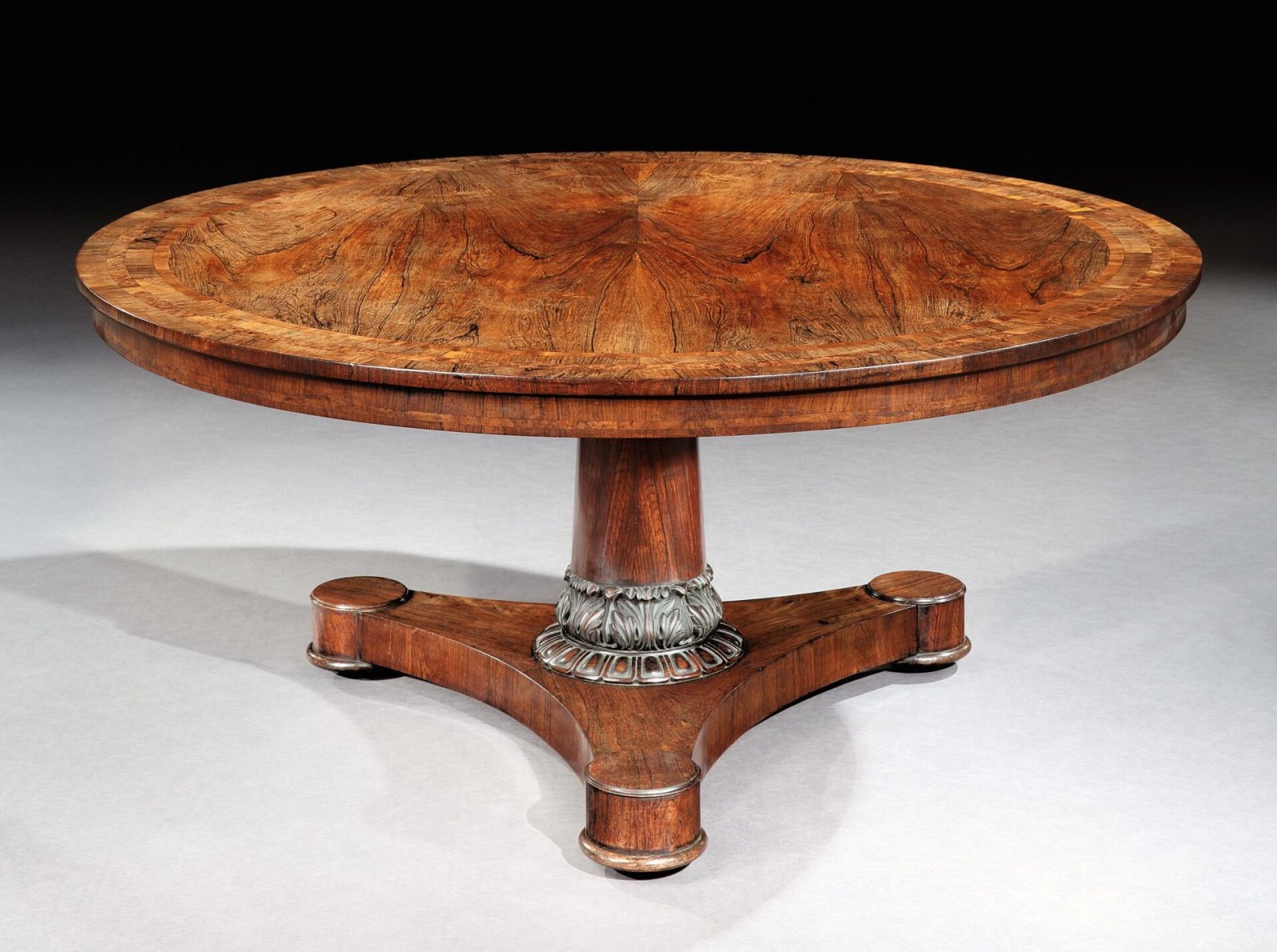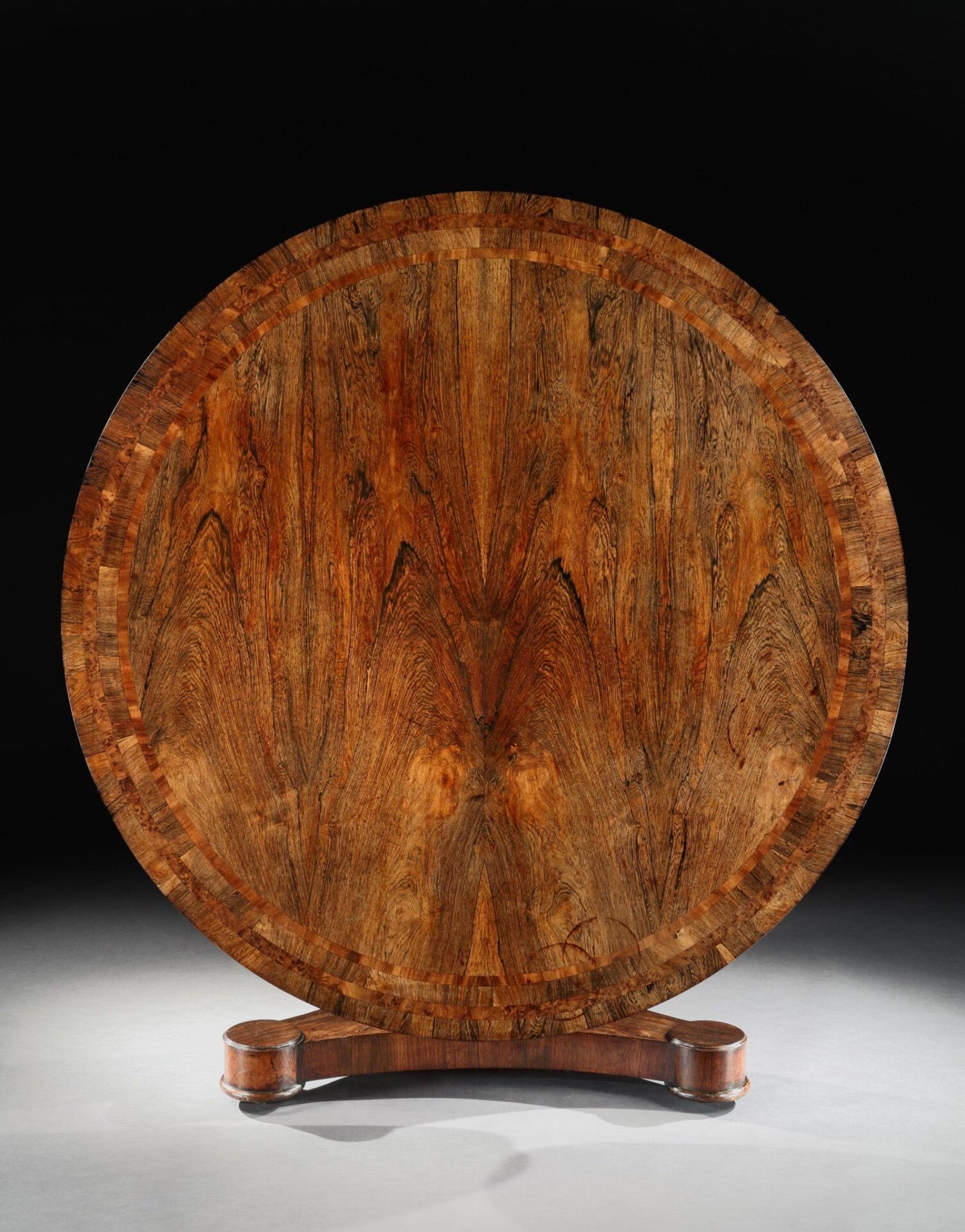 The 5ft diameter table will seat 8 people and is made with rosewood book matched veneers. The top is highly figured retaining aged patina and a mellow, golden rosewood colour. The inner crossbanding is tulip wood and the wider outer crossbanding is yew wood with lively rosewood bandings above a shallow frieze that is made with vertical rosewood cut veneers and a repeated crossbanded yew wood banding.