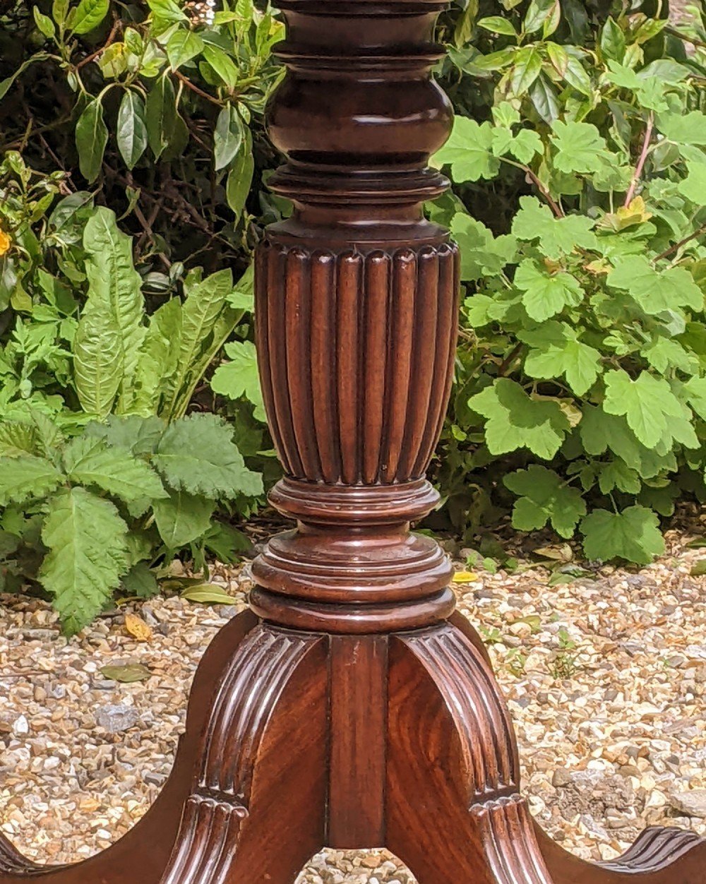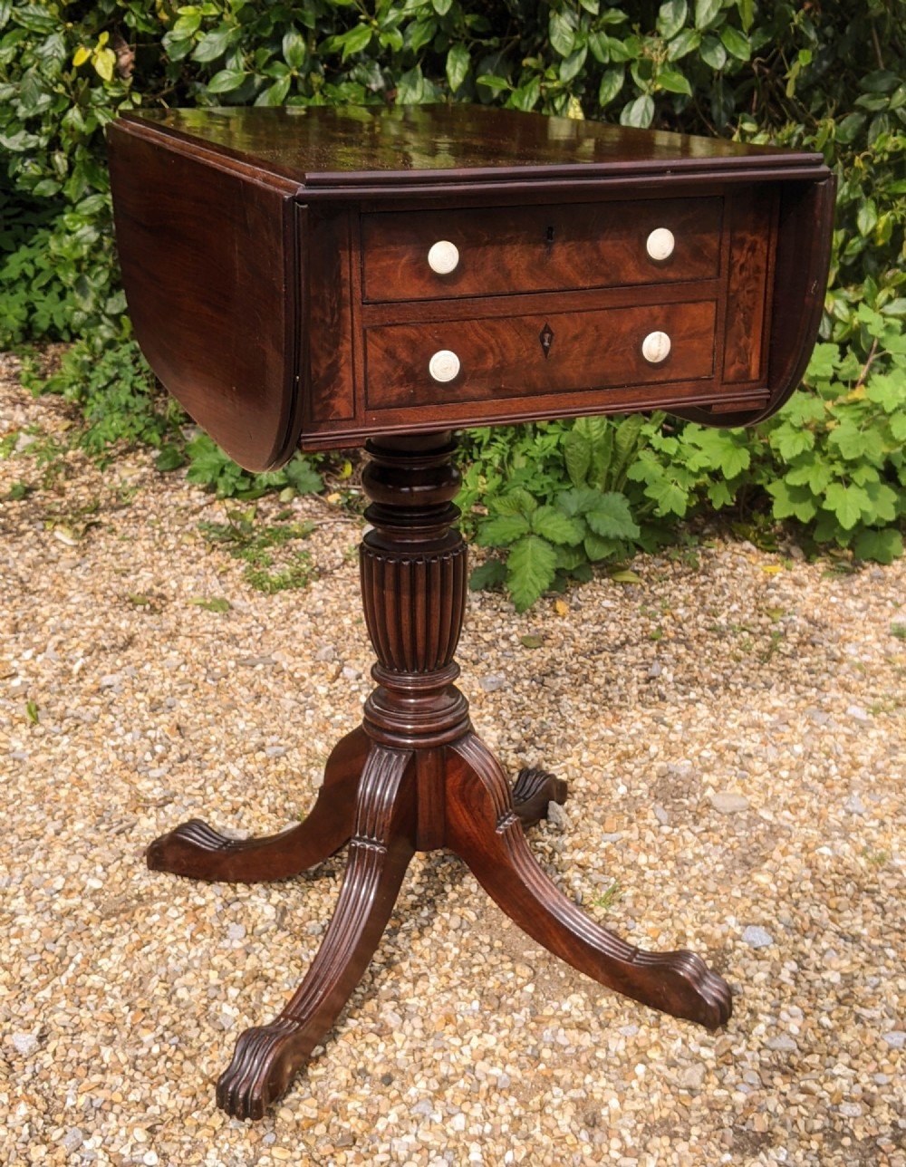 The table has a good colour and nice patina, with handsome tulip reeded column and outswept paw foot design tripod base raised on its original brass castors. Each end of the table has one long drawer that runs the full length of the piece with the other being a dummy drawer front. All have their original turned and reeded bone handles.