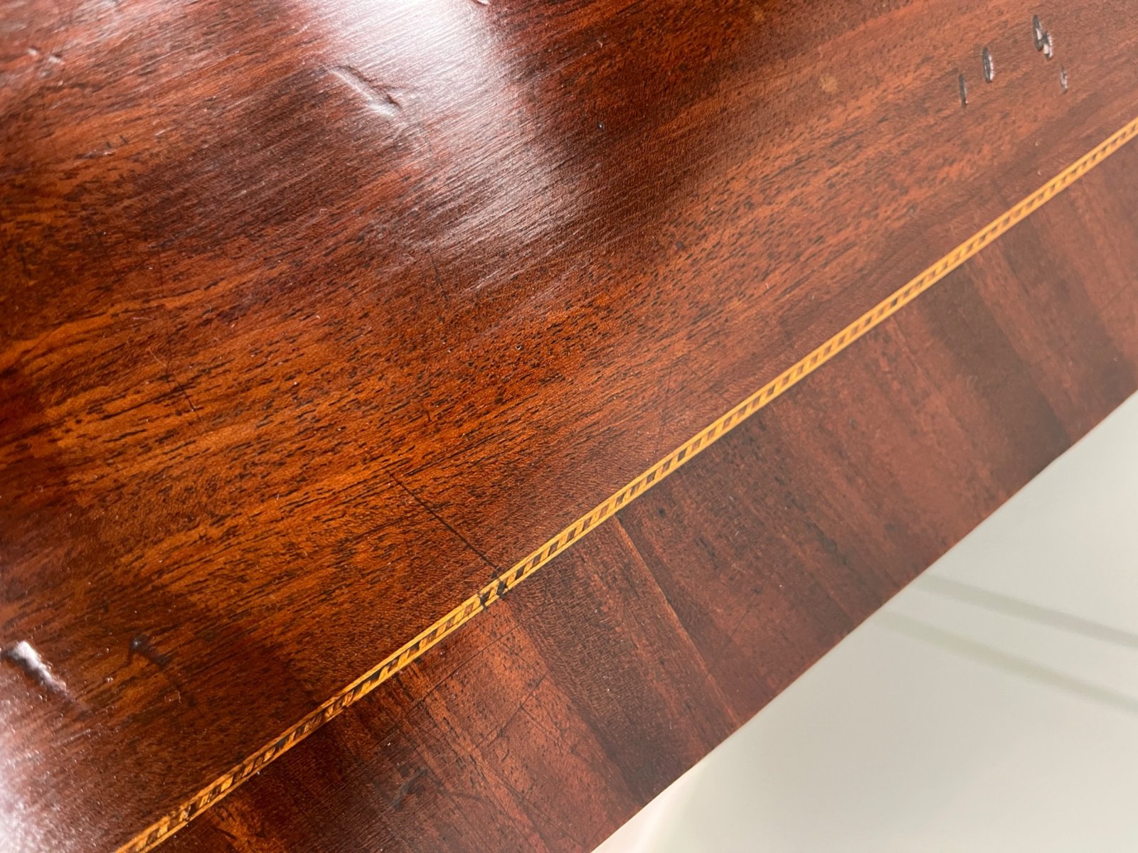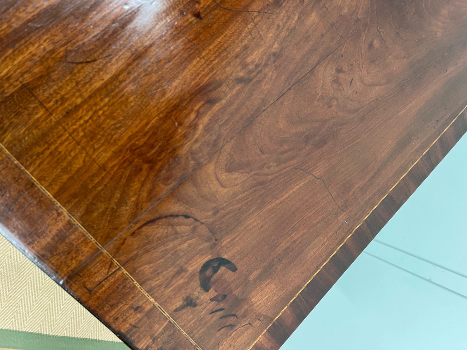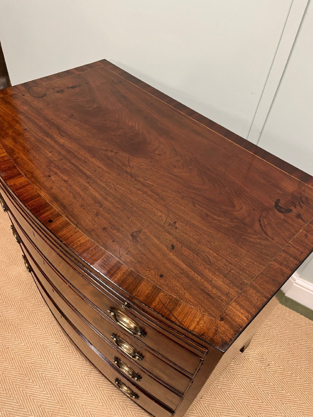 This is such a fabulous example of a late 18th century Georgian mahogany bow fronted chest of drawers with brushing slide. With a cross banded top and ebony and boxwood inlay. With beautiful original brass handles and great colour throughout.