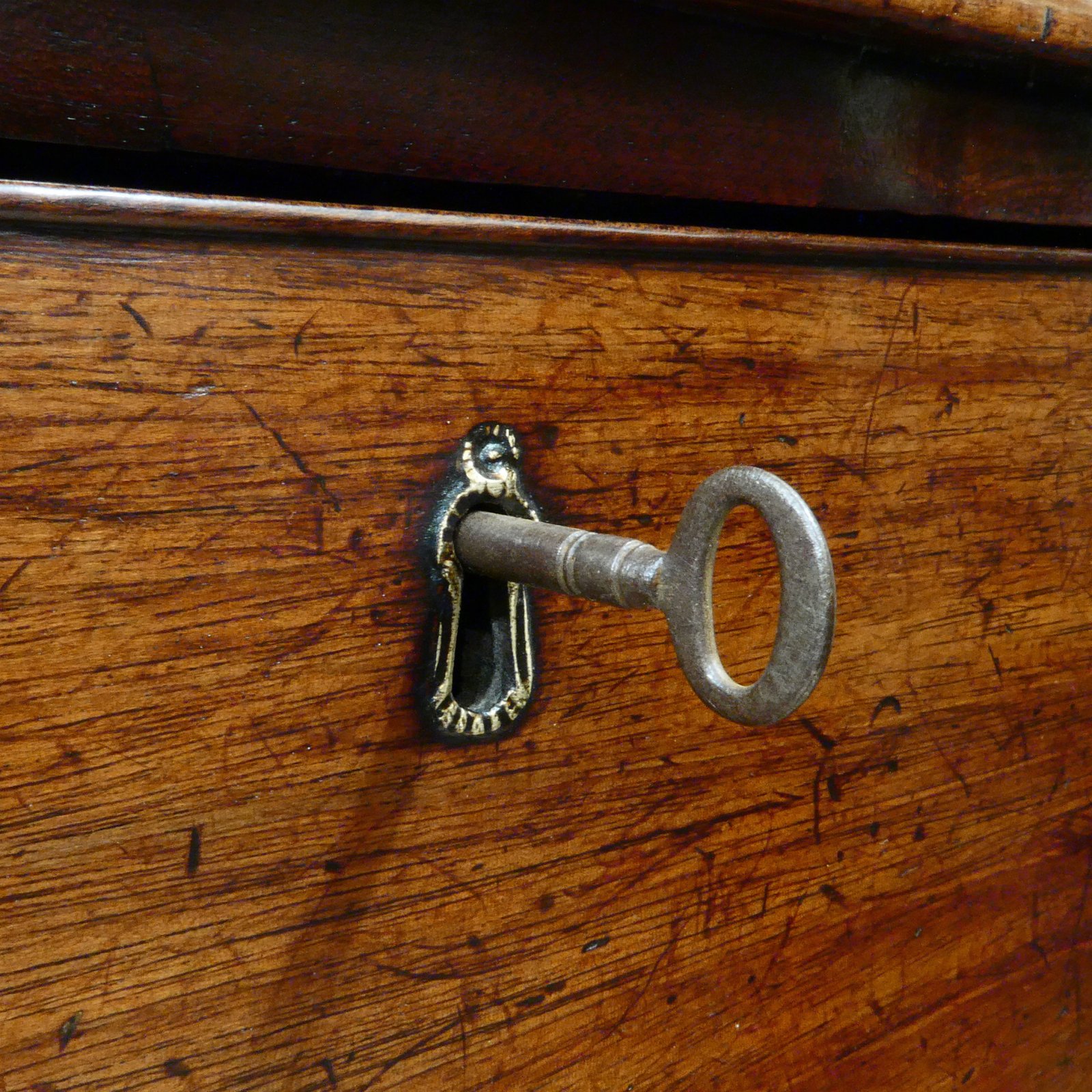The chest of drawers has moulding to the edge of the top and to the base, and it stands on shaped bracket feet. All the drawers are oak lined and run smoothly.